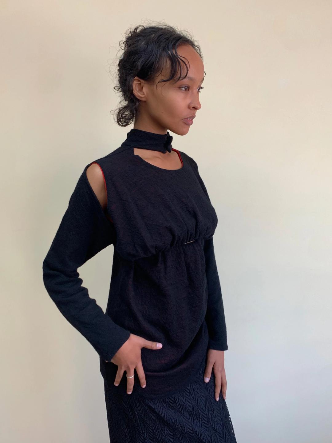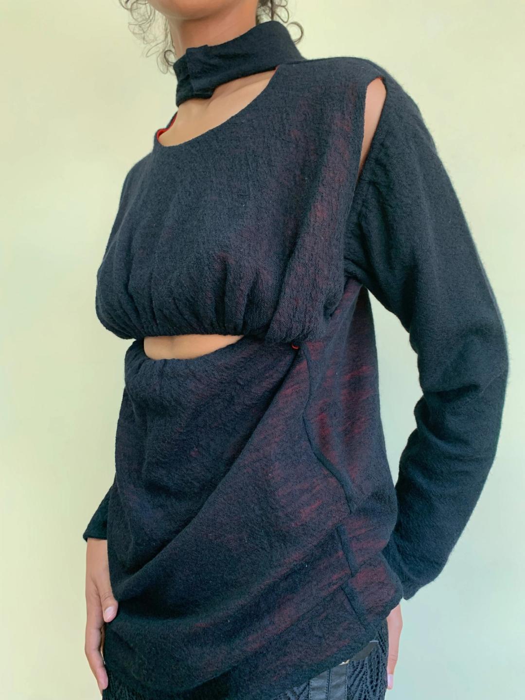 Rare 90s Atsuro Tayama top with a unique cutout design. The top is black with a bit of red poking through the woven material. The top has adjustable velcro at the neck and is elasticated around the midriff. The elastic allows the midriff to be exposed or not depending on how its worn. There are also cutouts on the shoulders.