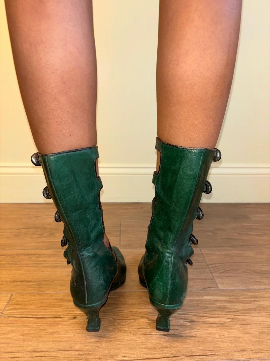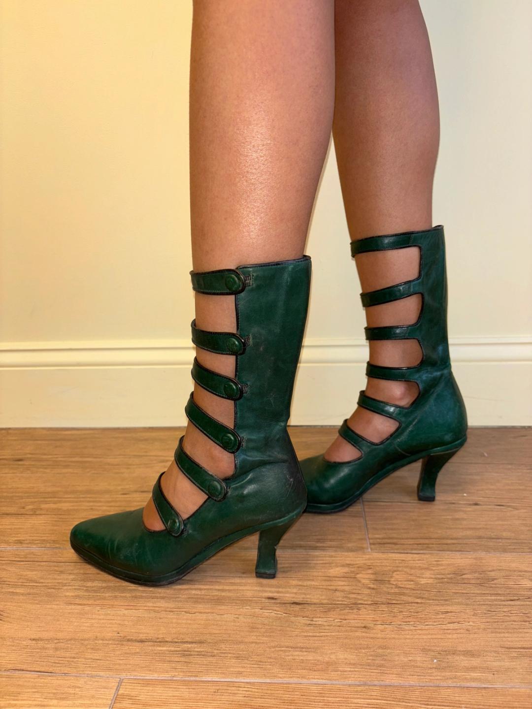 Chantal Thomass hunter green leather cutout heels from the 80s or 90s. The Edwardian inspired heels button up all the way and have a fabulous cutout design. They're marked a European size 37.