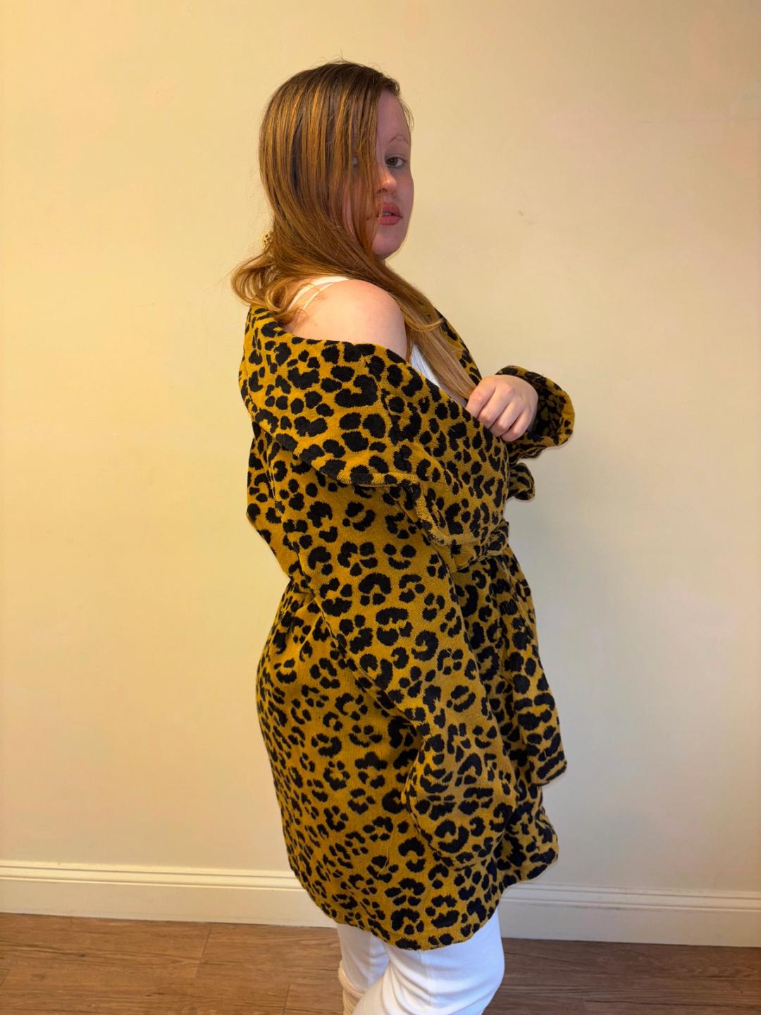 Terry cloth robe jacket by Chantal Thomass in graphic yellow and black colorway. The jacket has roomy pockets and an adjustable sash tie. It is in excellent vintage condition, with only some scattered snagging of the terry cloth fabric.