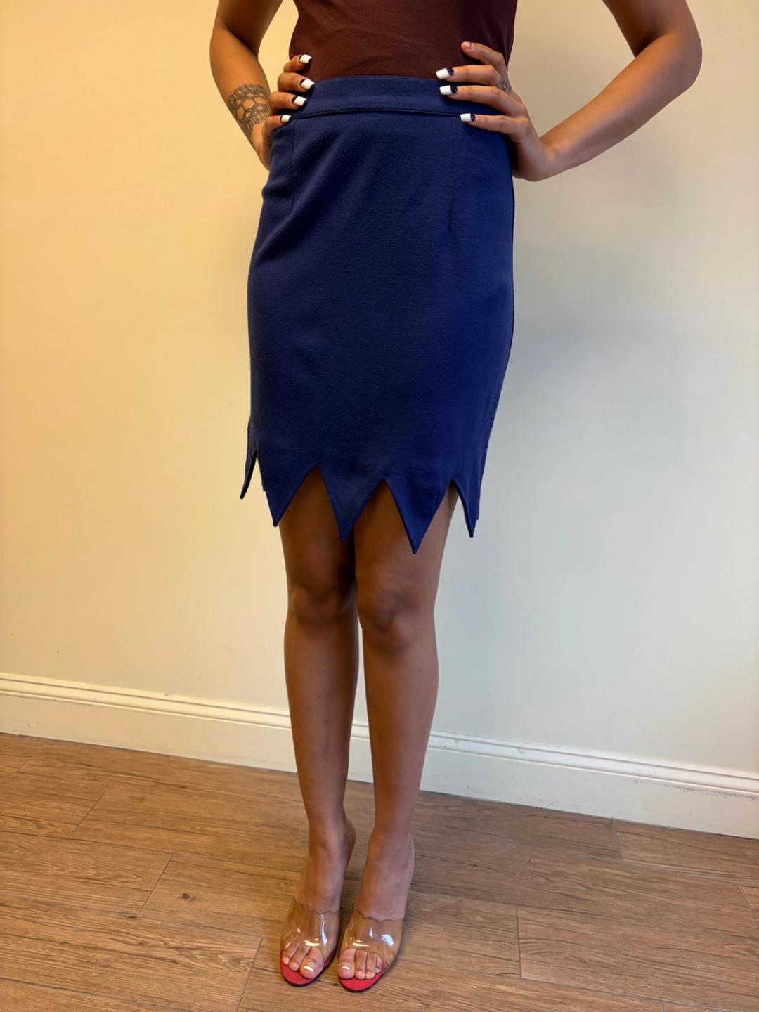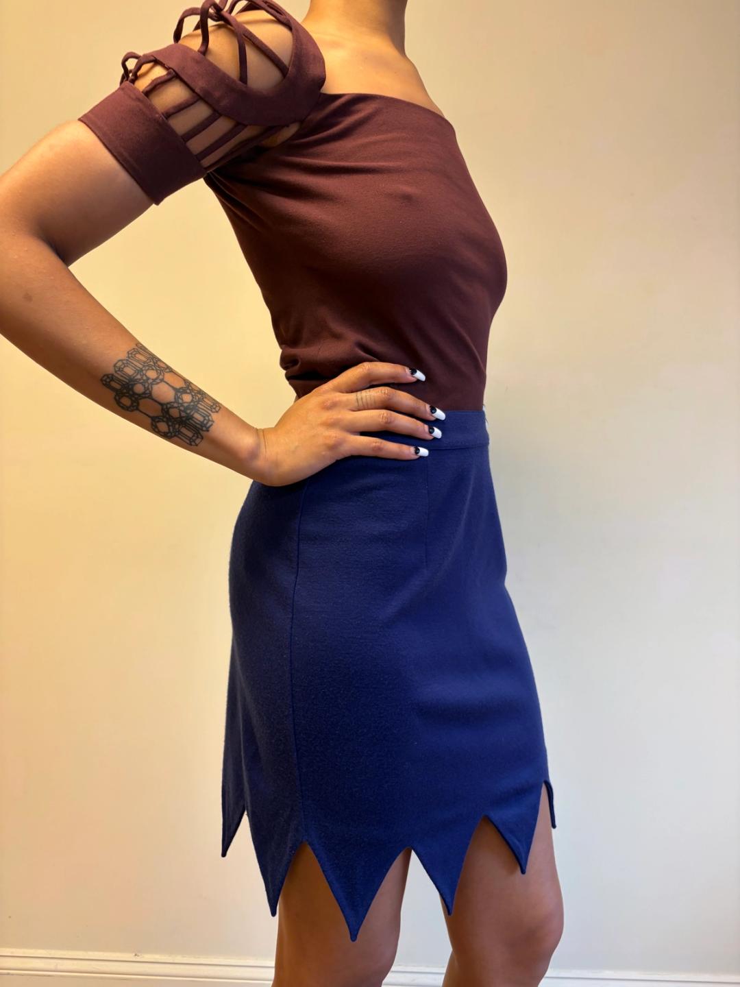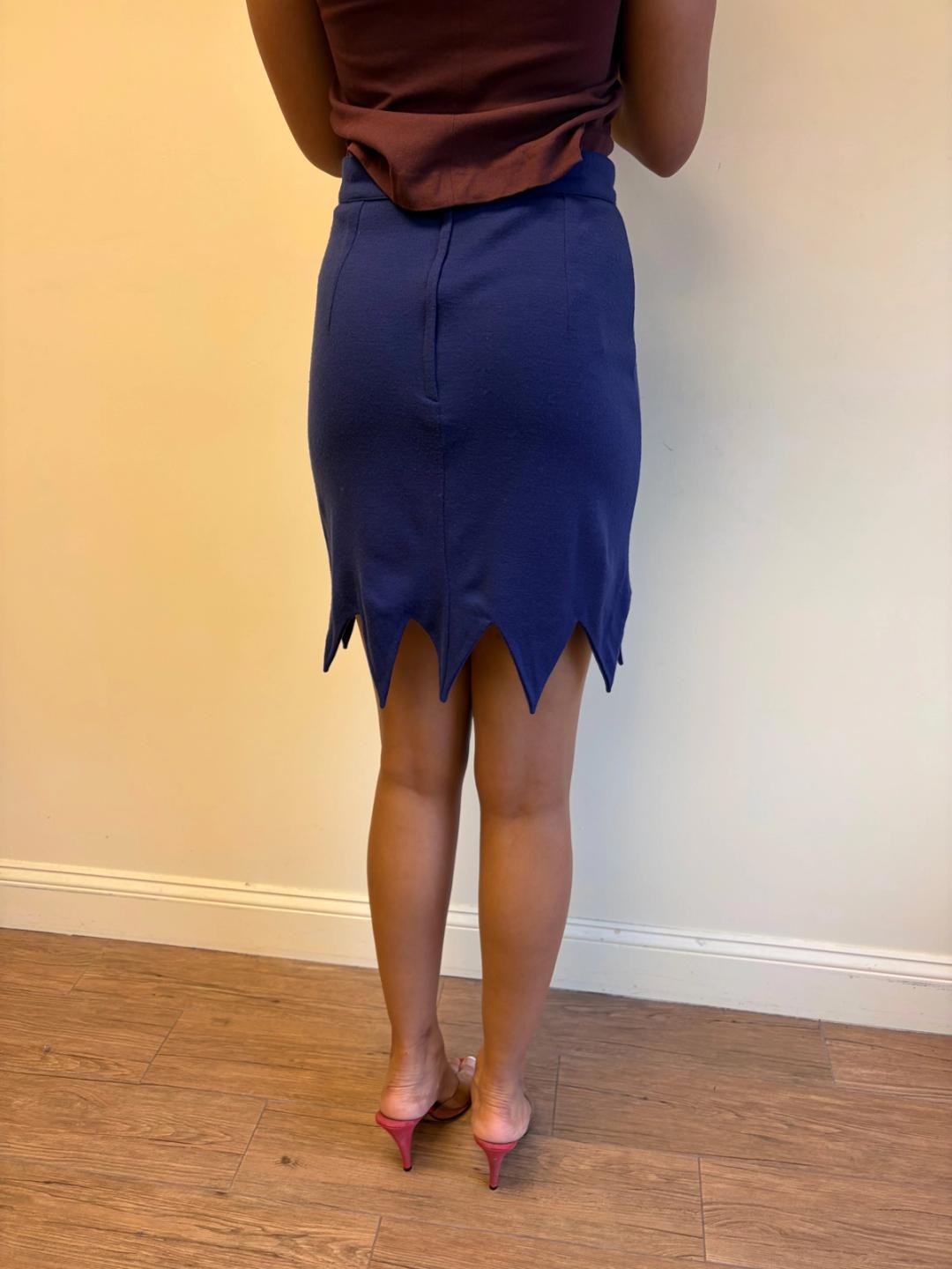 90s Chantal Thomass purple skirt with a jagged hem. The skirt is a wool blend and is quite stretchy. It has a zipper closure.