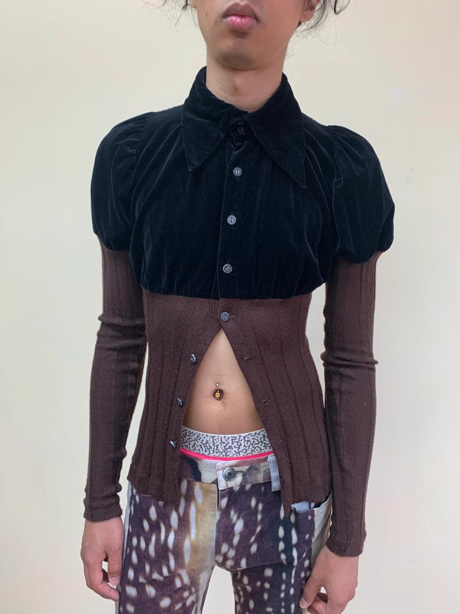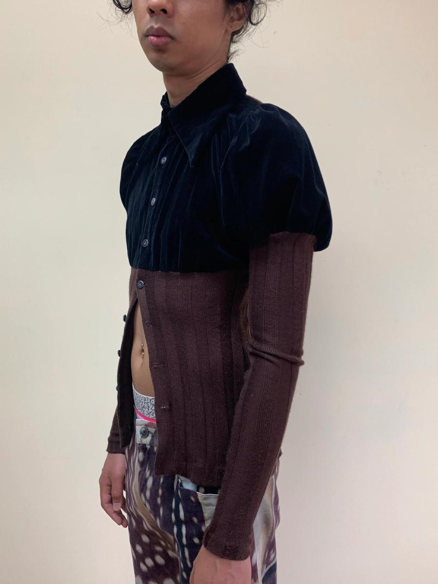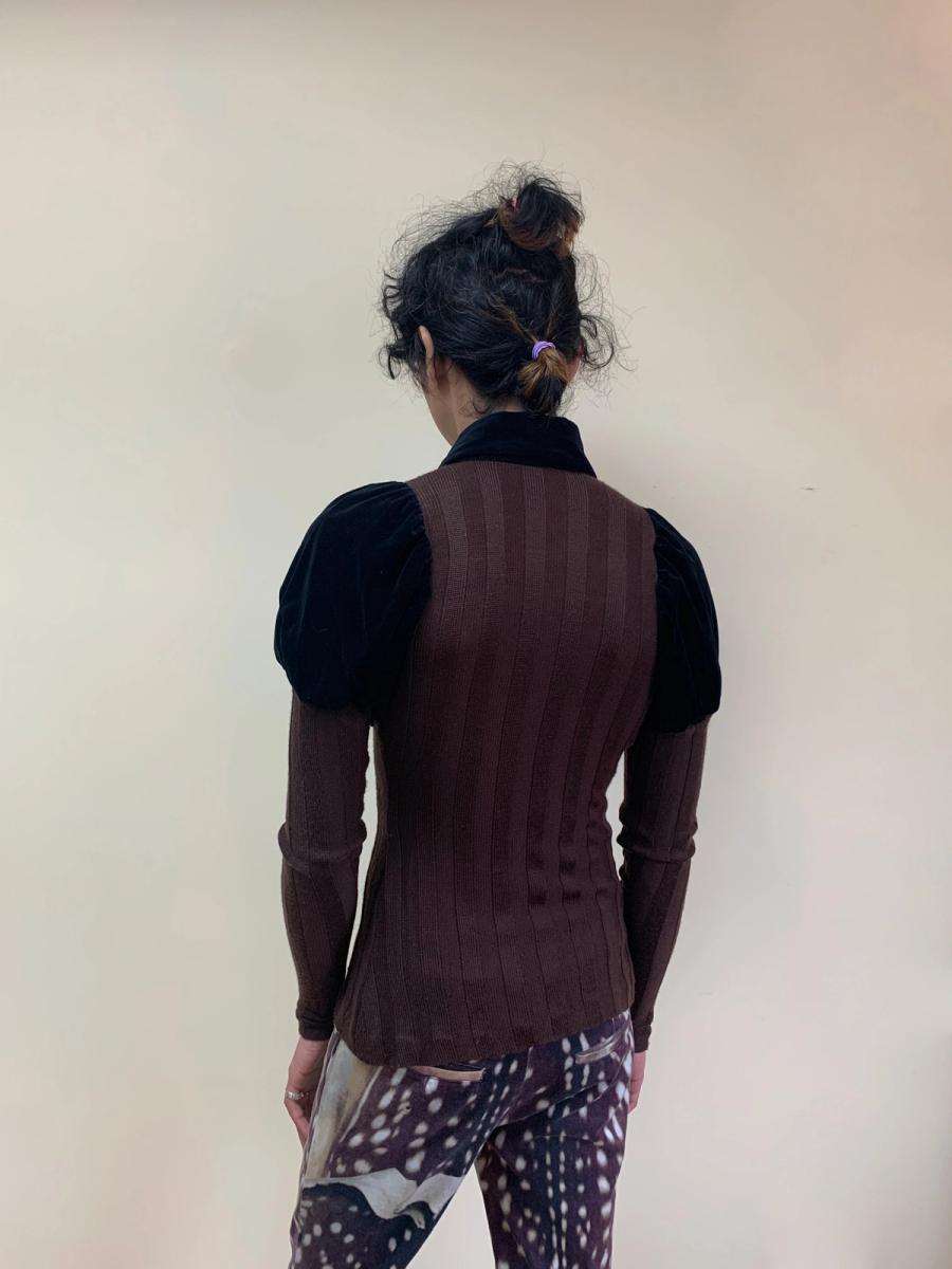 Rare button up blouse by Condire, a part of the label 20471120. The blouse is composed of black velvet on the top and a brown knit on the bottom. It seems to be designed with some elements of historical fashion silhouettes. The blouse has dramatic shoulders and lovely pleating on the top.