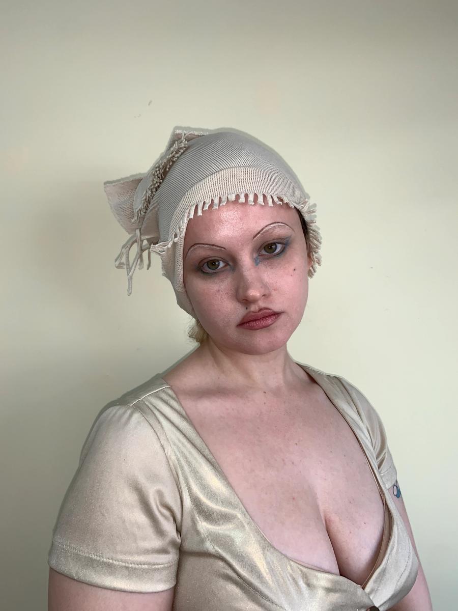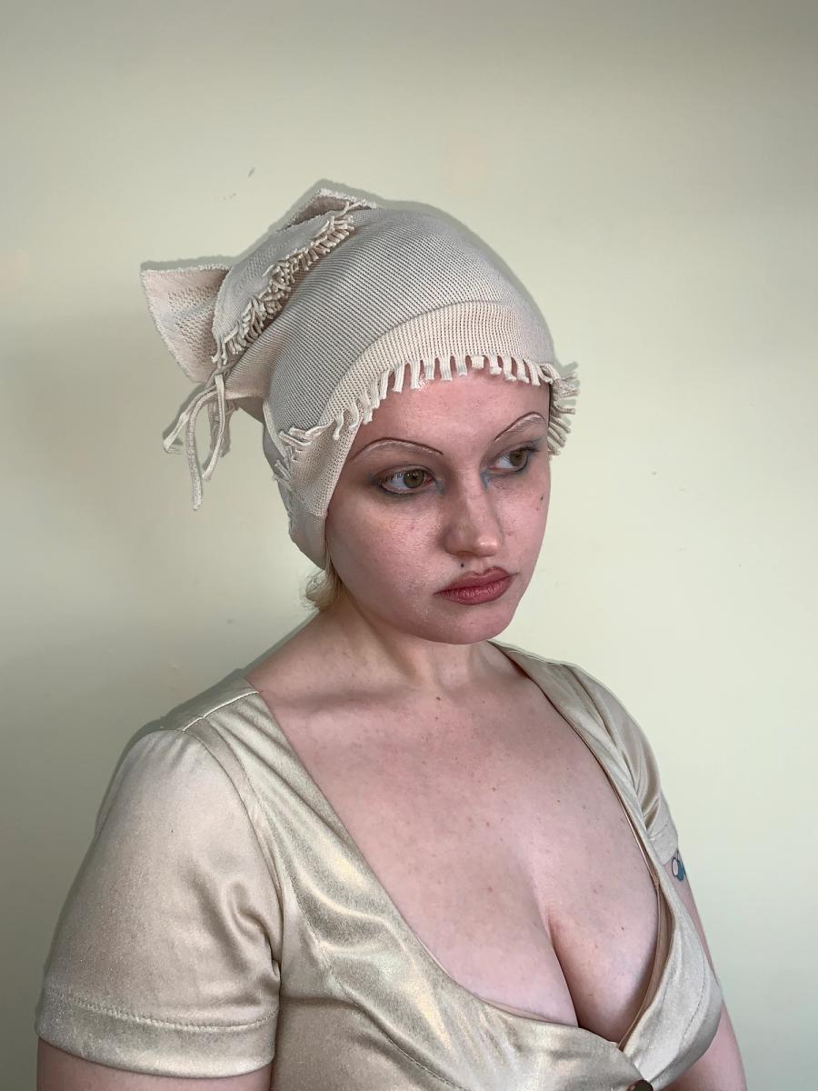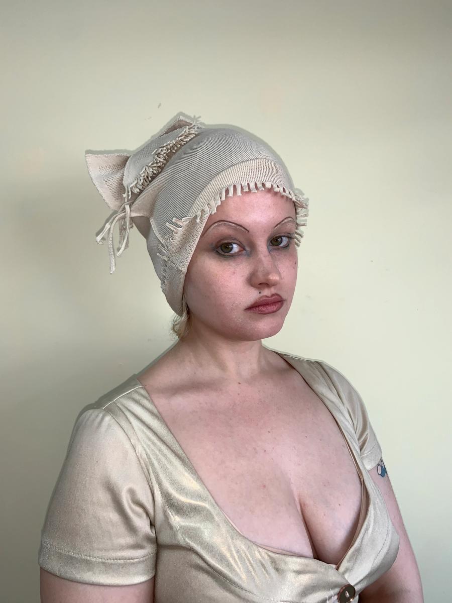 Amazing Issey Miyake A-POC beige hat from the 90s. The hat has a sculptural fringe design on the top that can be styled in different ways. There is also a fringe trim on the bottom. The A-POC line is an acronym for 'a piece of cloth'. Miyake founded the line in 1997 with Dai Fujiwara upon the concept of reducing textile waste by creating outfits from a single fused piece of knit fabric, making the garments also size flexible and customizable for the wearer. The garments also have an incredible 2D quality when seen flat. One size fits many, very stretchy. Excellent condition.