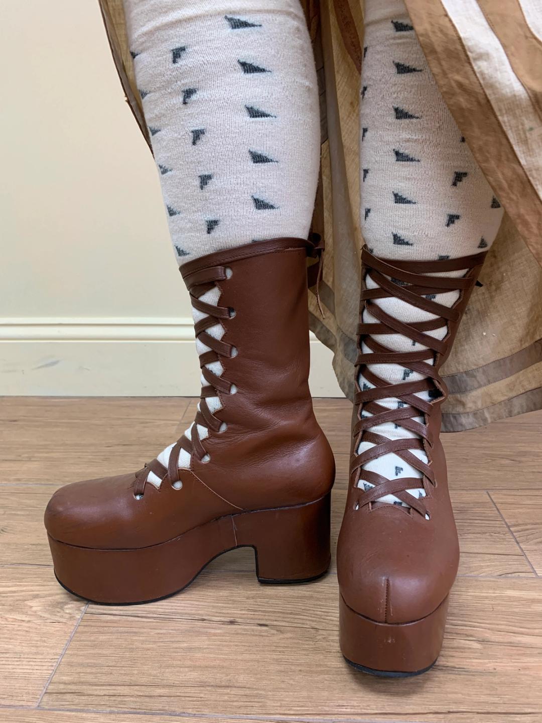 Very unique brown leather platforms from Jane Marple from the 1990s. They have a supportive lace up style with scalloped edging. They lined in leather. In excellent condition. Marked size 24.