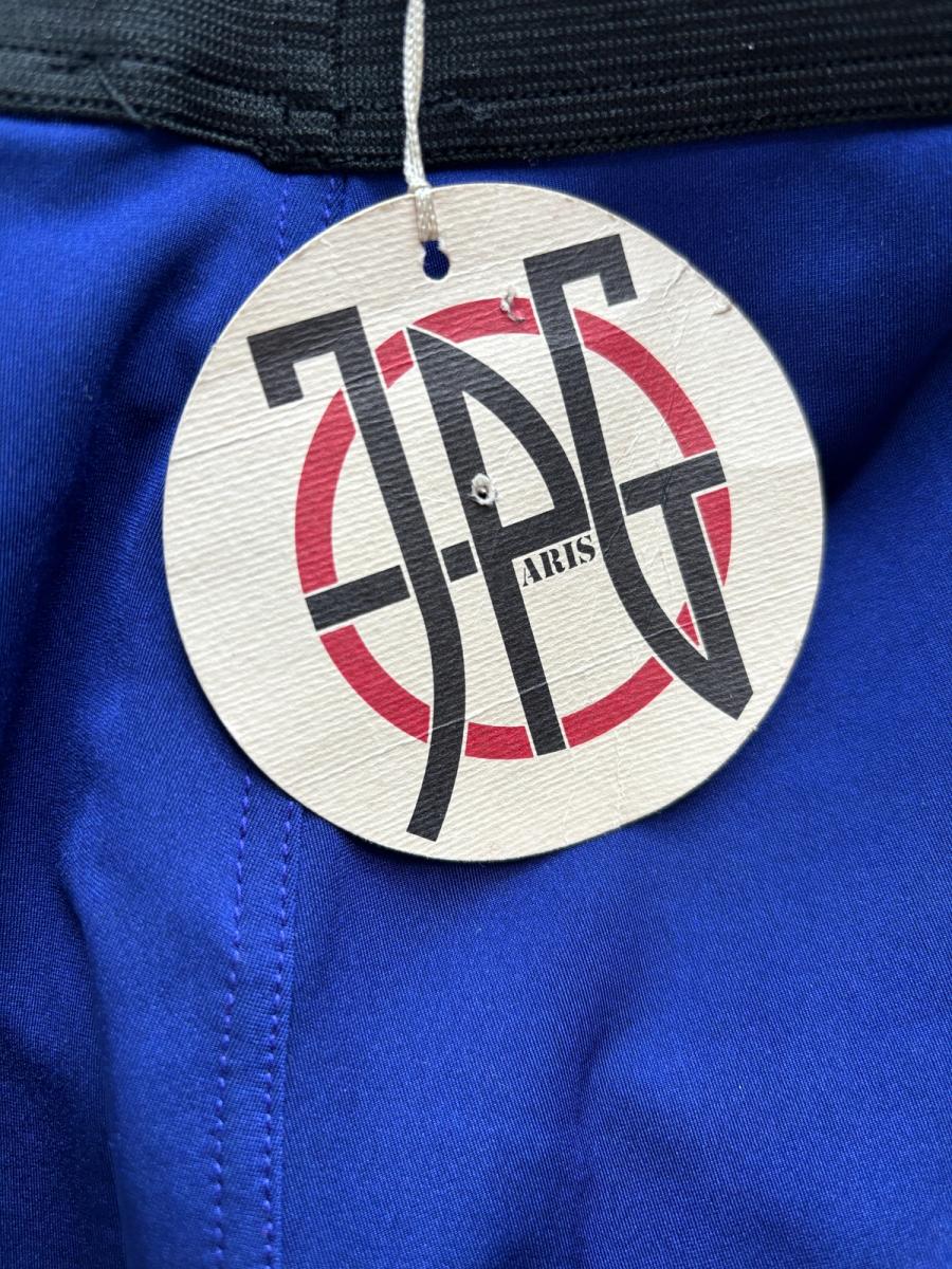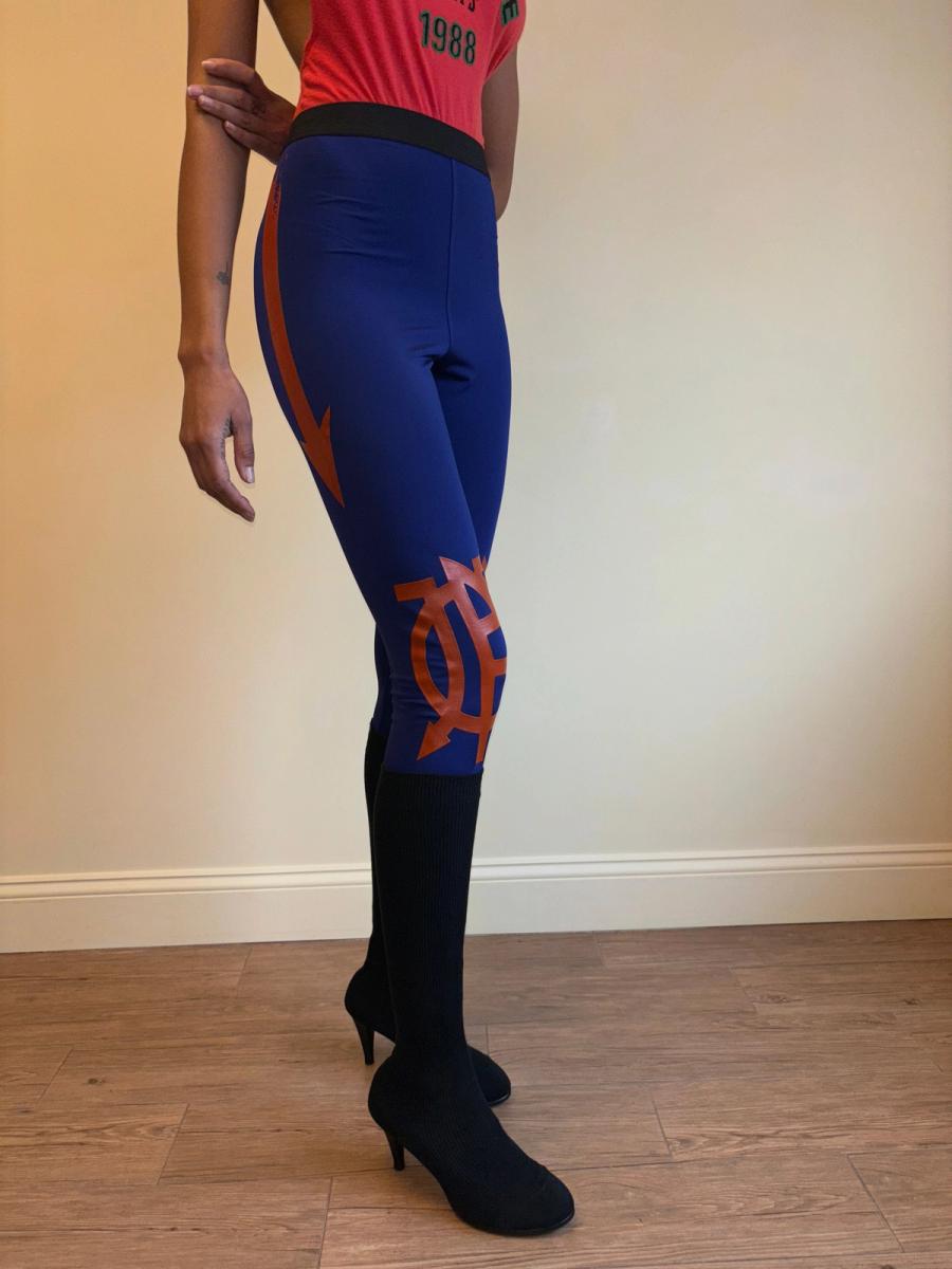 Deadstock 90s Jean-Paul Gaultier leggings with arrow and logo design. The leggings are a striking blue color and quite stretchy. They're in excellent condition and have their original tags. Marked a size large. Made in Italy.