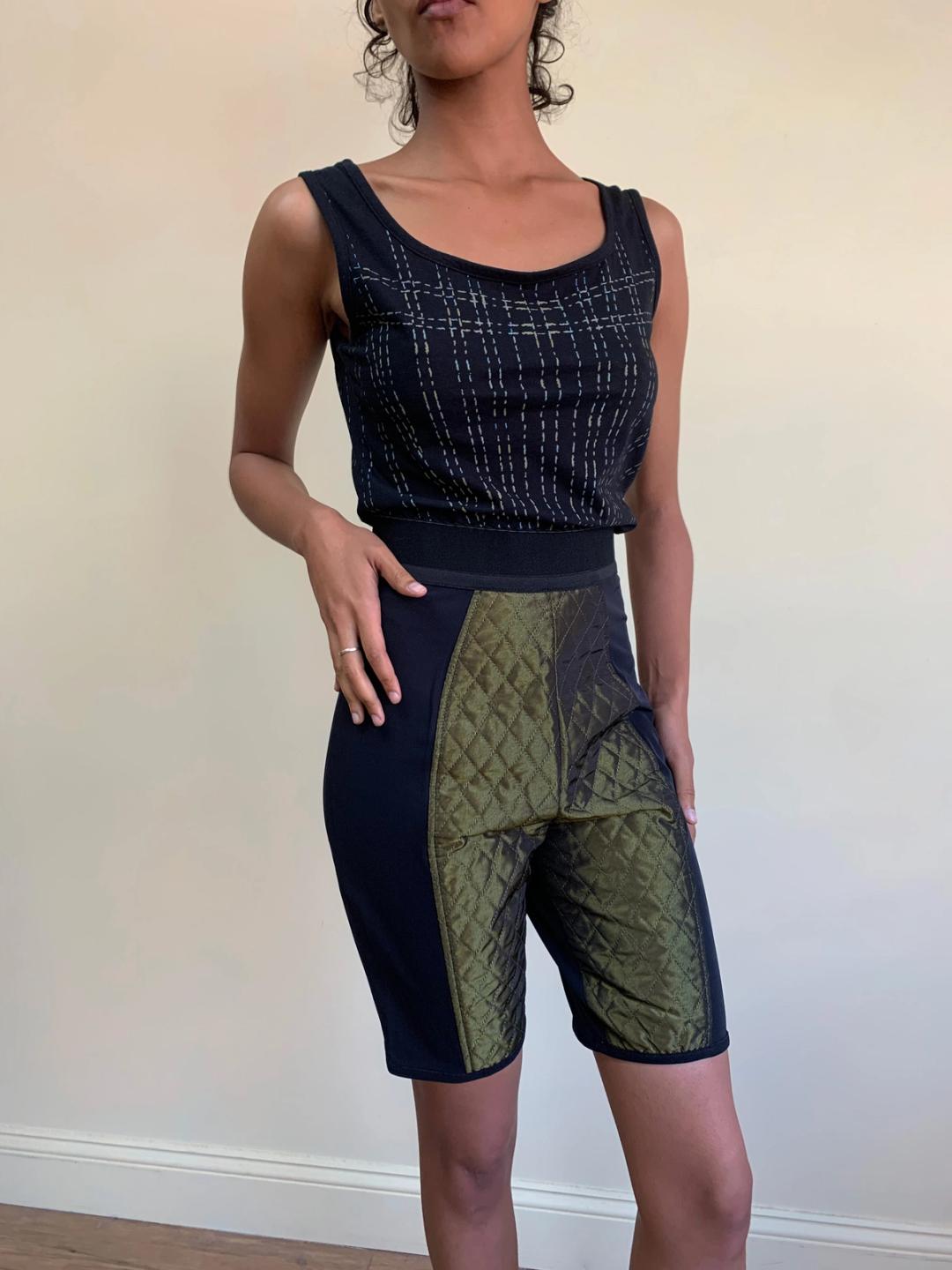 Gorgeous Jean-Paul Gaultier quilted lingerie-esque shorts. The shorts have a quilted green iridescent material in the front and a scalloped waistband. Very stretchy.
