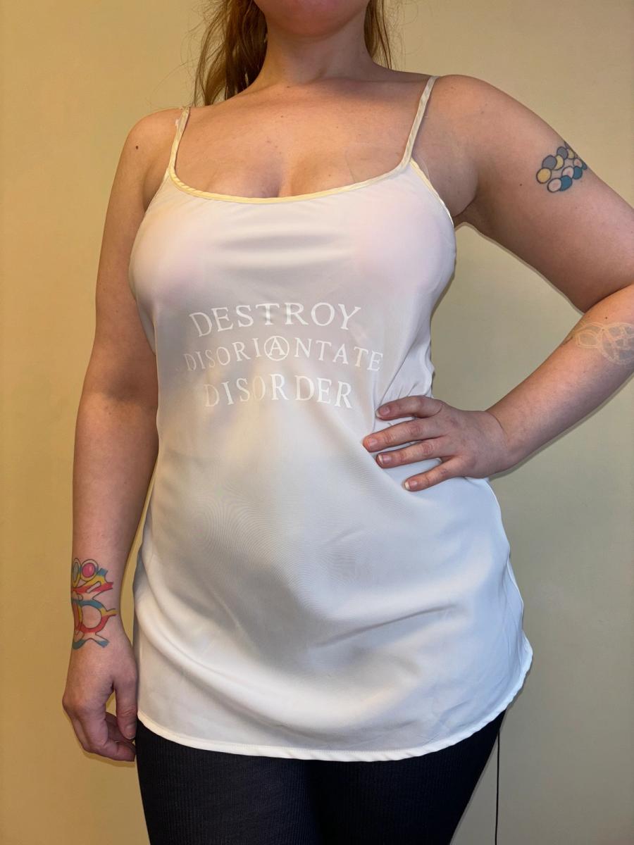 Rare 1990s John Richmond slip dress. The dress says "Destroy Disorientate Disorder" across the front. There's a single button closure in the back.