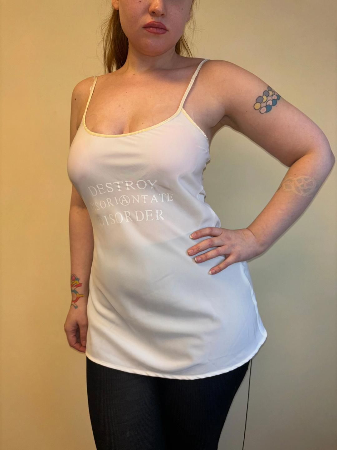 Rare 1990s John Richmond slip dress. The dress says "Destroy Disorientate Disorder" across the front. There's a single button closure in the back.