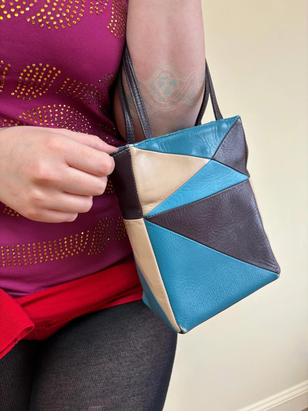 90s Masaki Matsushima leather patchwork purse. The purse is square and made of a vibrant assortment of leather pieces. Some minor wear to the outside of the purse and clean interior!