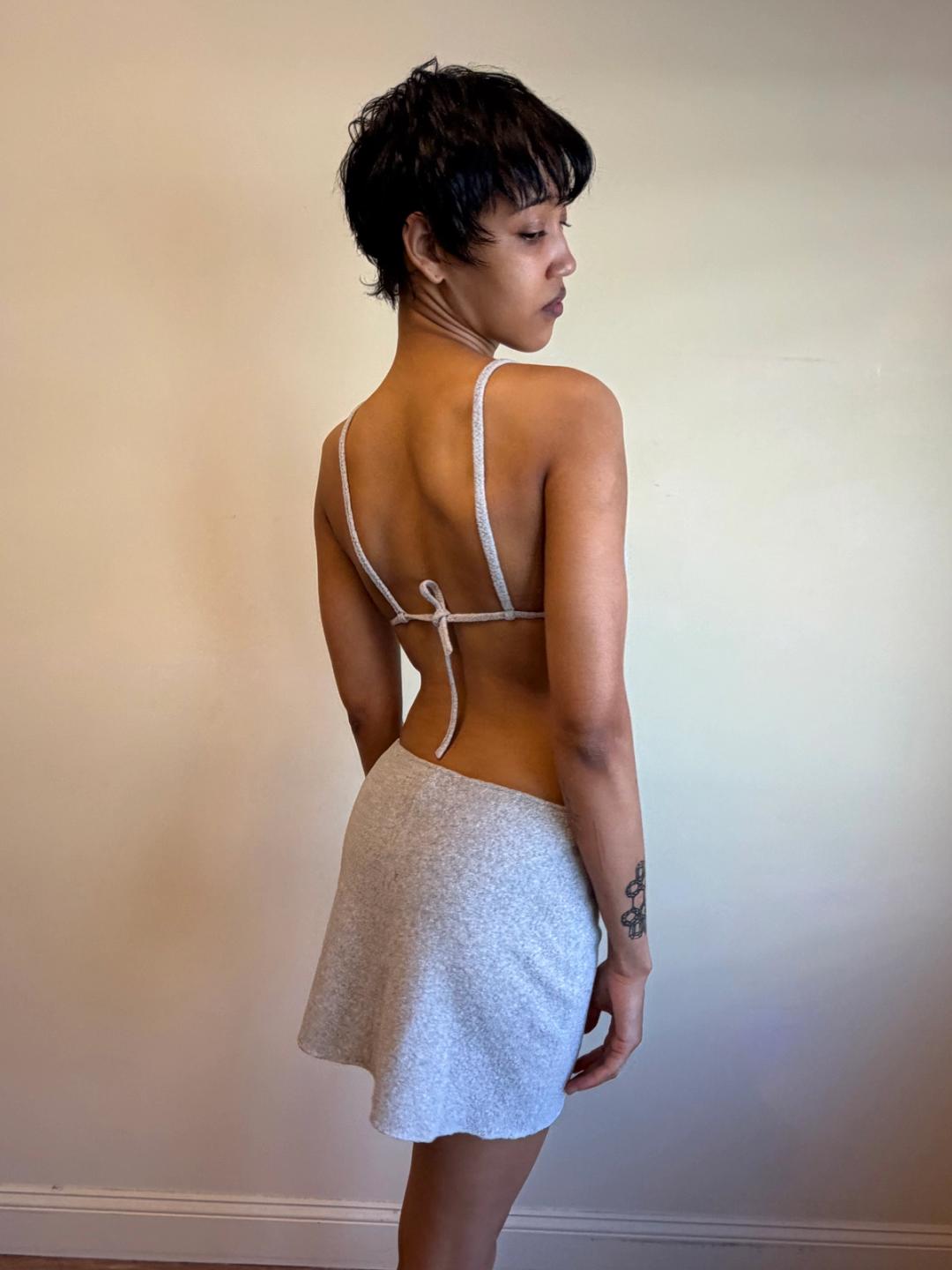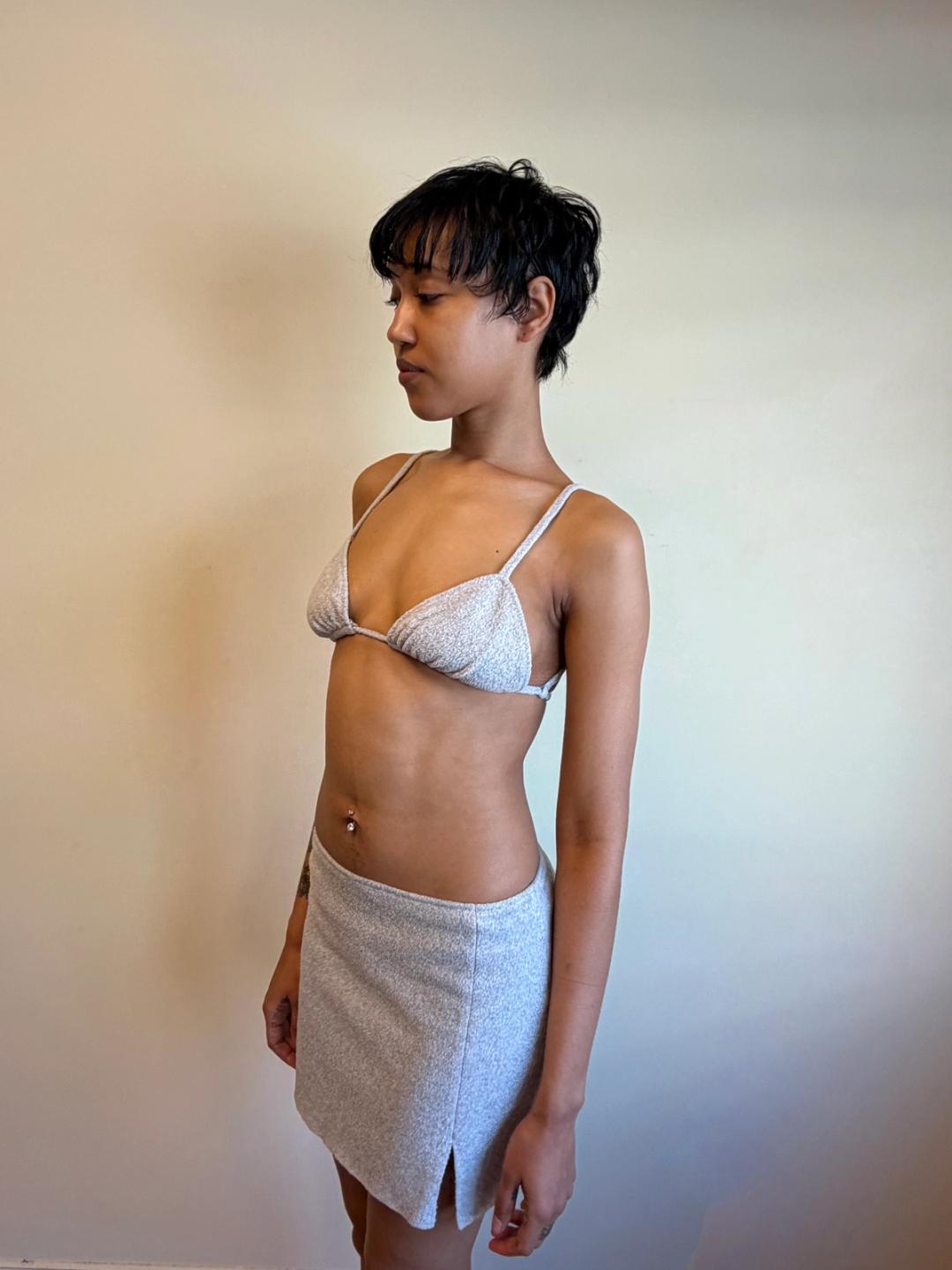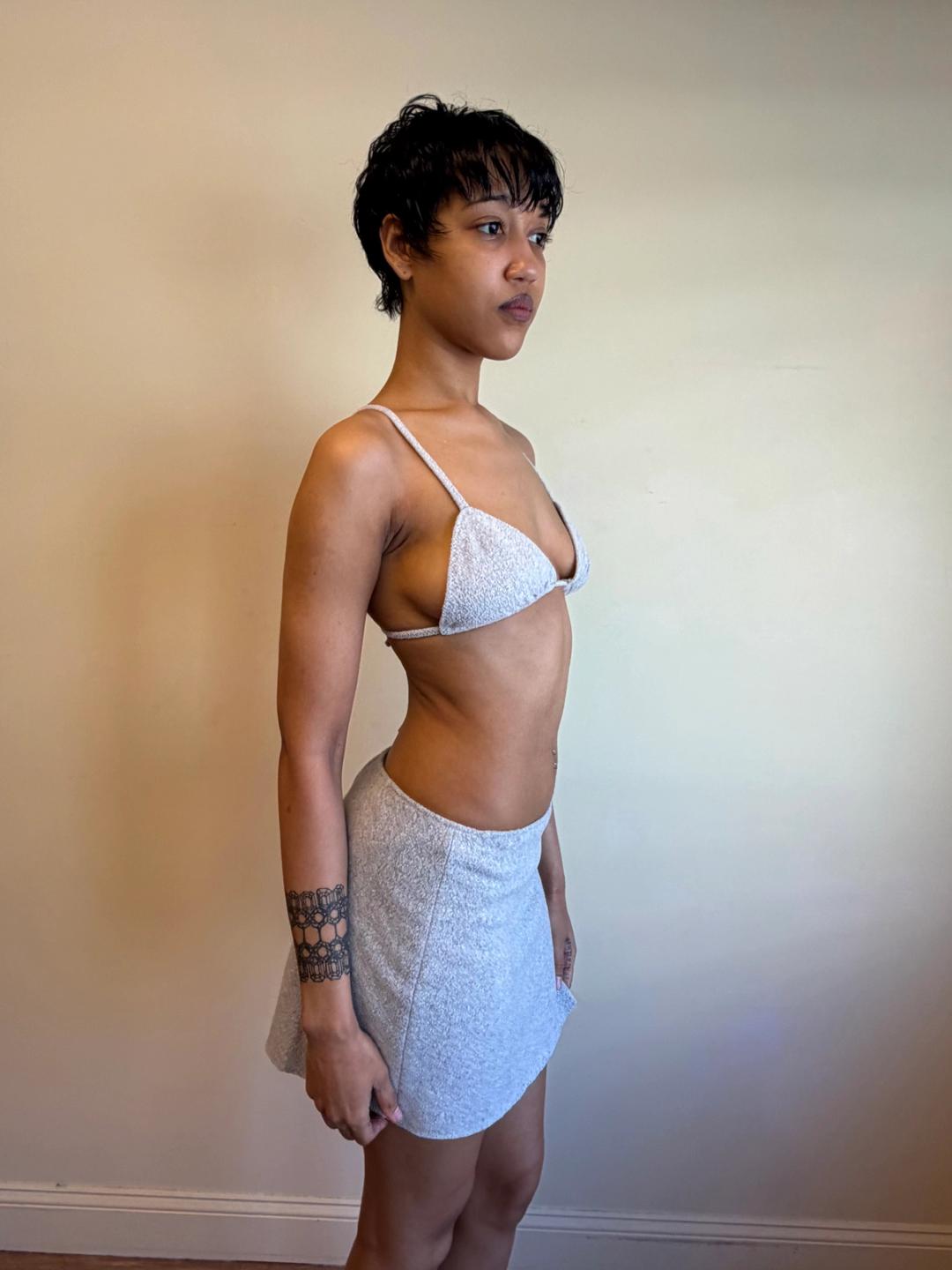 90s Norma Kamali dove grey fleece 3 piece set, including bikini top and bottom, and over miniskirt.
