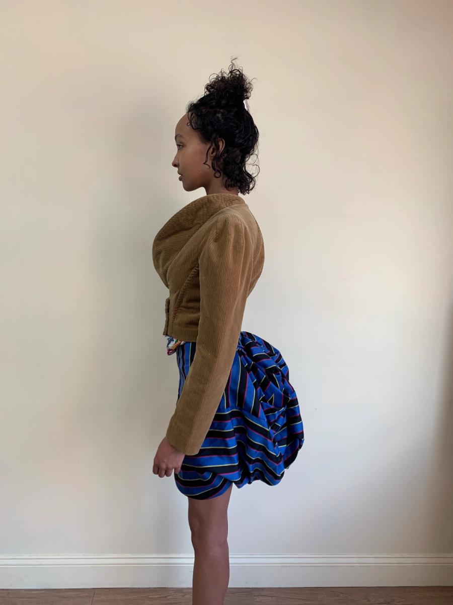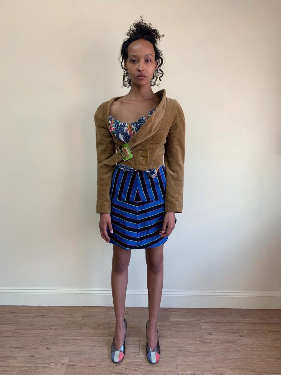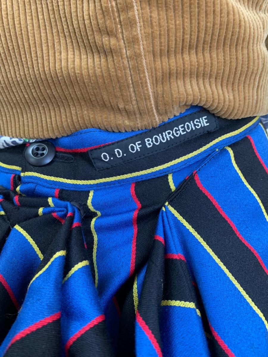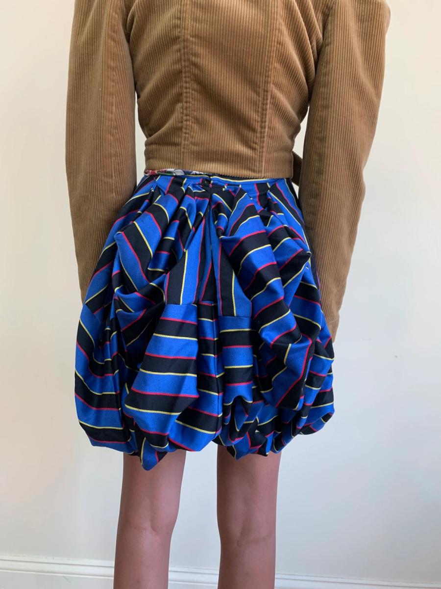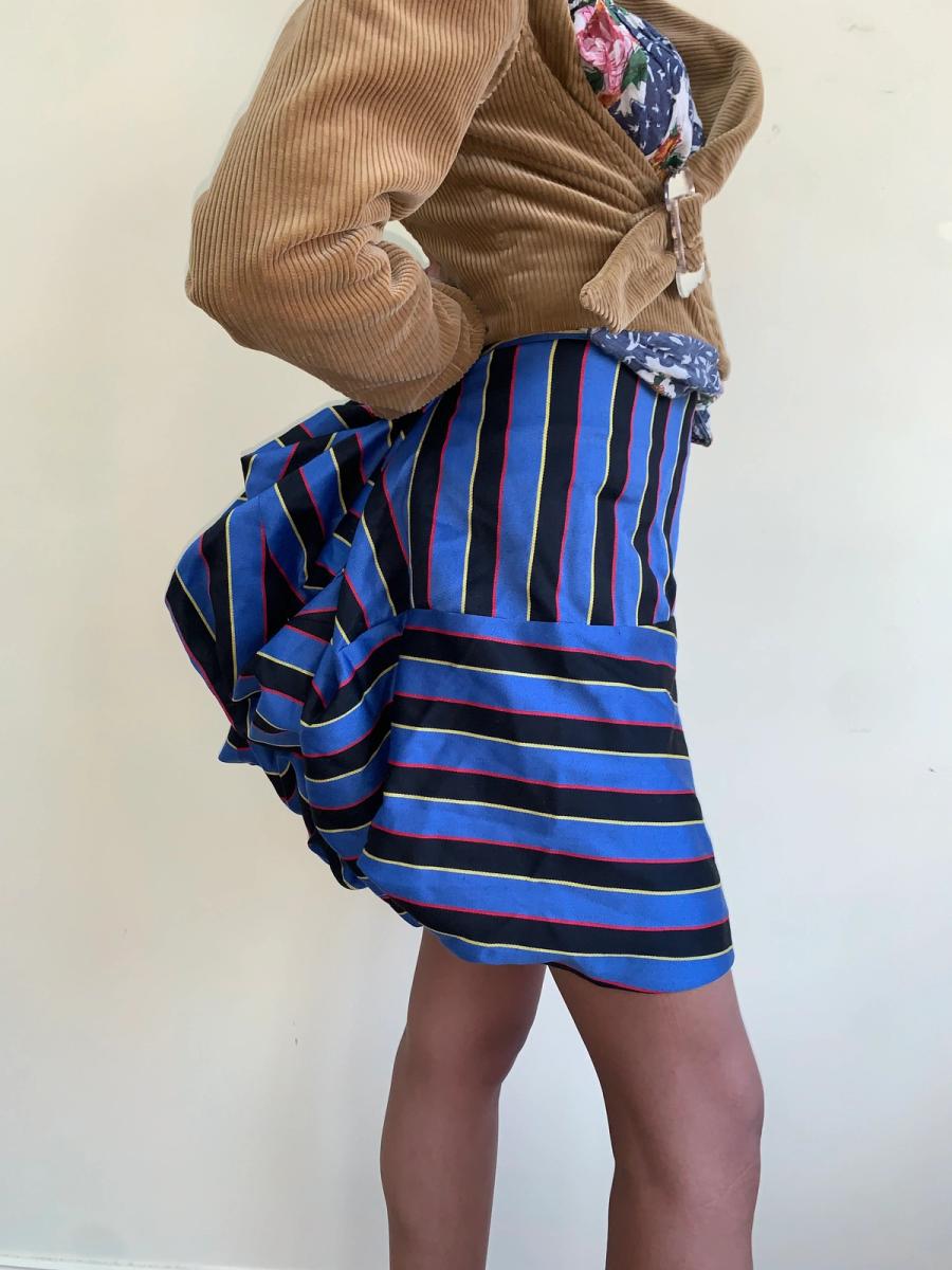 Vintage 1990s bustle miniskirt from ODOB in a vivid striped fabric. This rare label was the progenitor of MILK. The patterning of the skirt is innovative making it wearable and comfortable. The skirt is in perfect condition.