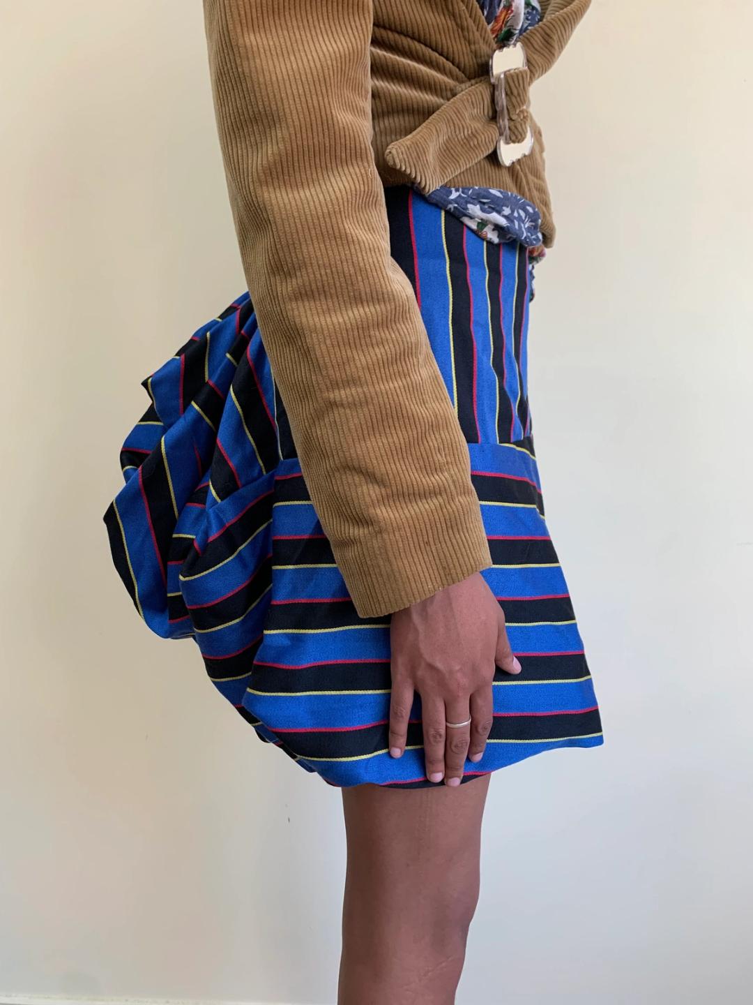 Vintage 1990s bustle miniskirt from ODOB in a vivid striped fabric. This rare label was the progenitor of MILK. The patterning of the skirt is innovative making it wearable and comfortable. The skirt is in perfect condition.
