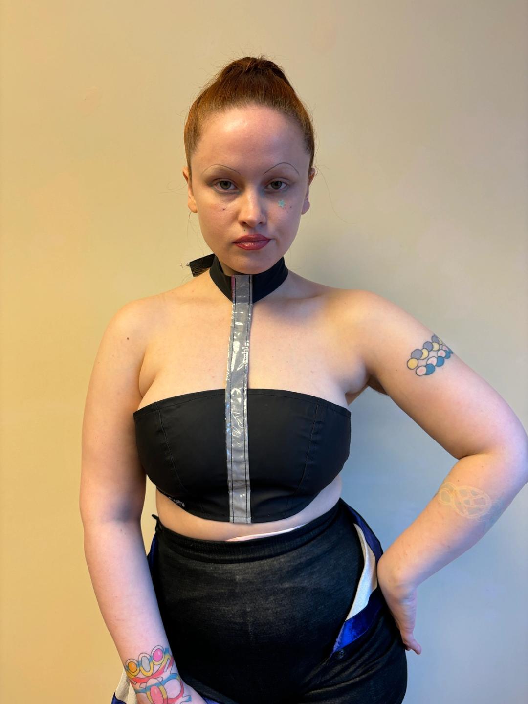 Cyberpunk/rave brand Pen & Lolly buckle halter top with reflective 3m panel. Completely adjustable and size flexible with elastic and buckle closures!