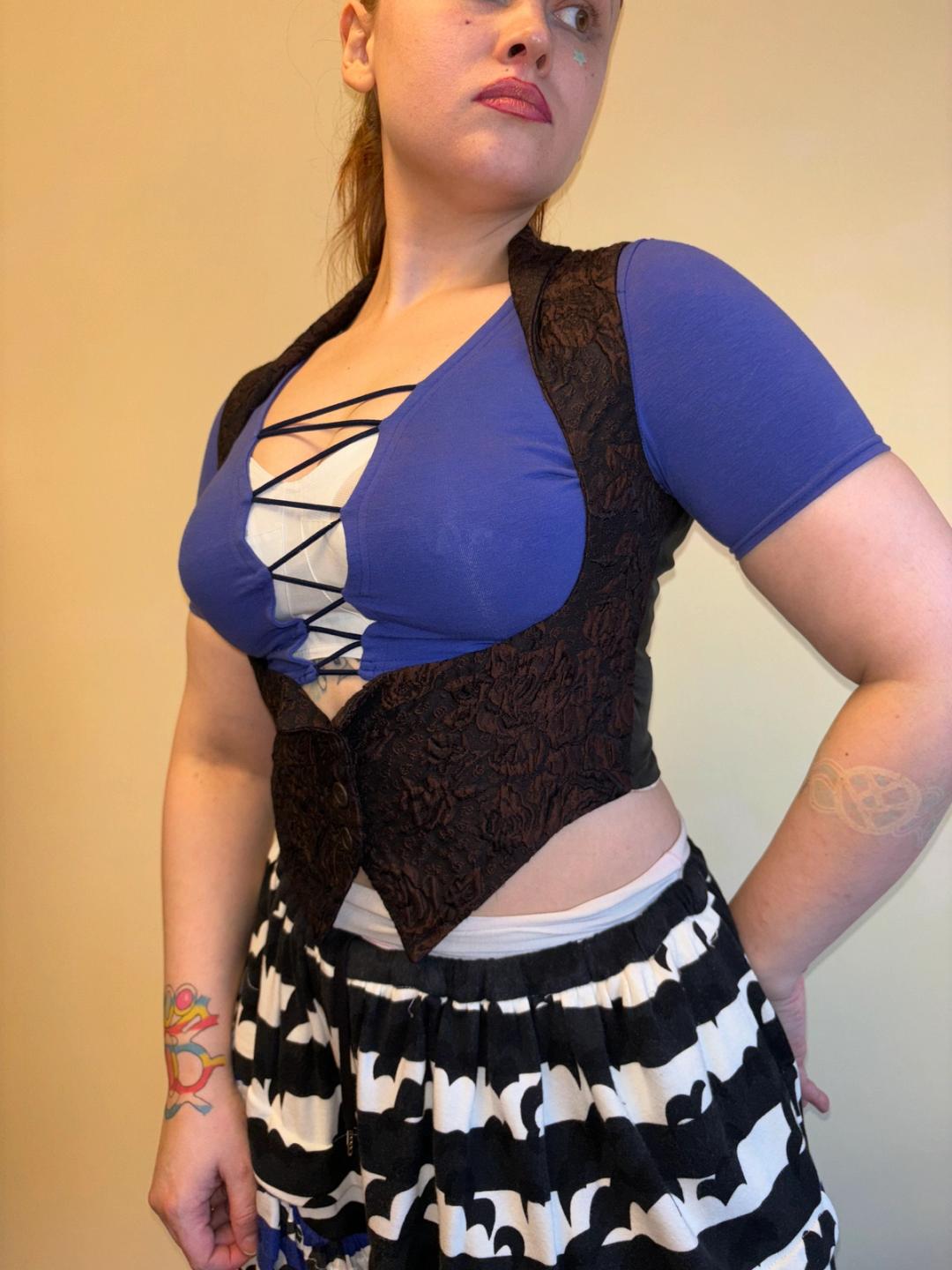 90s Romeo Gigli maroon jaquard vest with a deep scooping underbust cut with pointed hem. It has an adjustable belt closure in the back allowing the wearer to customize how cinched they want to be! Made in Italy.