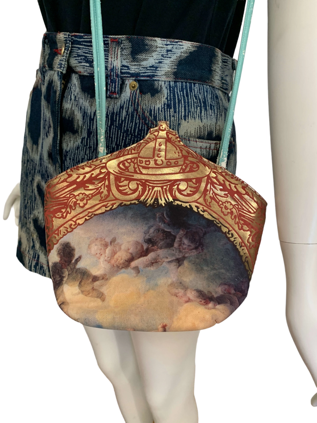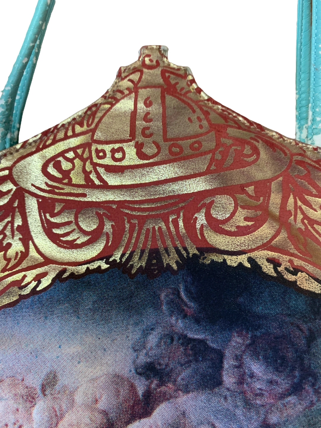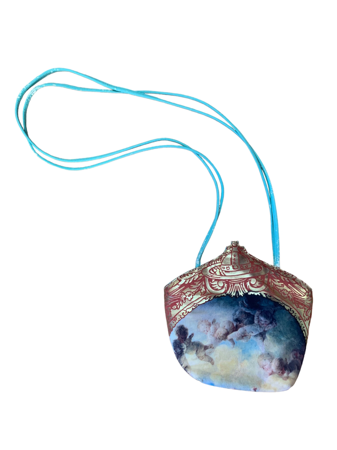 Extremely rare 90s Vivienne Westwood Putti print purse with gold foil trim and large orb design. The purse has the Braccialini zipper tag since all of Westwood's early bags were manufactured by the leather accessories company. The bag is made of a vibrant turquoise faux leather. It has a snap closure and a zipper. There is some cracking of the leather (see images). Made in England.