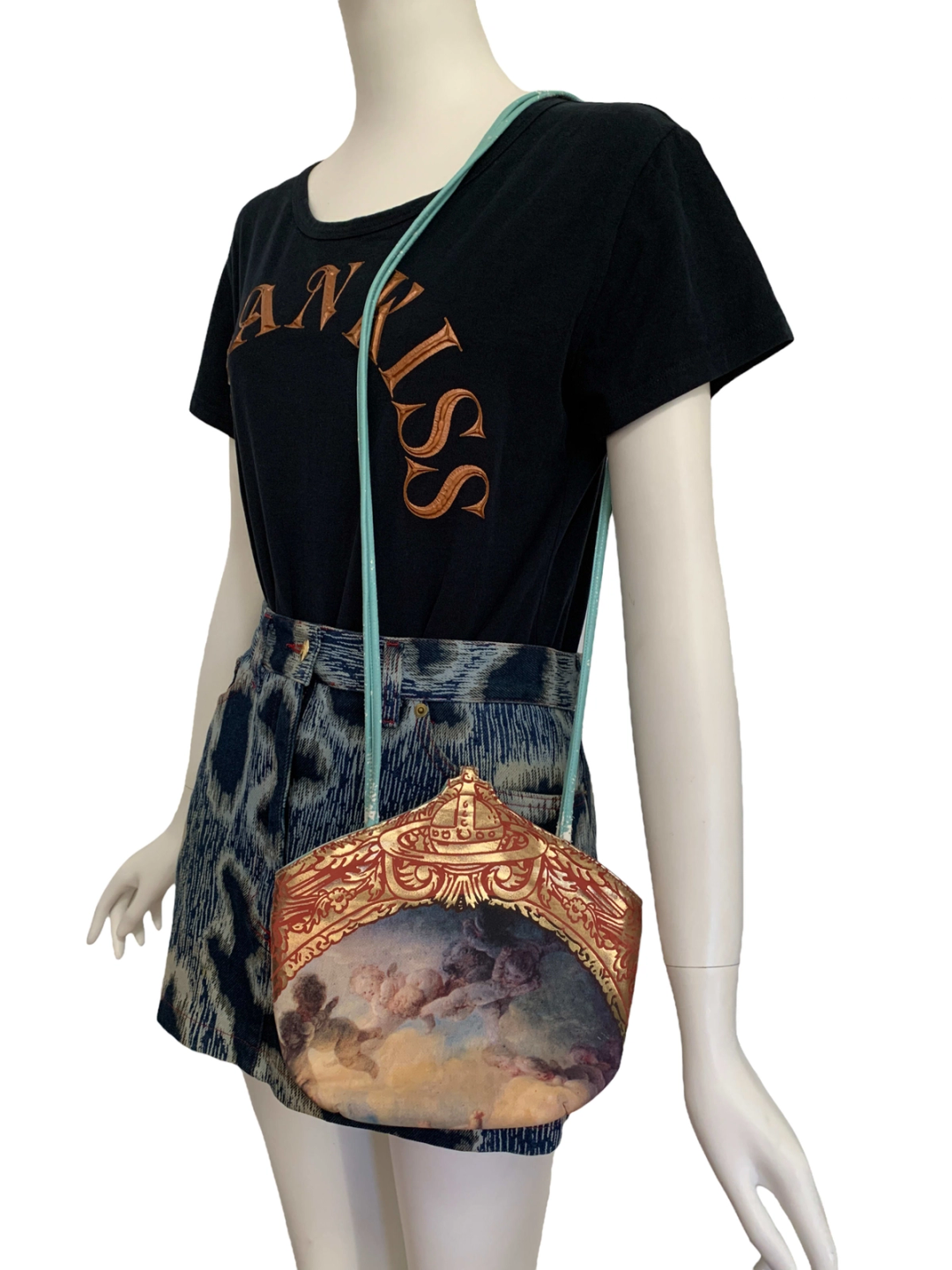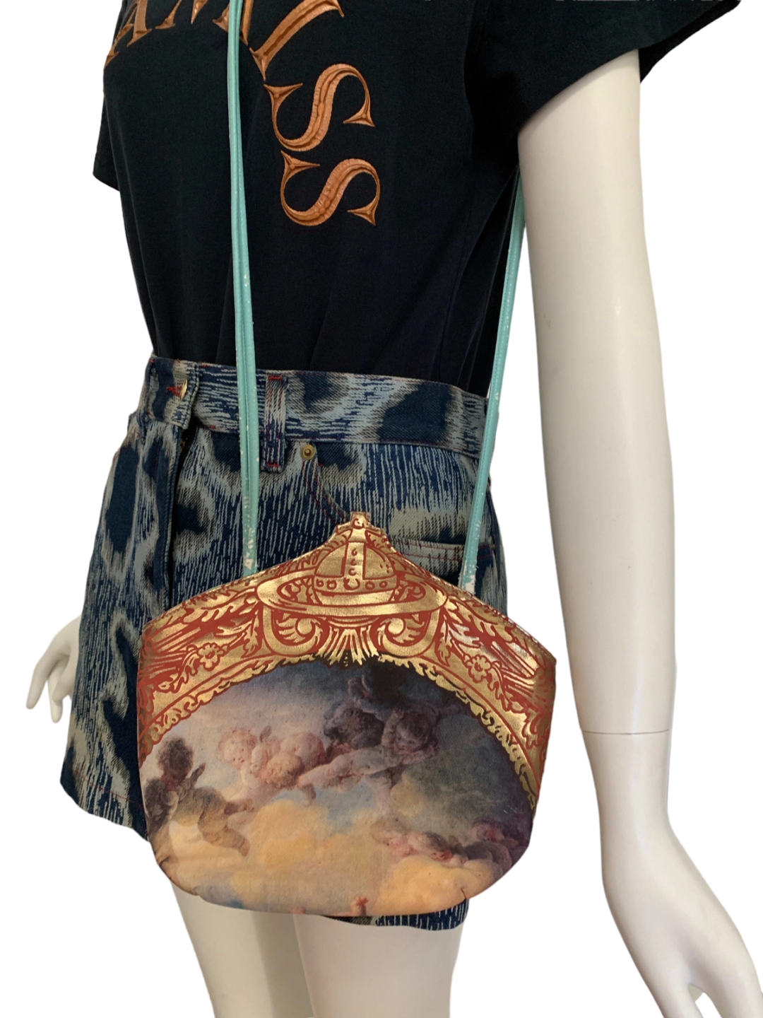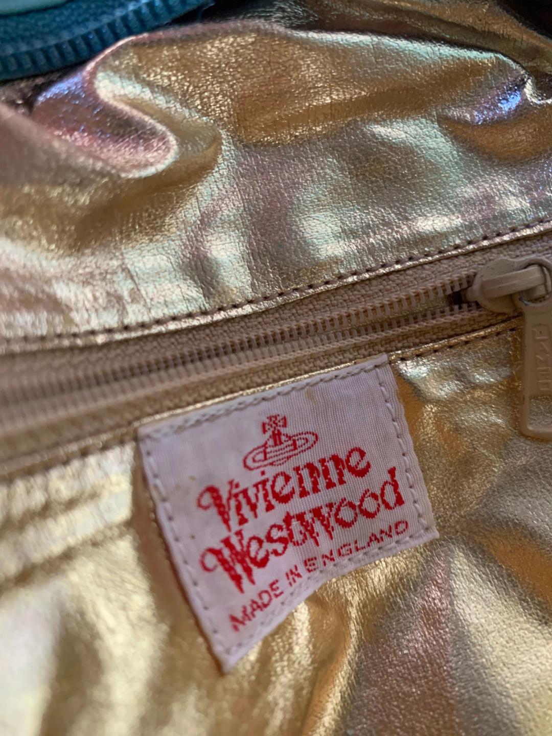 Extremely rare 90s Vivienne Westwood Putti print purse with gold foil trim and large orb design. The purse has the Braccialini zipper tag since all of Westwood's early bags were manufactured by the leather accessories company. The bag is made of a vibrant turquoise faux leather. It has a snap closure and a zipper. There is some cracking of the leather (see images). Made in England.