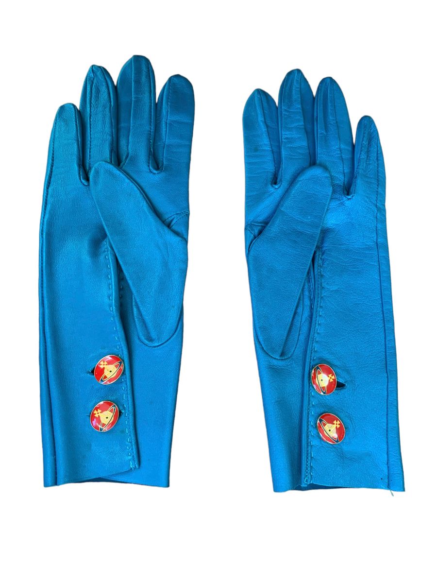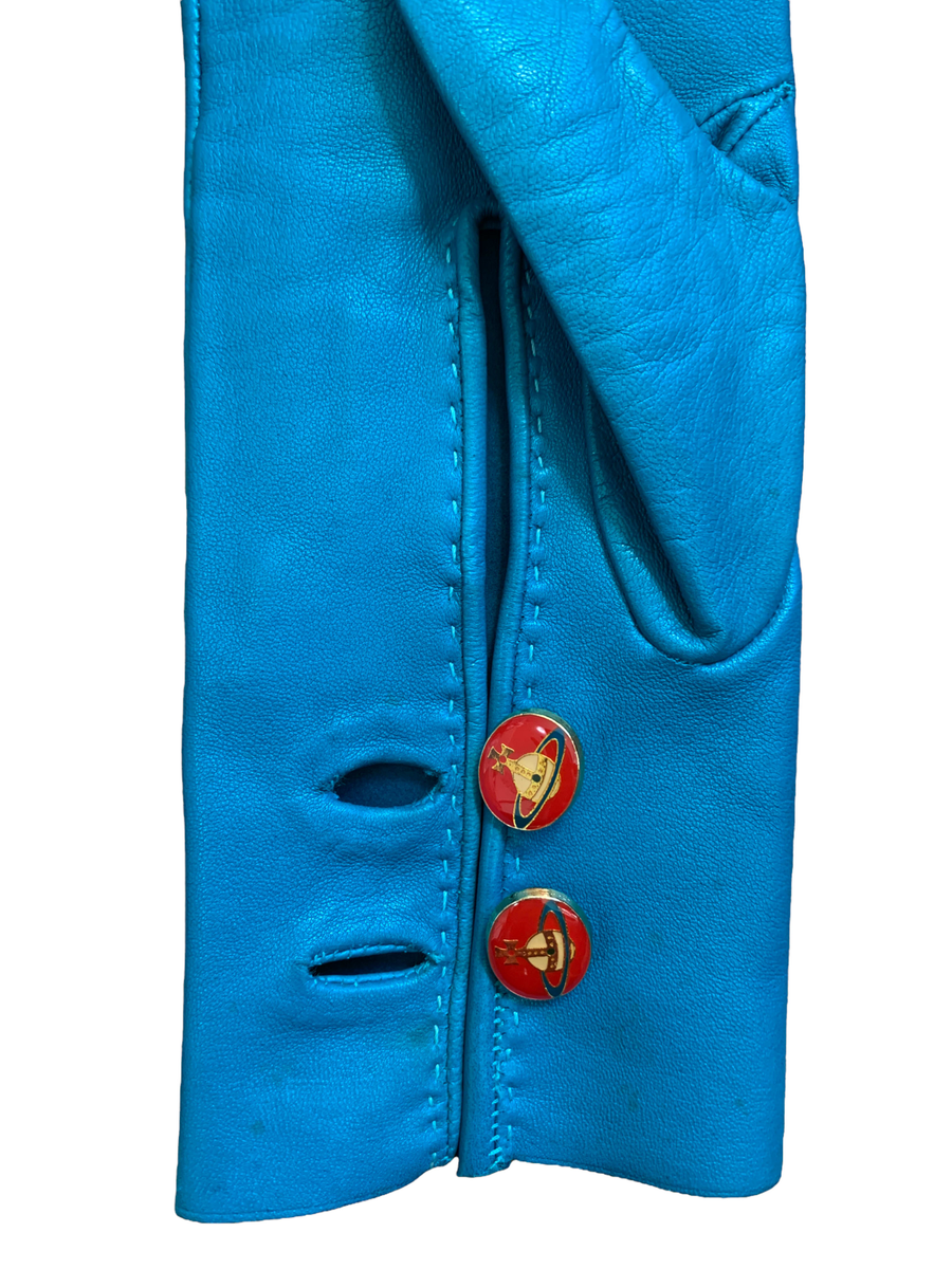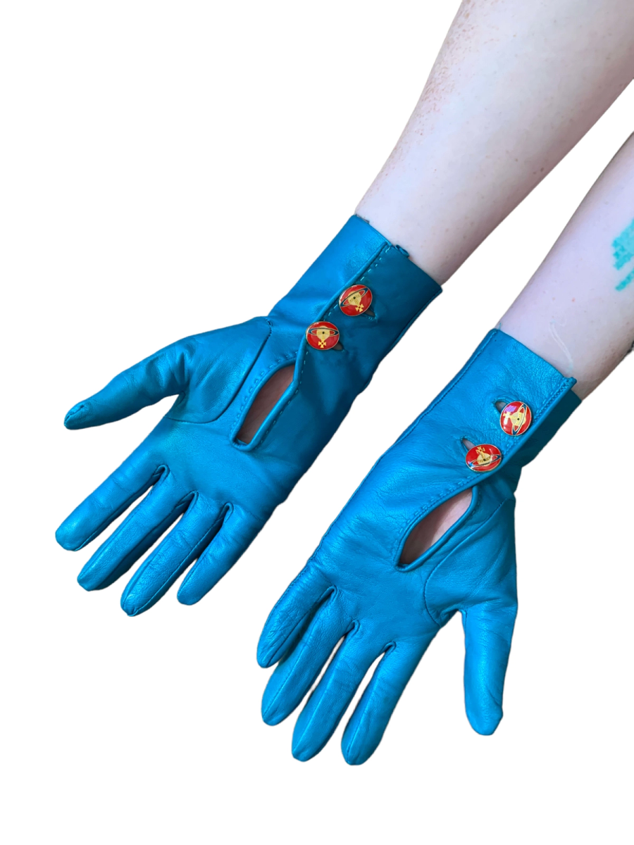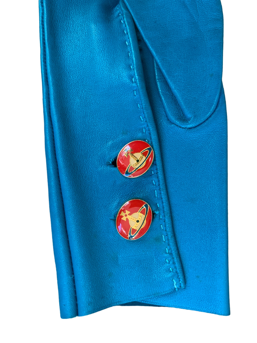 Vintage and rare 90s Vivienne Westwood leather gloves. The gloves are made of a vibrant and unique turquoise leather. They have opulent red enamel Westwood orb buttons. Made in England. The gloves have a very minor imperfection (see last image) otherwise they are in outstanding vintage condition.