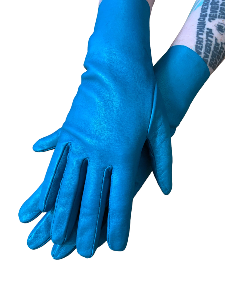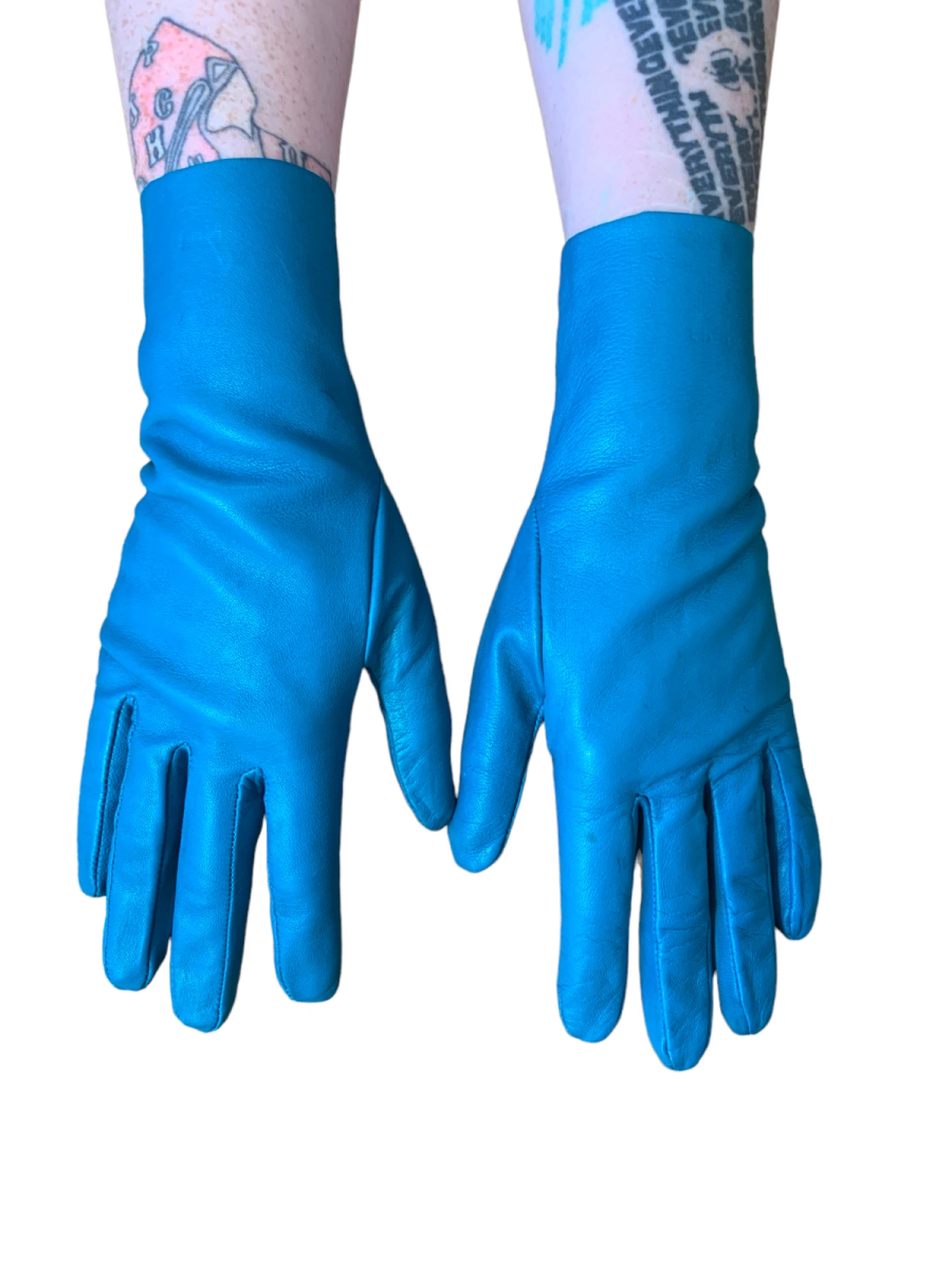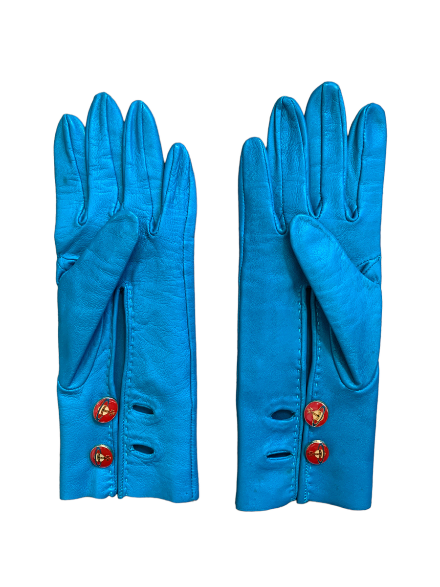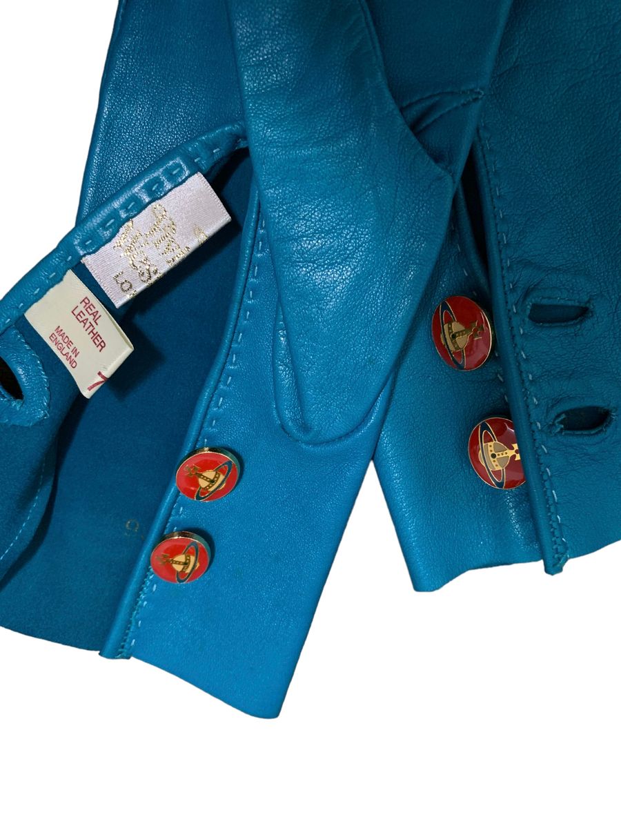 Vintage and rare 90s Vivienne Westwood leather gloves. The gloves are made of a vibrant and unique turquoise leather. They have opulent red enamel Westwood orb buttons. Made in England. The gloves have a very minor imperfection (see last image) otherwise they are in outstanding vintage condition.