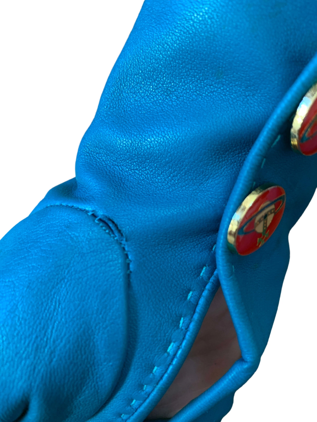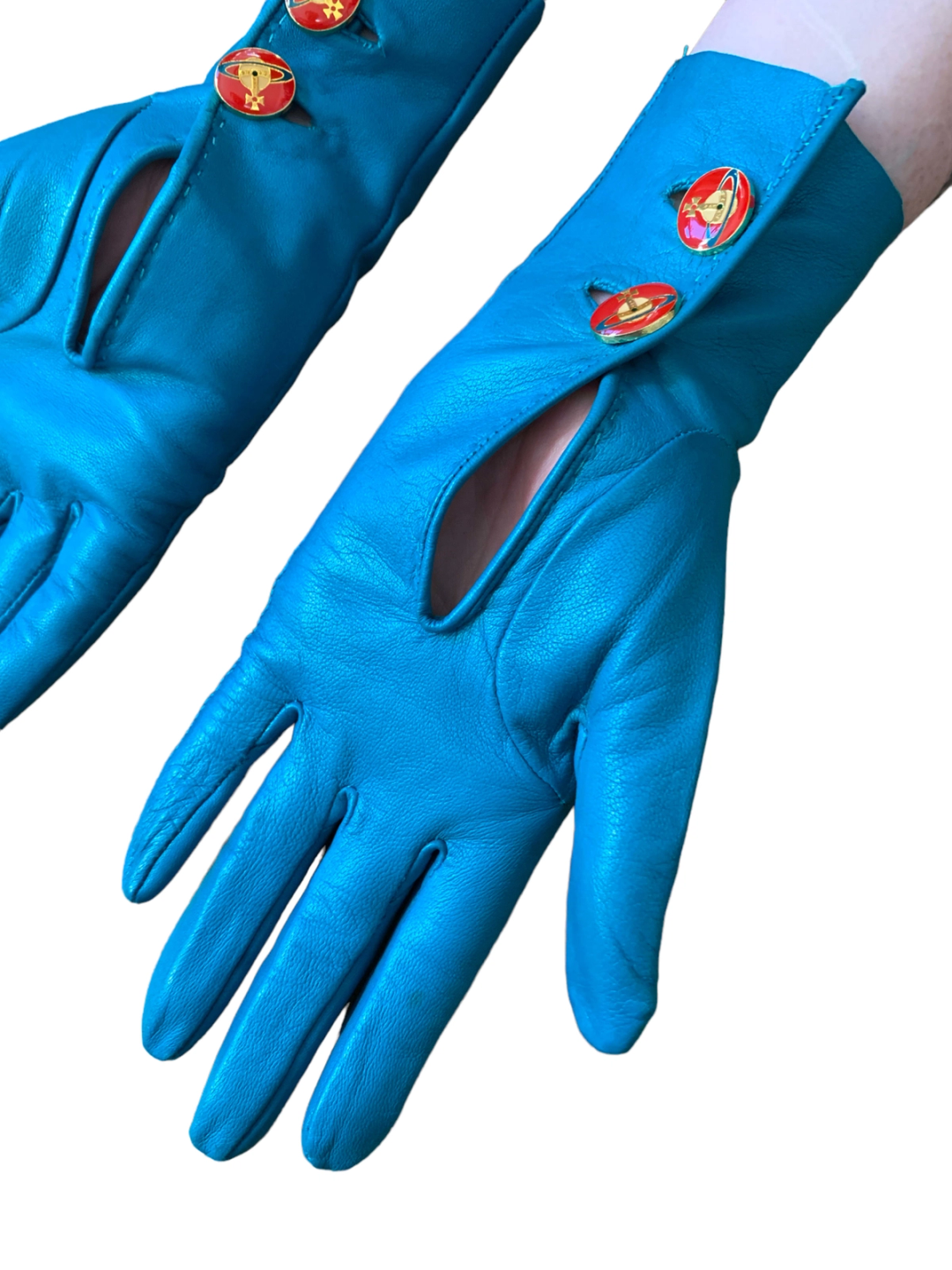 Vintage and rare 90s Vivienne Westwood leather gloves. The gloves are made of a vibrant and unique turquoise leather. They have opulent red enamel Westwood orb buttons. Made in England. The gloves have a very minor imperfection (see last image) otherwise they are in outstanding vintage condition.