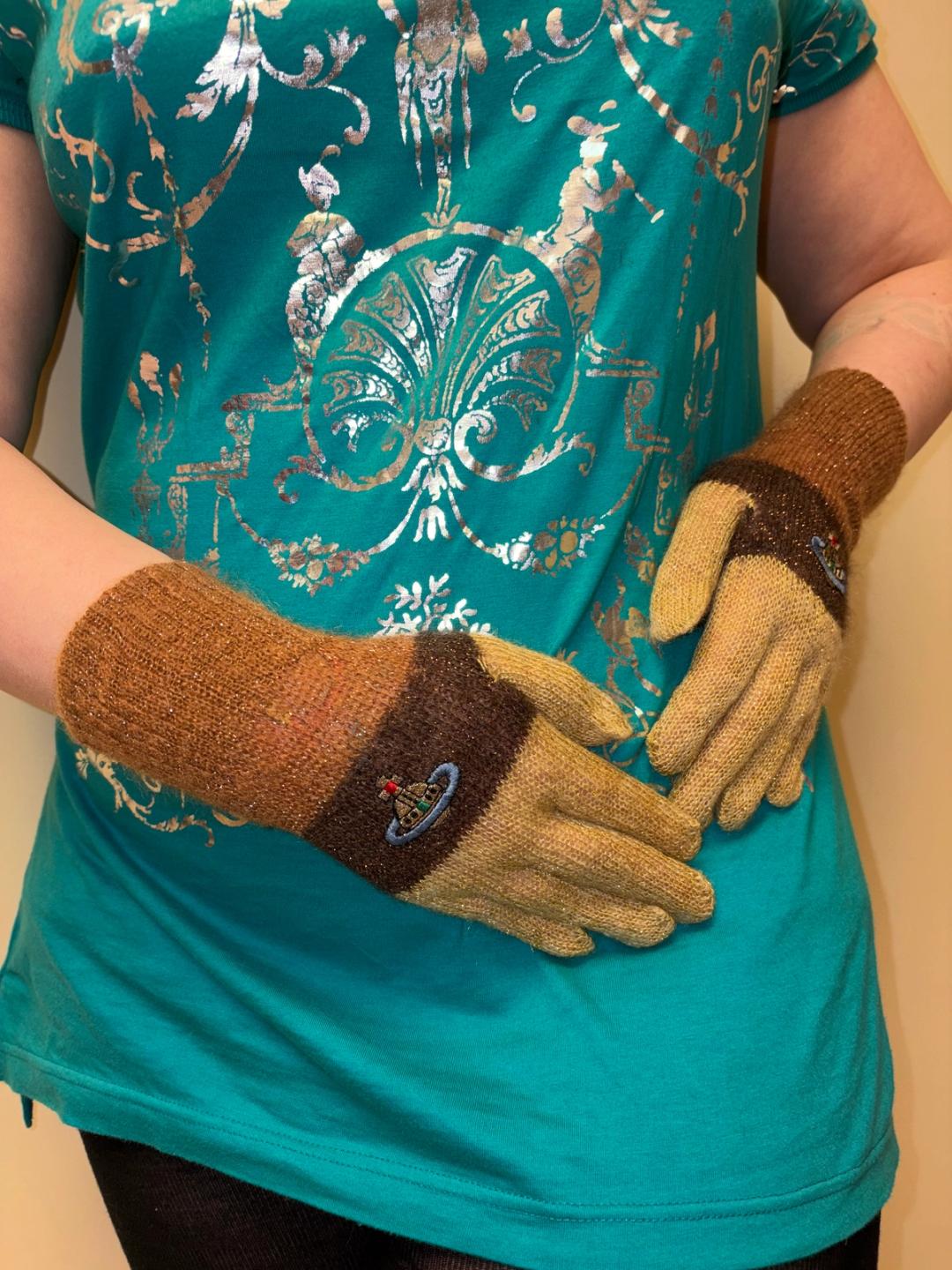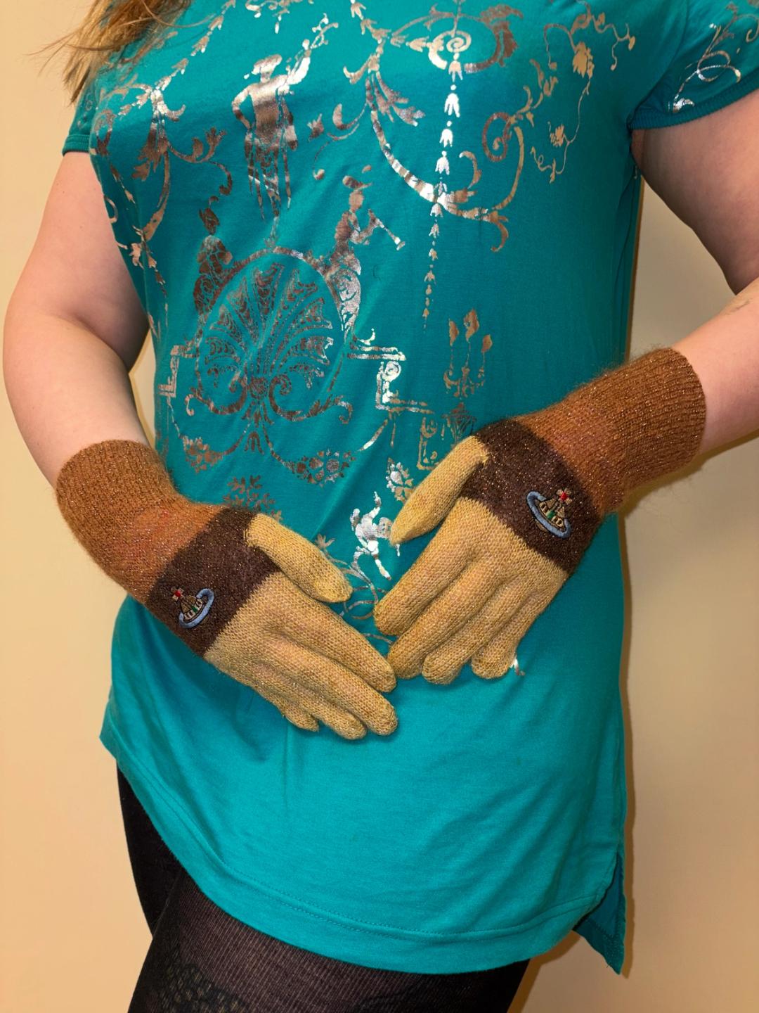 Beautiful mohair knit gloves by Vivienne Westwood from the 1990s. The gloves have sparkly thread woven into them and embroidered orbs at the center. In excellent vintage condition. One size fits most.