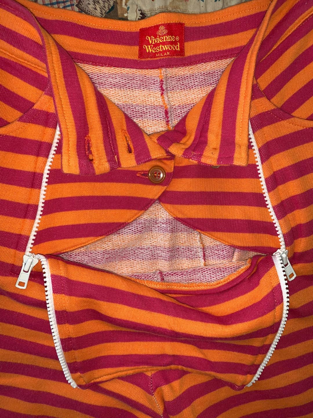 Rare 90s orange and magenta stripe capri sweatpants by Vivienne Westwood with embroidered orb logo and orb buttons. Unzip the front for a cheeky reveal! Stretchy and formfitting with tailored paneling at the rear. They are in perfect condition.