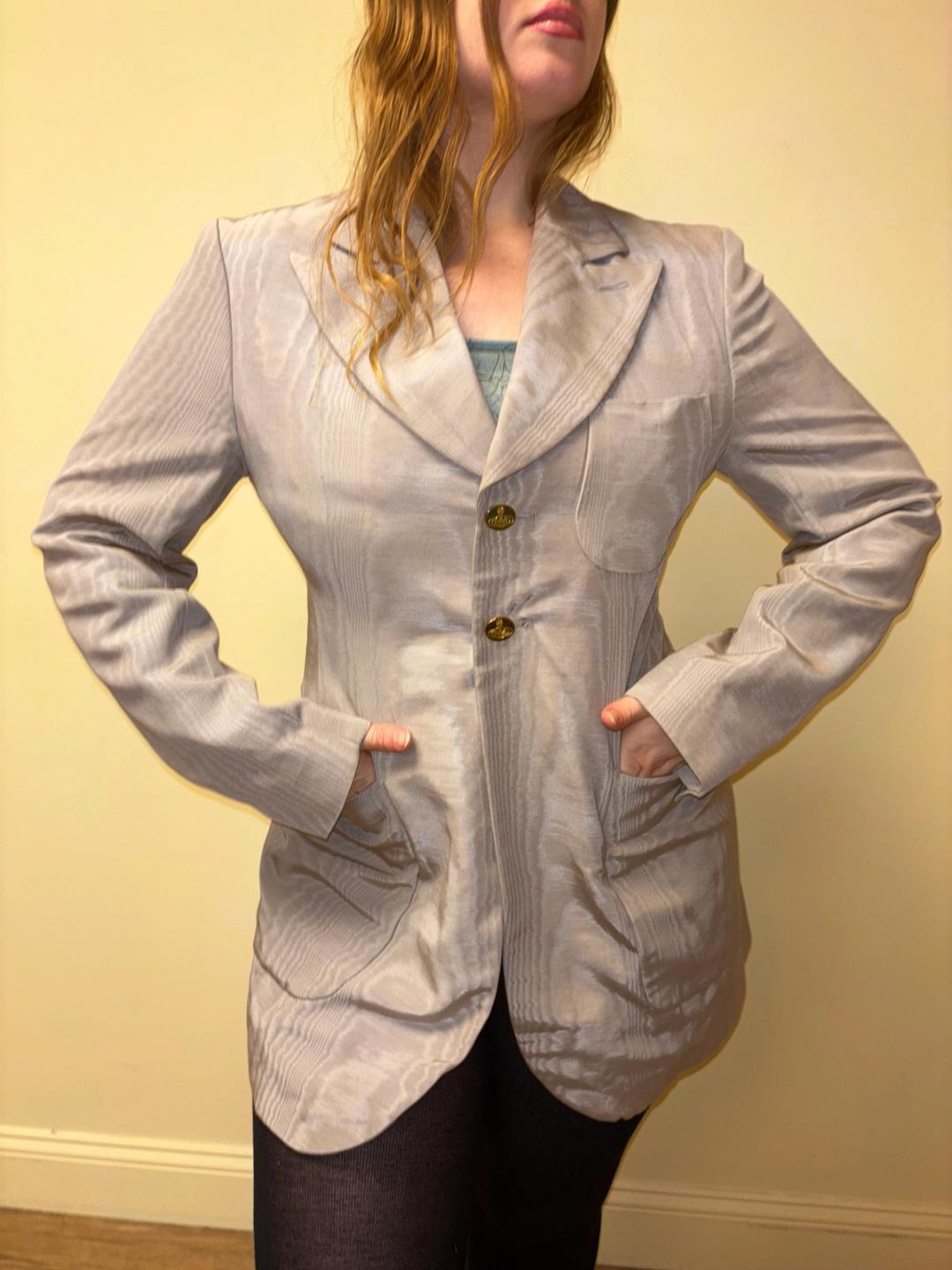 Lovely and rare Vivienne Westwood moiré tailored jacket dating to the 1990s. It has orb-engraved brass buttons down the front and on the sleeves, as well as large utilitarian pockets on the front. It is in fabulous, seemingly unused condition. Made in England, the original owner purchased it at World's End in the 90s.