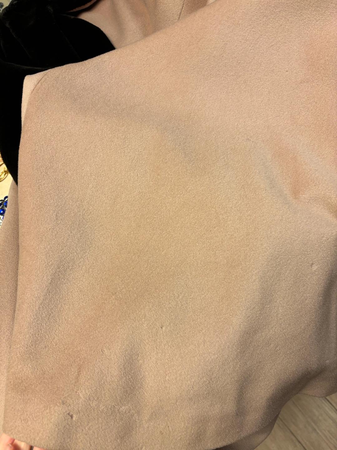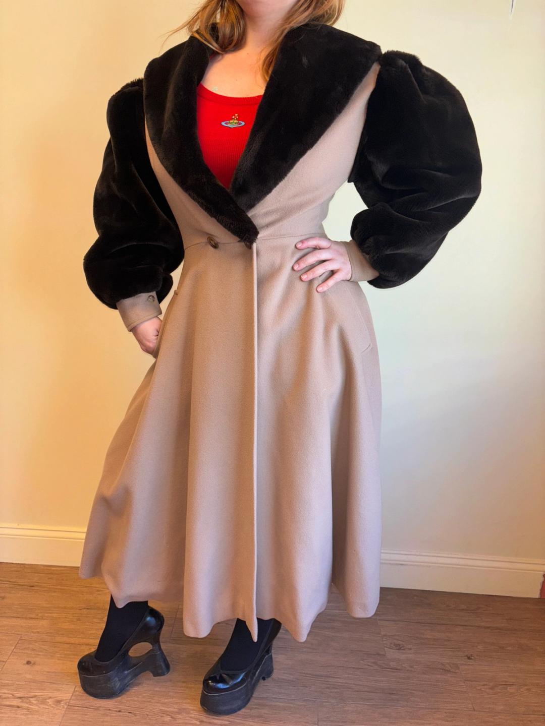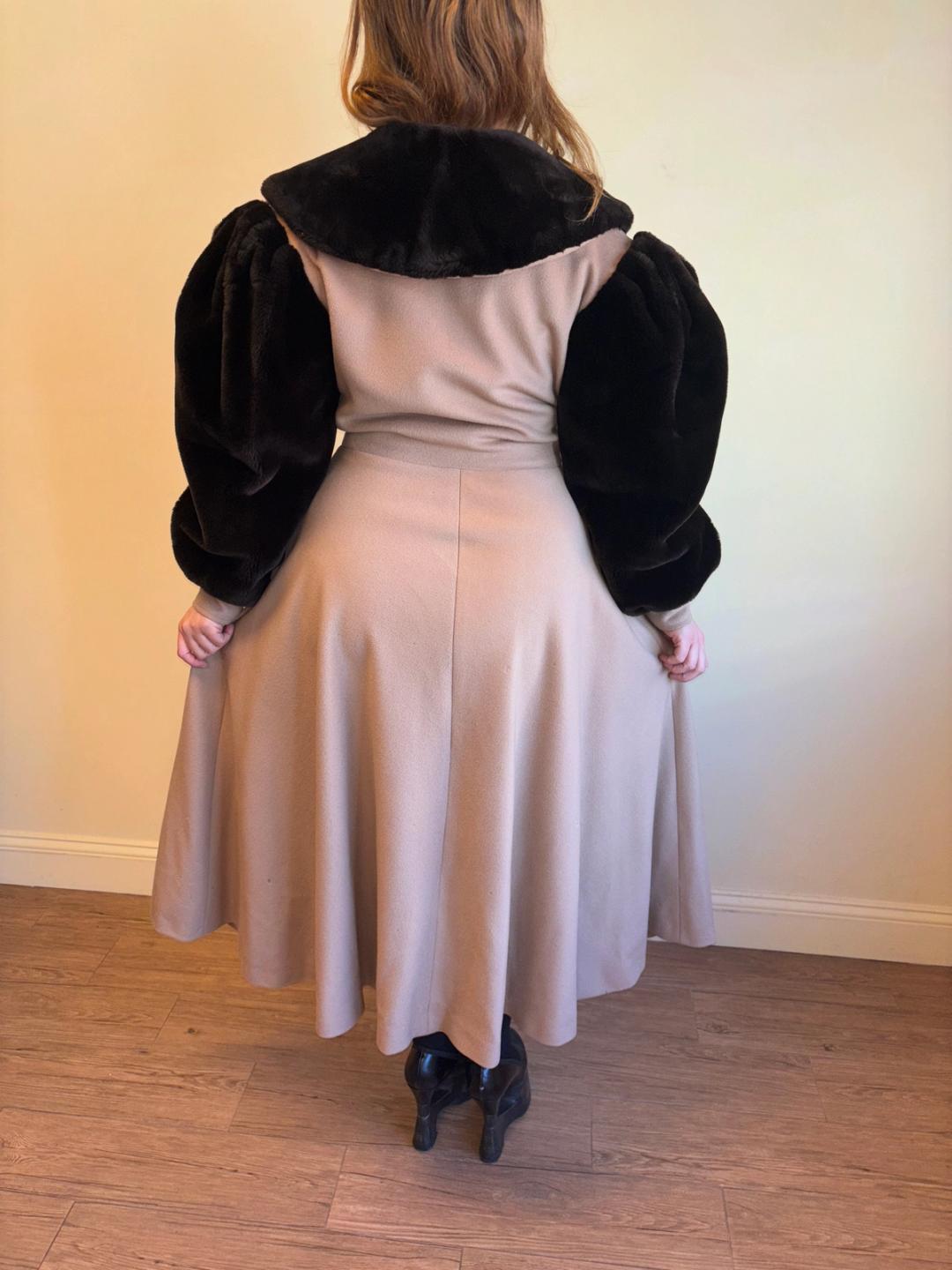 1980s does midcentury dramatic swing coat by Angelo Tarlazzi. The body is a soft camel mohair with plush faux fur sleeves and collar. It is lined in satin and closes simply in the front with two buttons. It is in beautiful condition apart from the lower hem which has scattered moth-bites throughout (see photos). It is priced accordingly, and the damage isn't noticeable when worn.