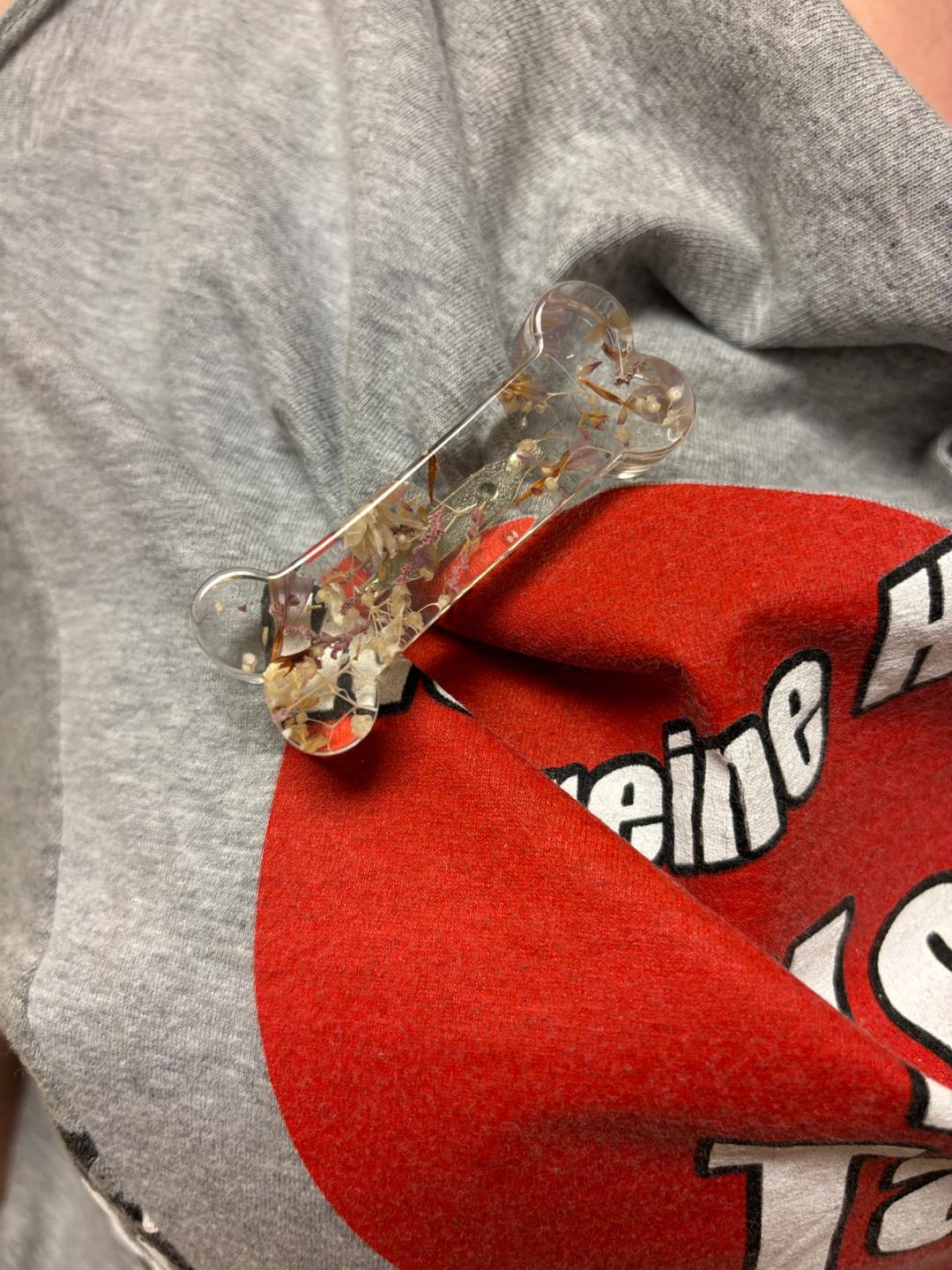 Unique brooch by Anrealage in the shape of a bone filled with beautiful dried flowers.