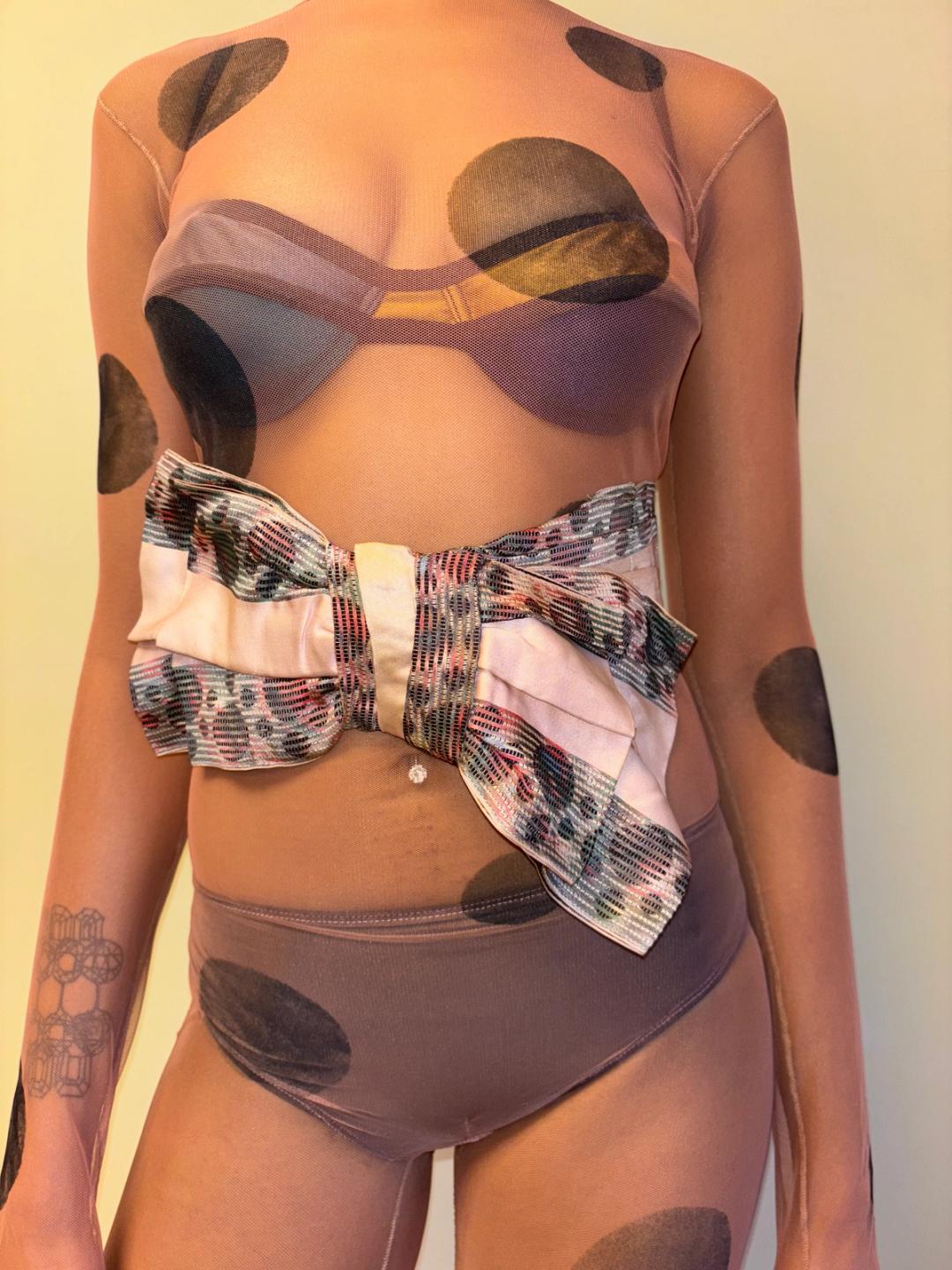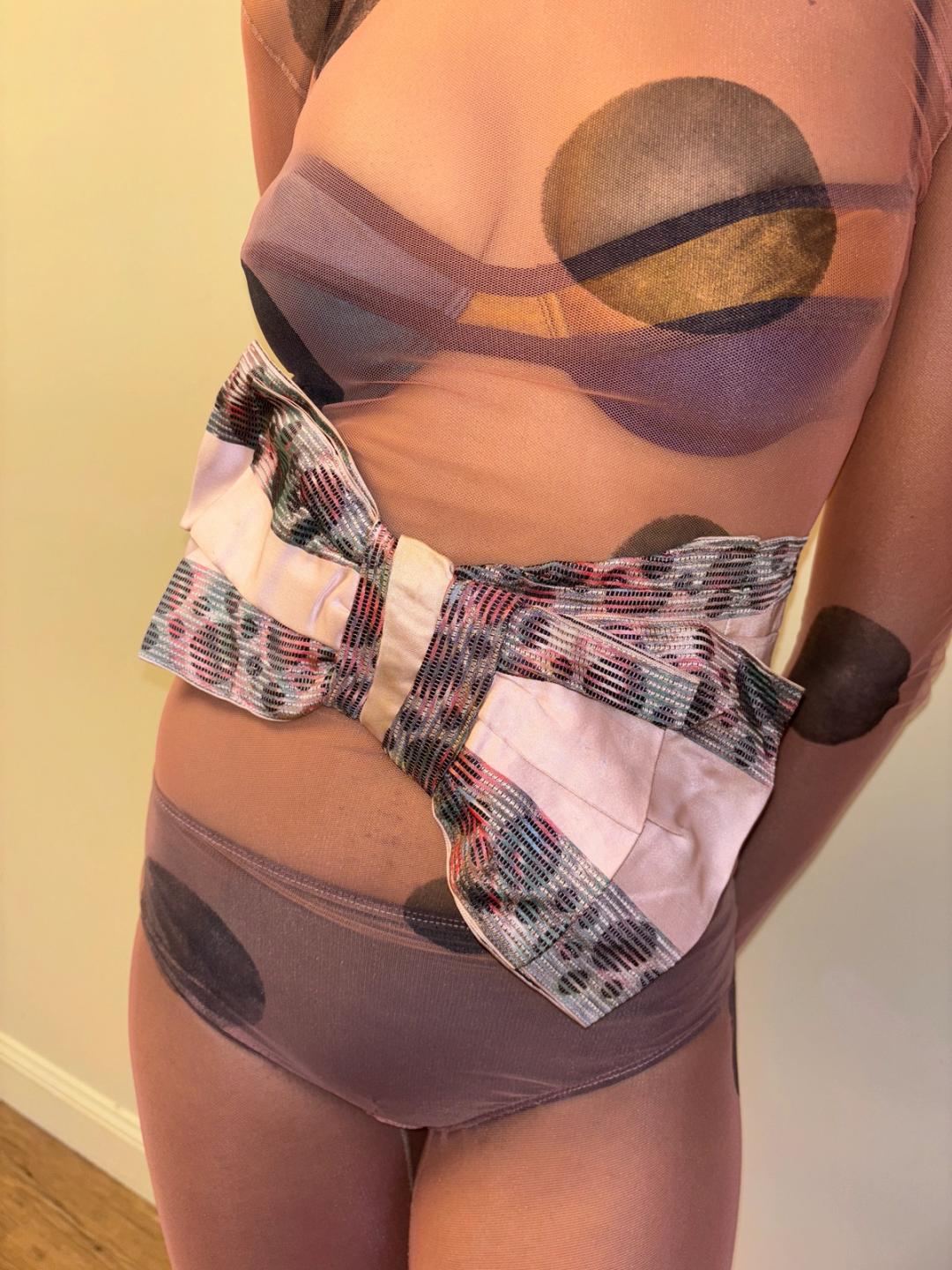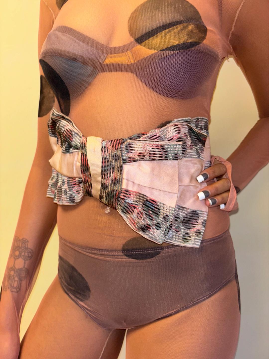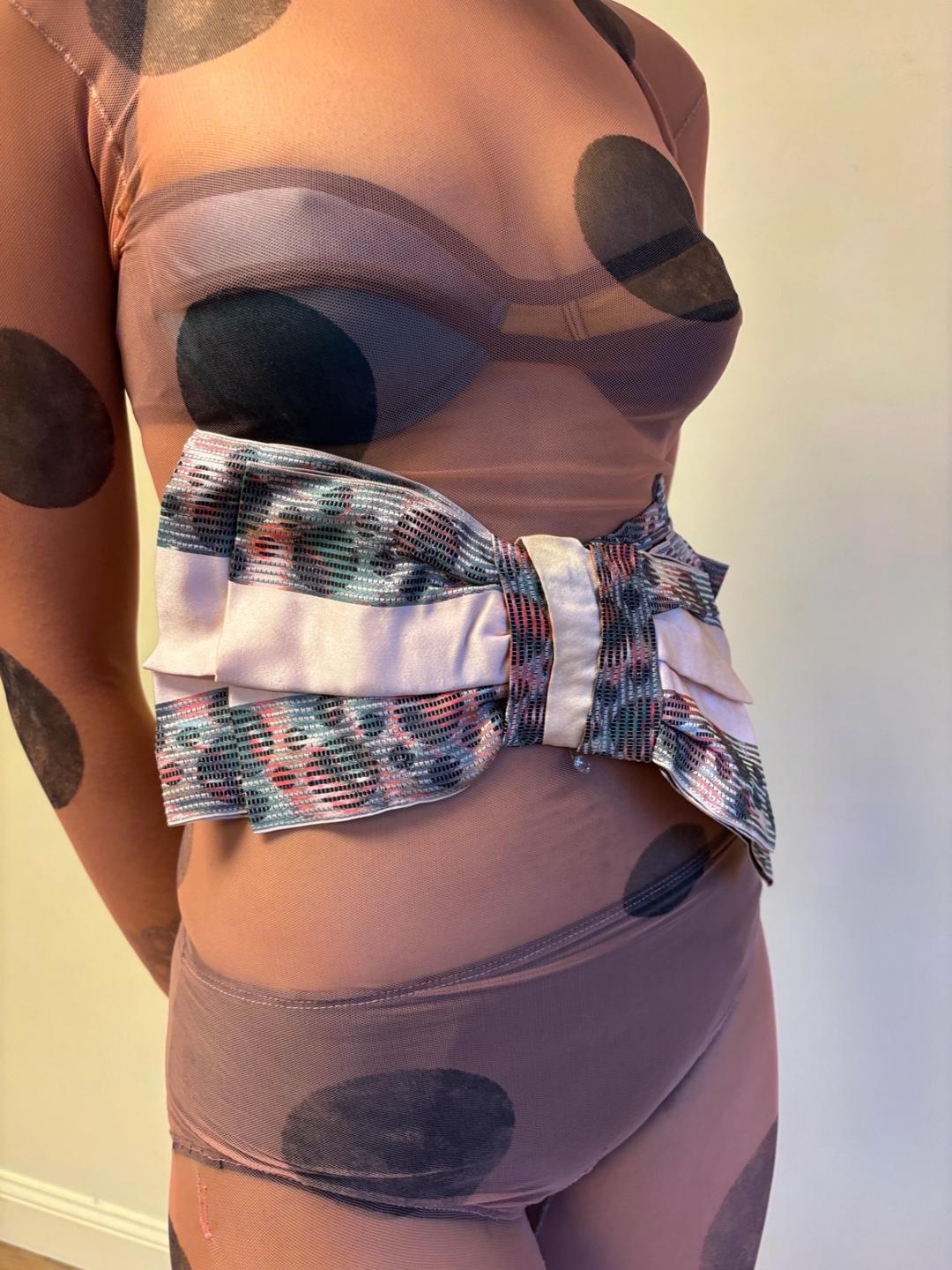 Stunning Edwardian or Victorian bubble print silk bow belt. The bow has boning for structure. It's in sturdy wearable condition.