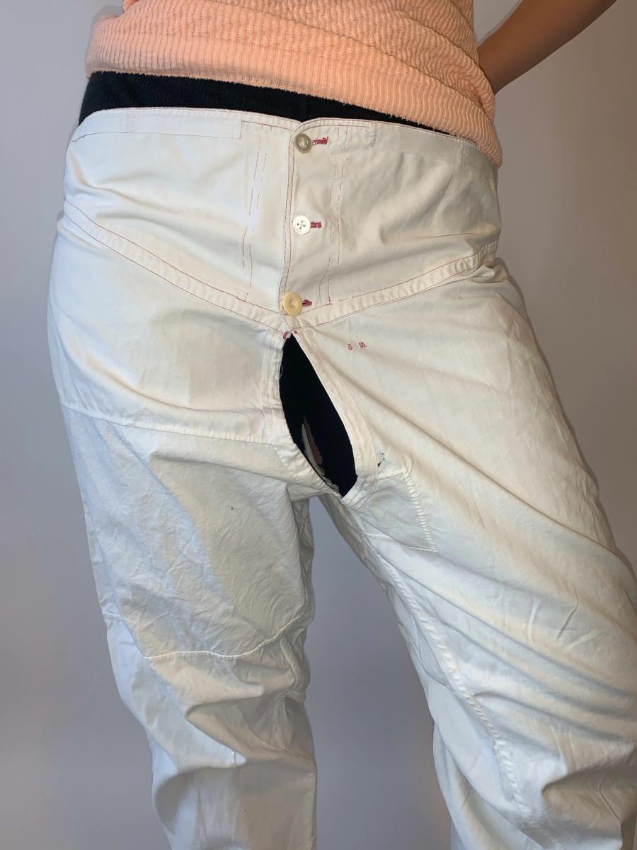 Antique sturdy cotton men's underpants from France from the late 1800s/ early 1990s. The pants have very unique pink stitching throughout, pearl buttons, and tiny embroidered initials near the crotch. The pants have a relaxed loose fit but are tighter around the waist. Lovely button down front and back button details. The pants are ruched on the bottom and have a split crotch. It looks like there were some repair patches expertly added over time that make them even more unique! They're in excellent vintage condition. Unisex.