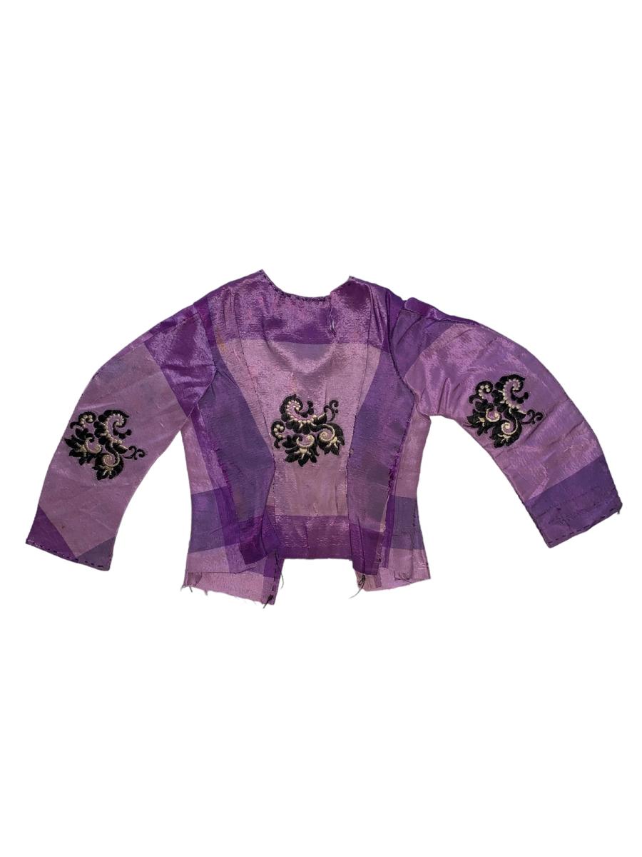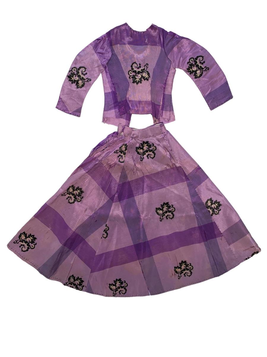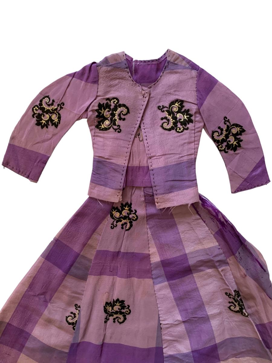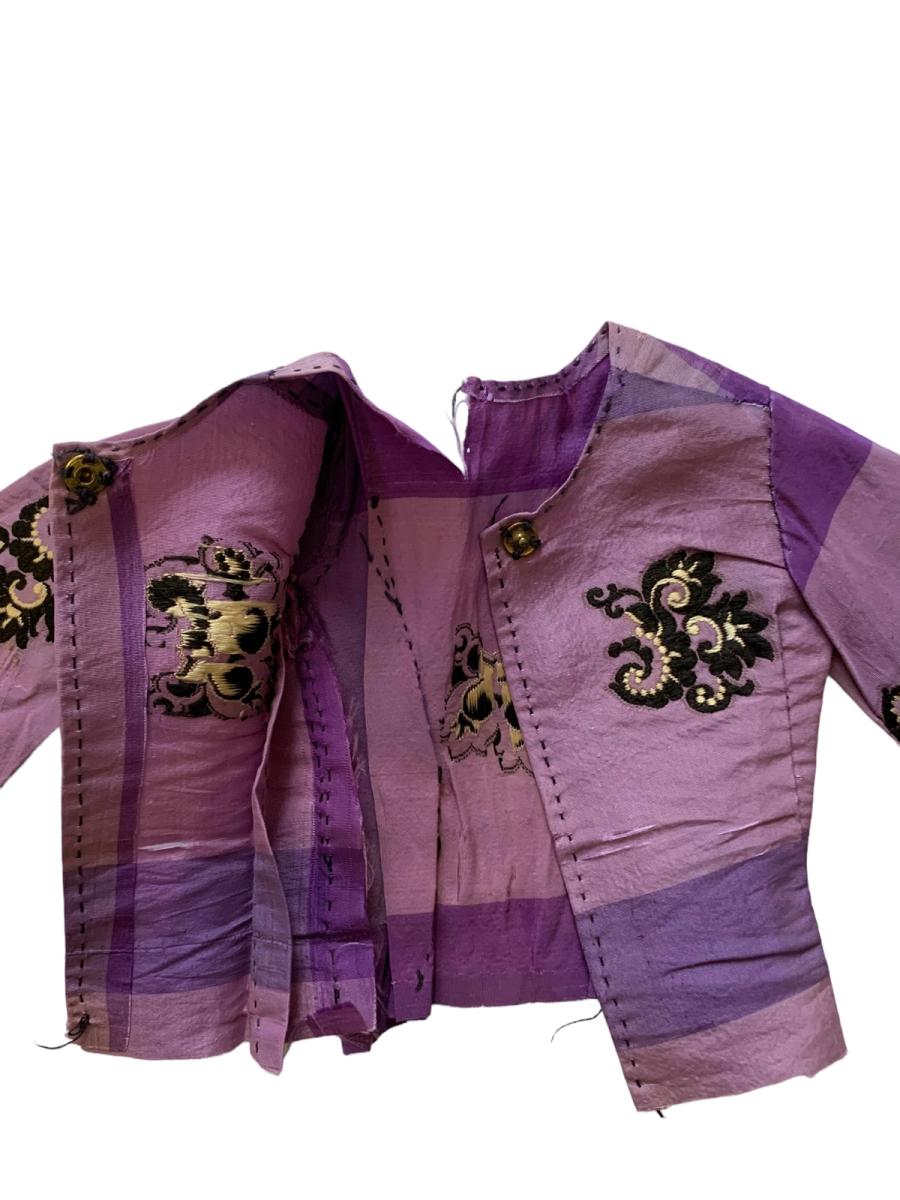 Lot of antique doll clothing from France. There's one purple dress set from the 1850s or 1860s. This set is made of silk taffeta with unique floral weaving. The dress is handmade possibly made from the remnants of a woman's dress. There's also a pair of 1930s hand knit dresses in the lot.