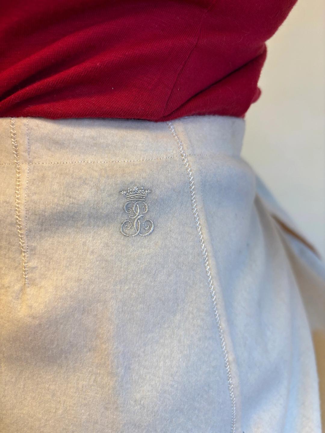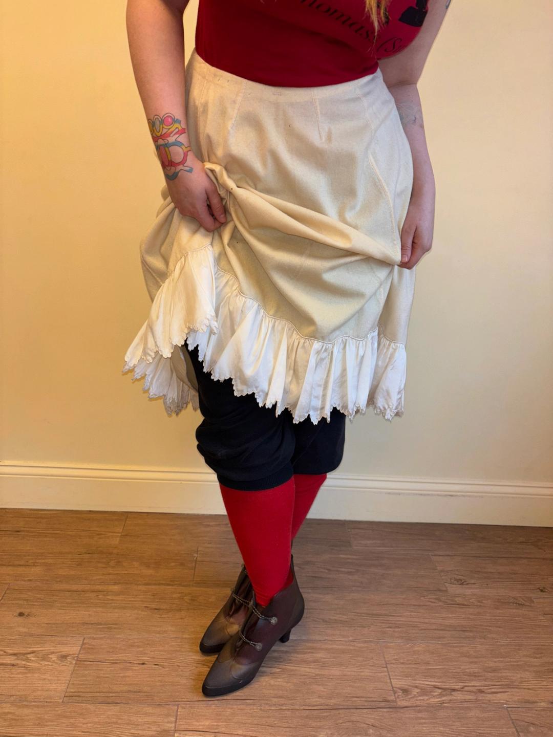 Late Victorian or Edwardian light yellow wool flannel winter petticoat with ornately scalloped silk trim. Many late Victorian and Edwardian petticoats were actually cut right under the knee for greater mobility. The skirt has beautiful embroidery on top of the seams, a delicate monogram, as well as on trimming the scalloped ruffles. The skirt is in strong and wearable condition, however it does have scattered moth bites to the fabric (see photos).