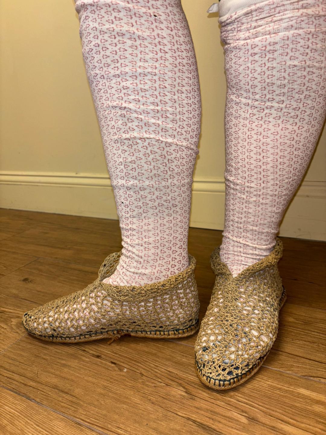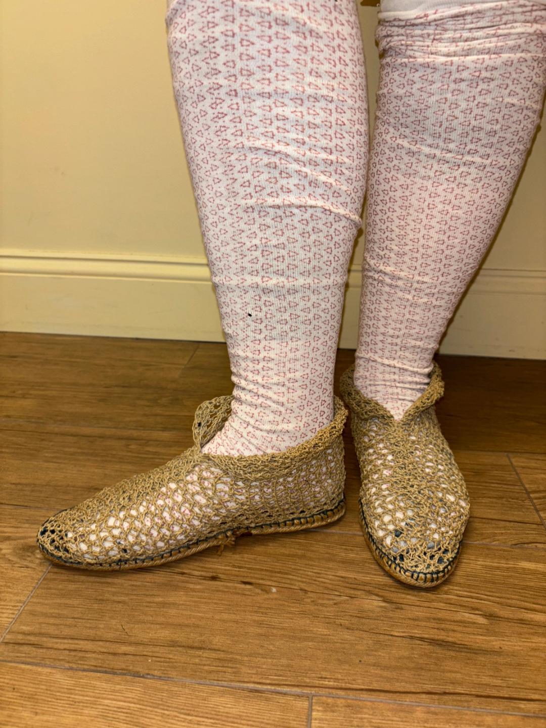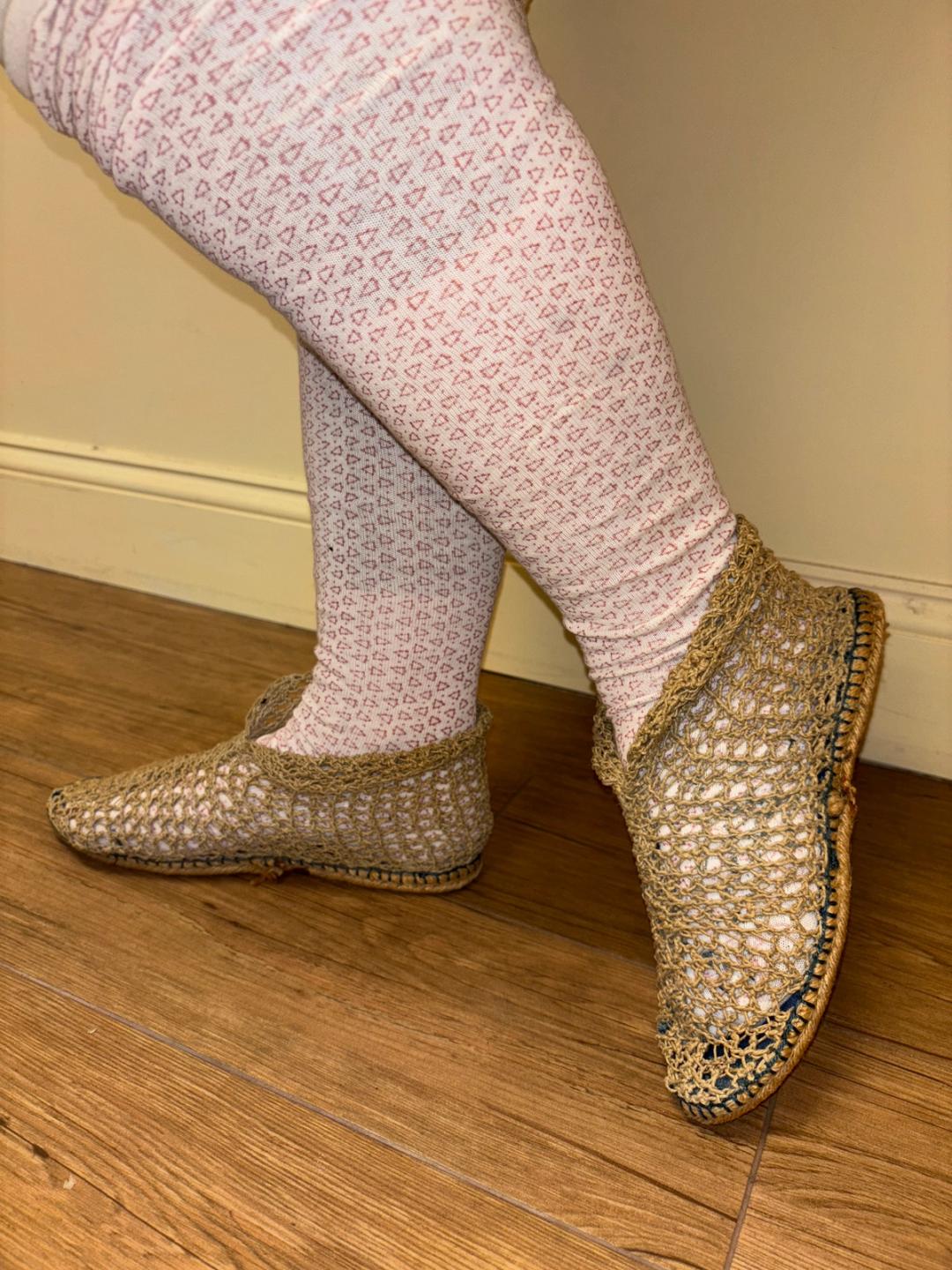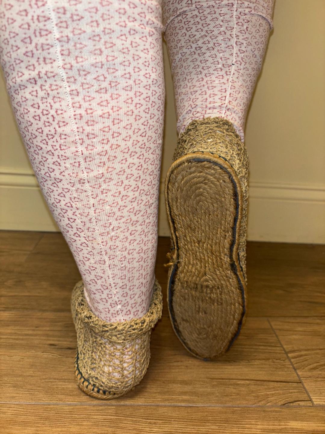 Rare knotted rope beach shoes with robe soles dating to 1930 from France. They are in good condition and will fit a 37/38. Shown on a wide 7.5 foot.