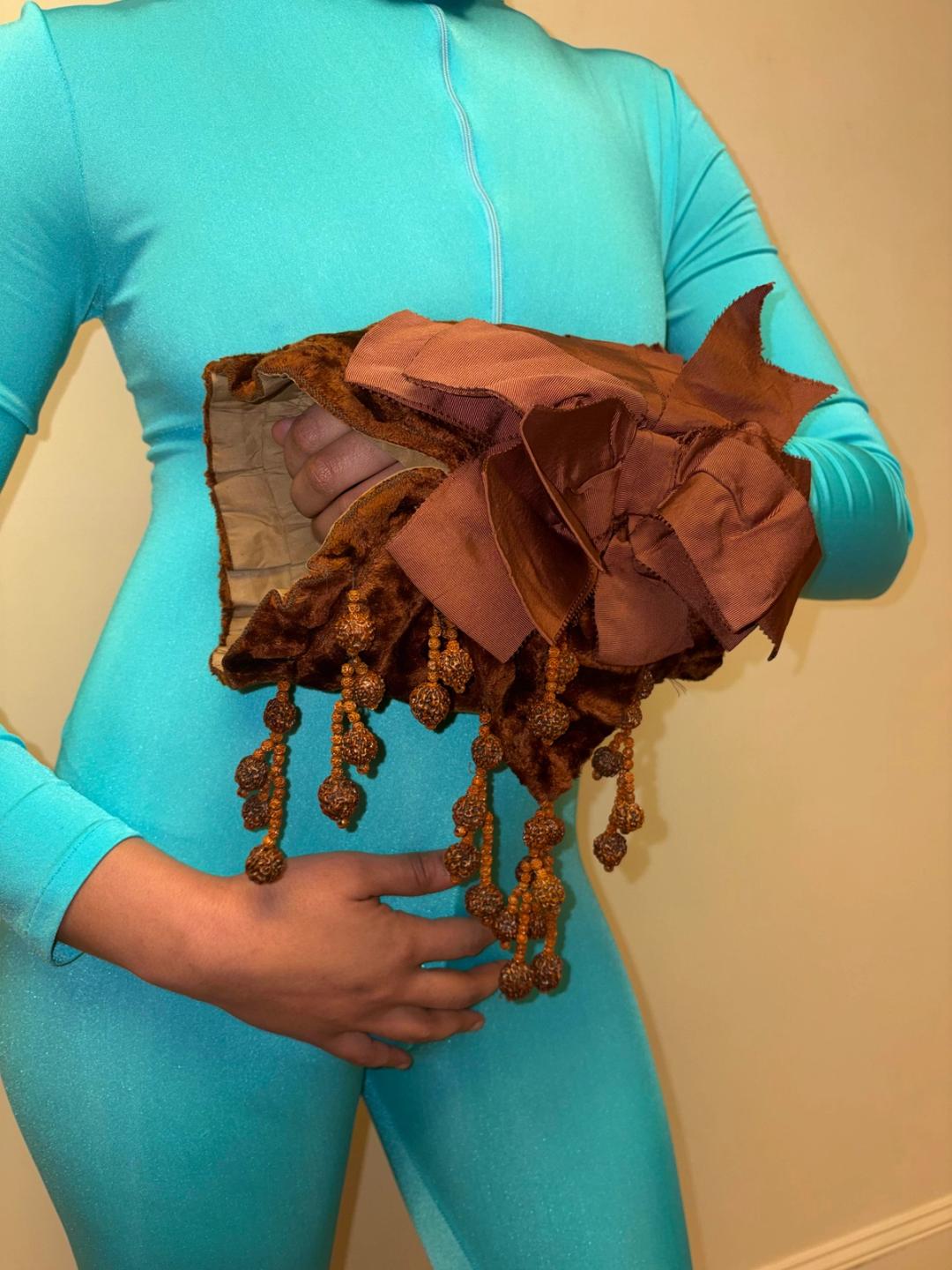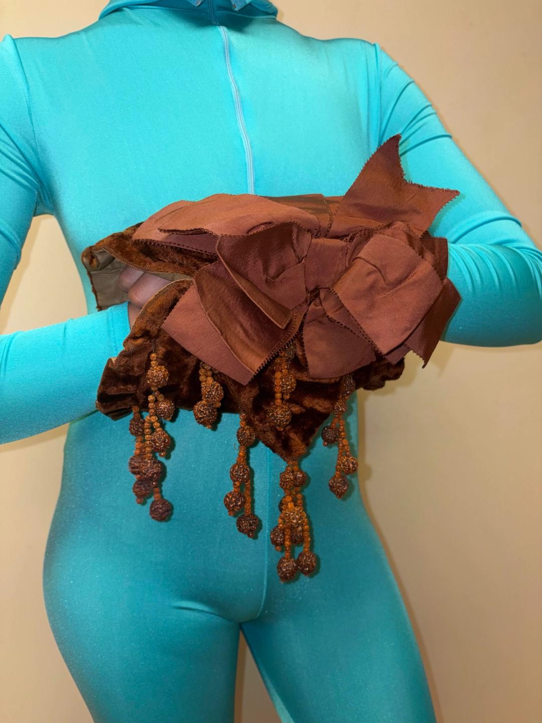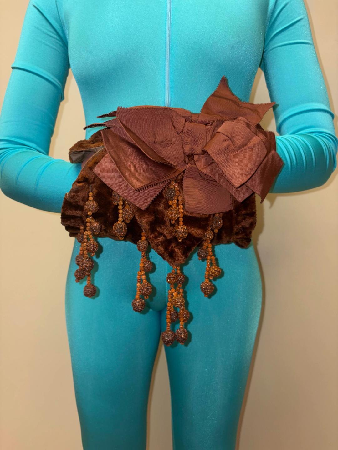 Early 20th century muff made with brown velveteen and lined with gathered silk. Decorated with dangling seed beads and matching grosgrain ribbon. In excellent antique condition, strong and wearable.