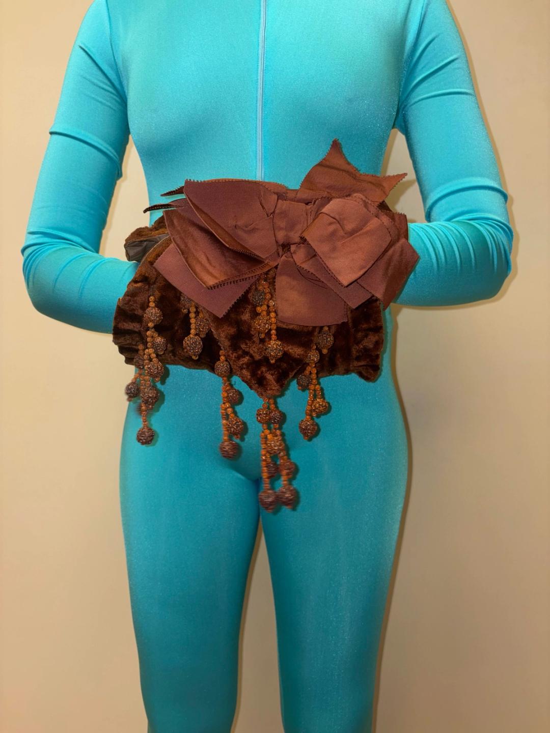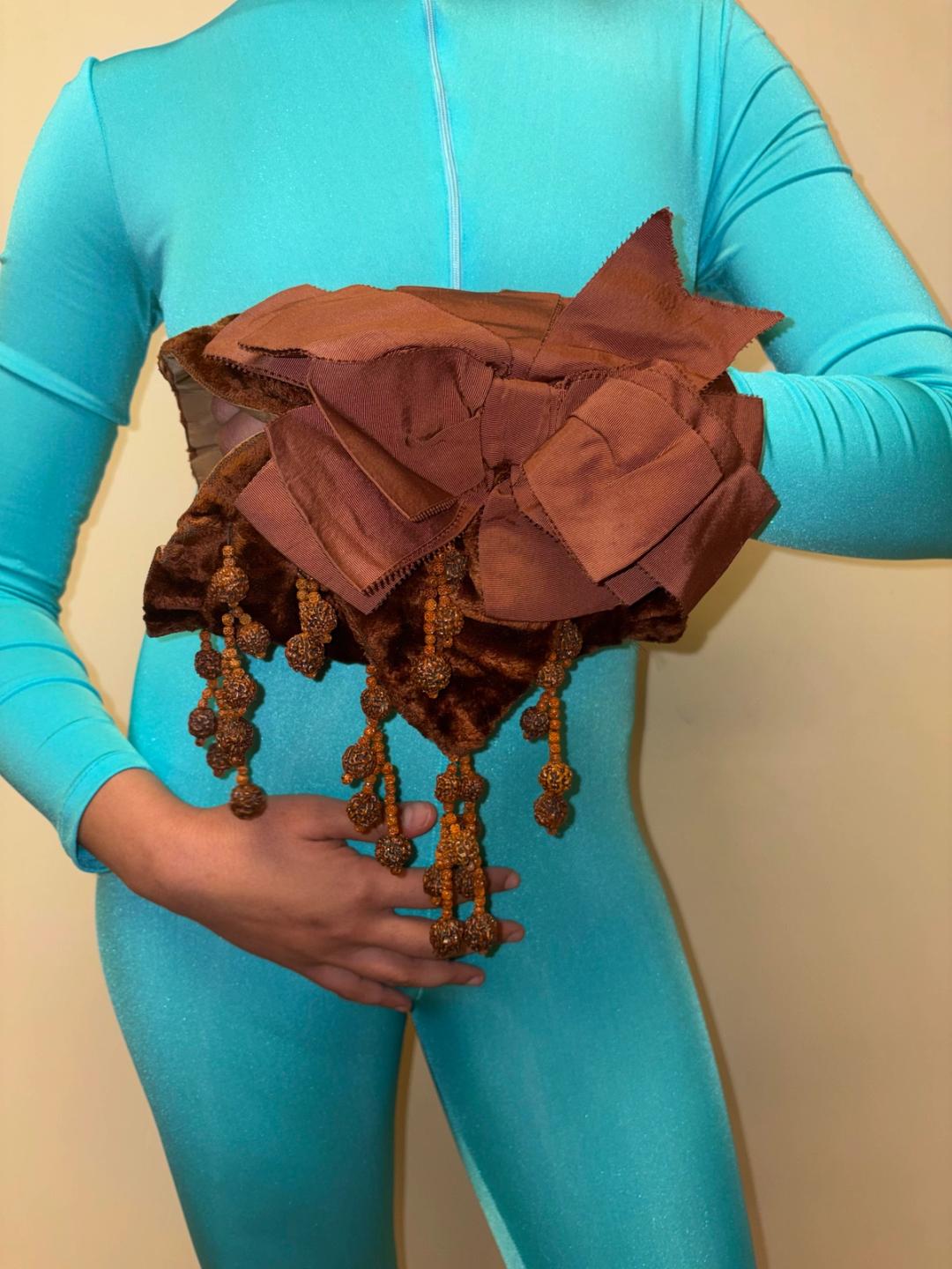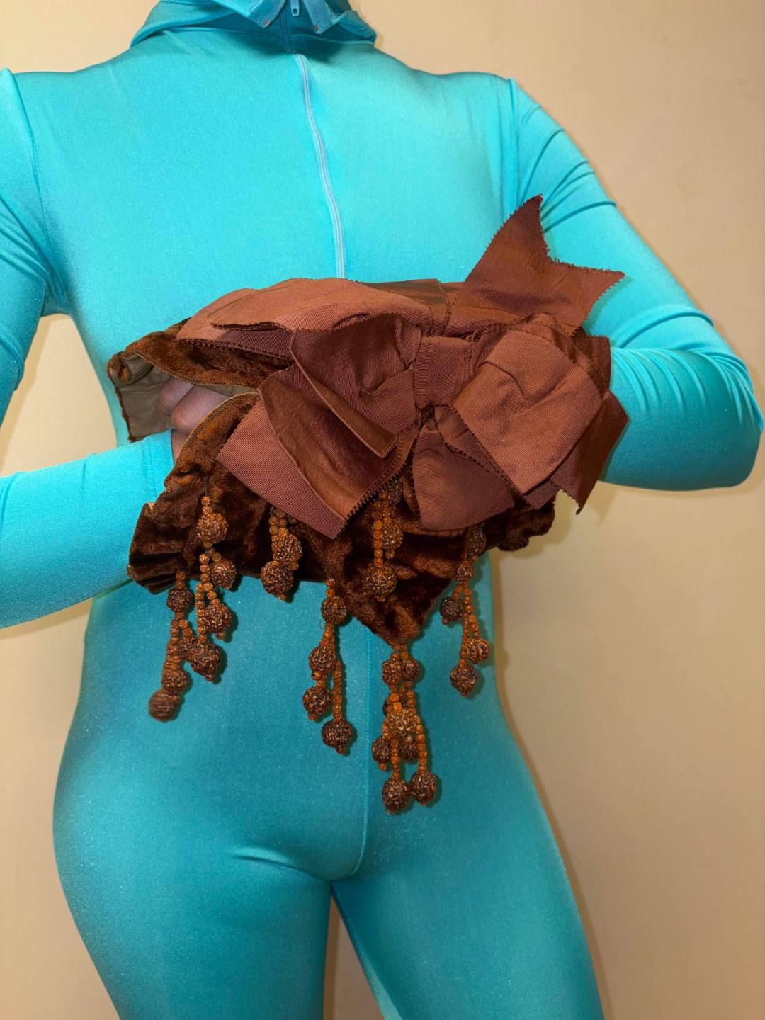 Early 20th century muff made with brown velveteen and lined with gathered silk. Decorated with dangling seed beads and matching grosgrain ribbon. In excellent antique condition, strong and wearable.