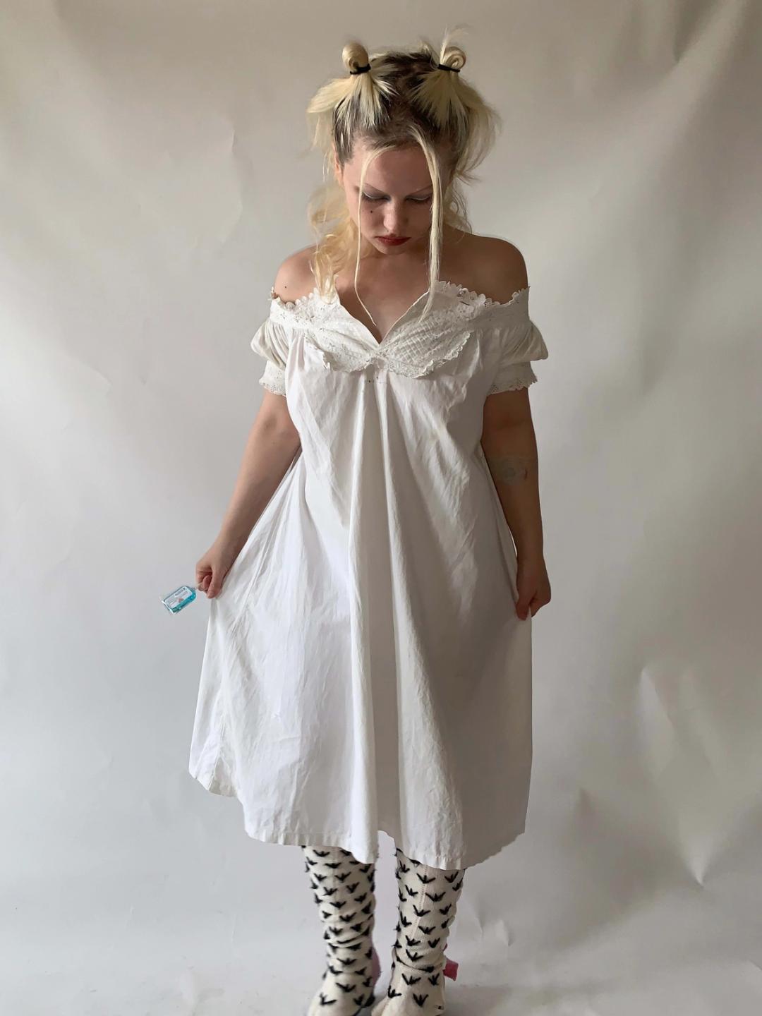 Sultry Victorian chemise with beautiful eyelet yoke with tons of whitework embroidery. The off-the-shoulder cut dates it as 1850s-60s. The nightgown features a beautiful inscription with the name of its original owner in ink.