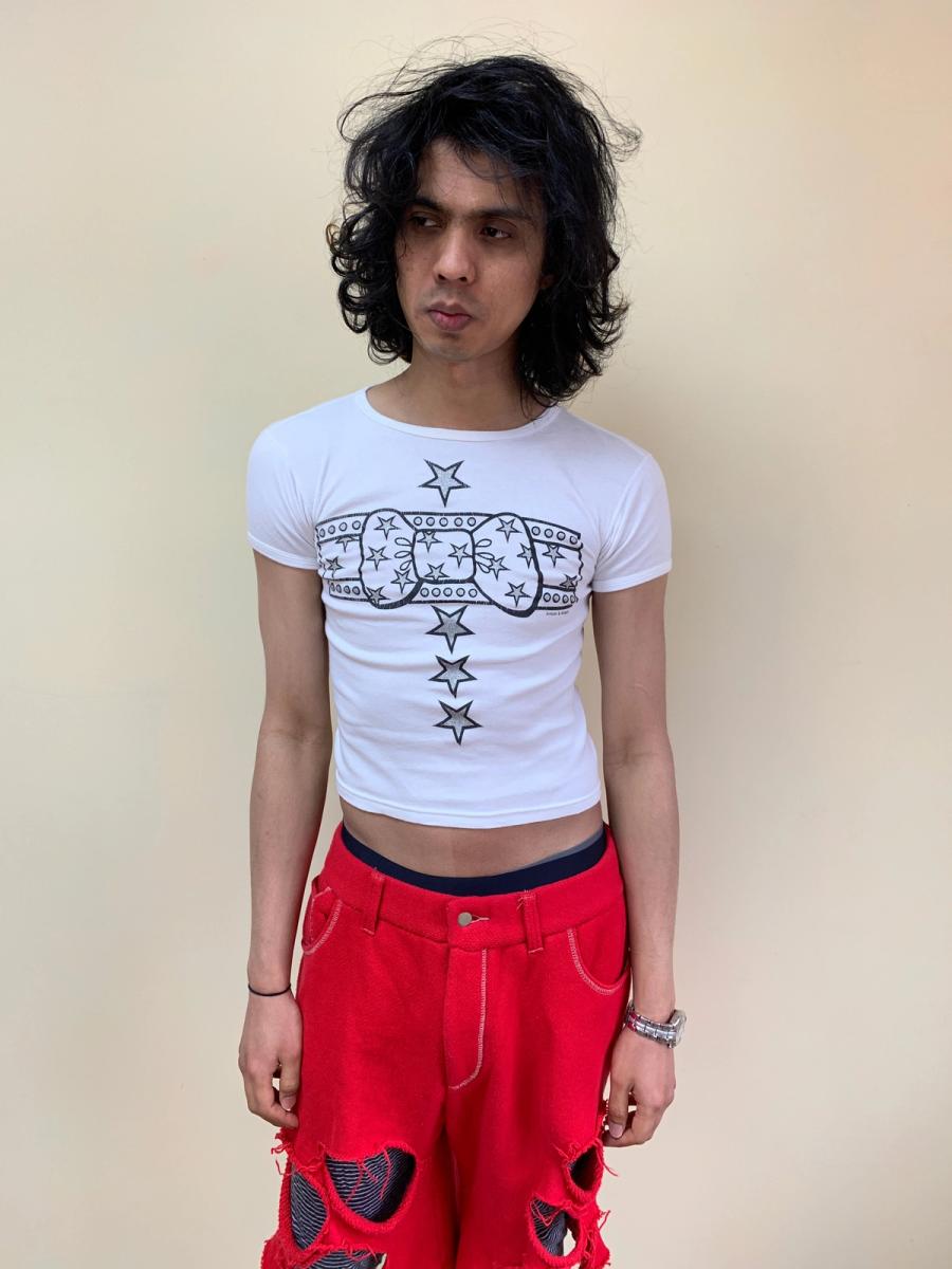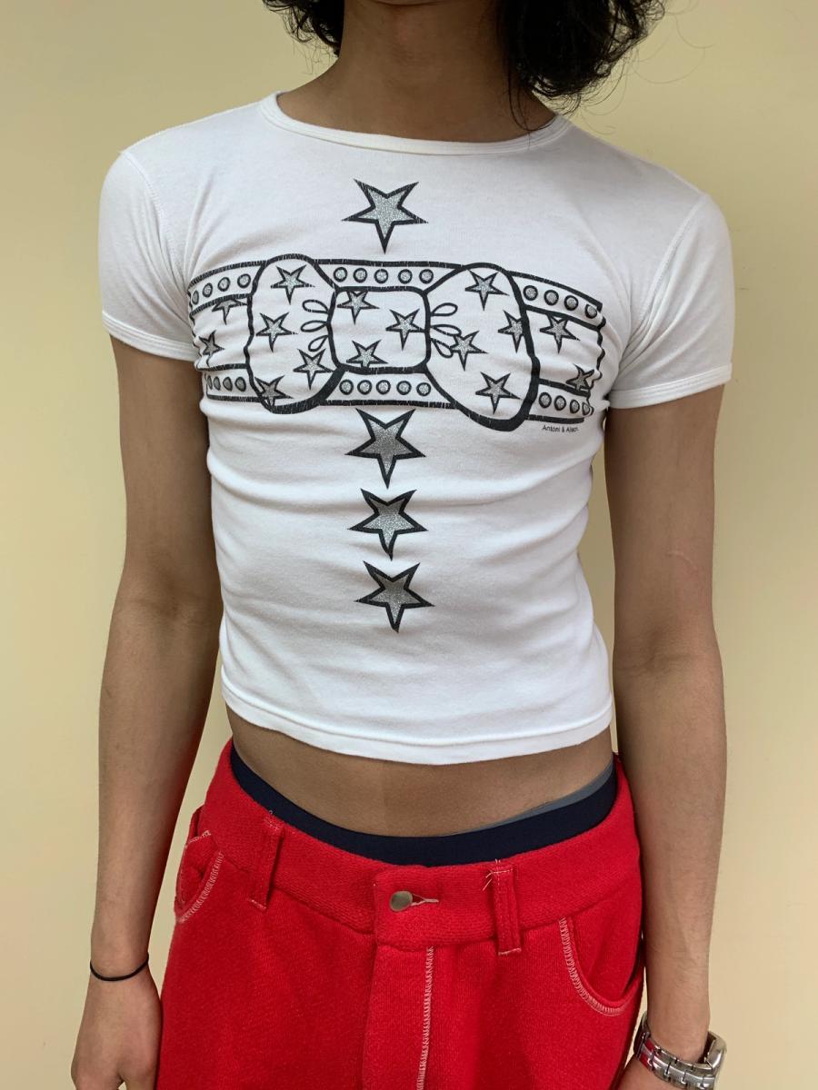 Rare vintage t-shirt by label, Antoni & Alison. The shirt features a graphic bow at the center with sparkle embellishment. Unisex. Has some stretch. There is some minor cracking.