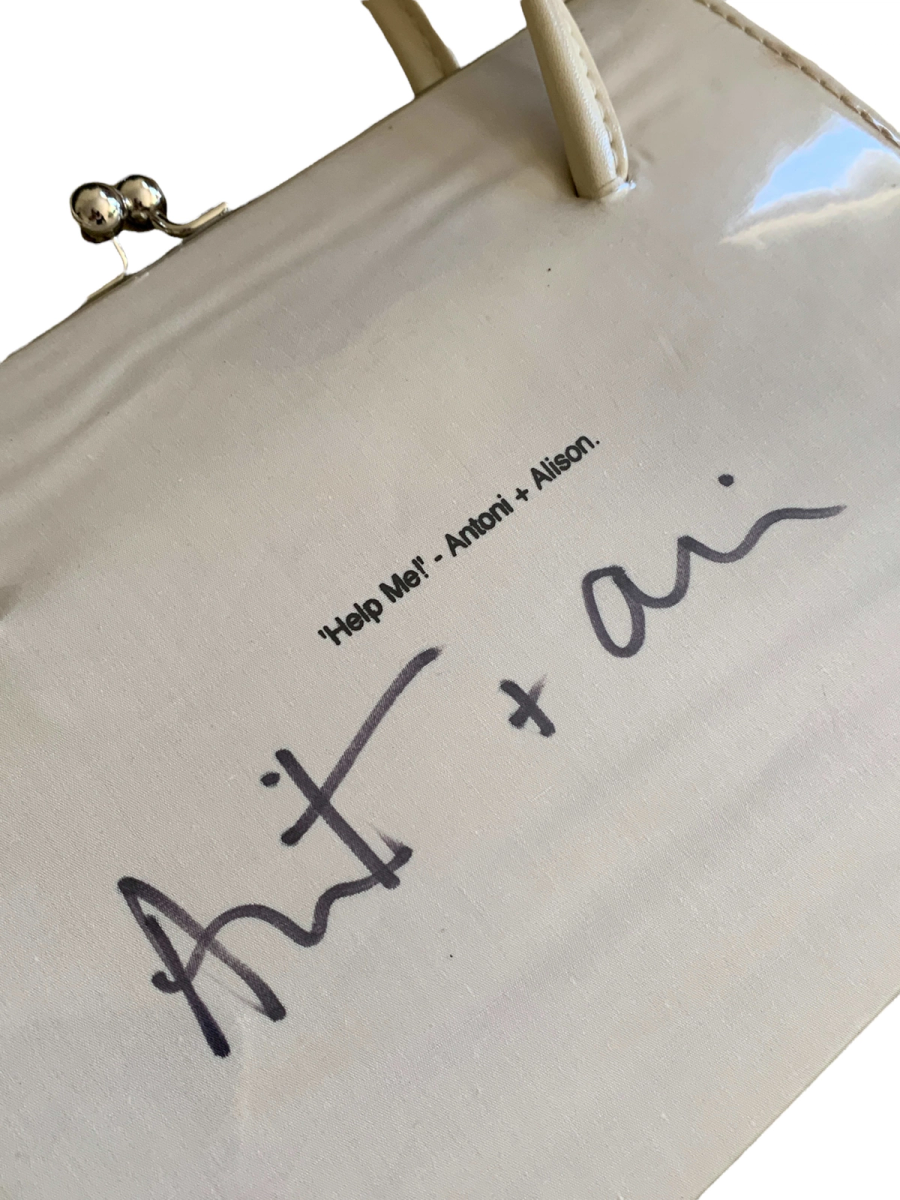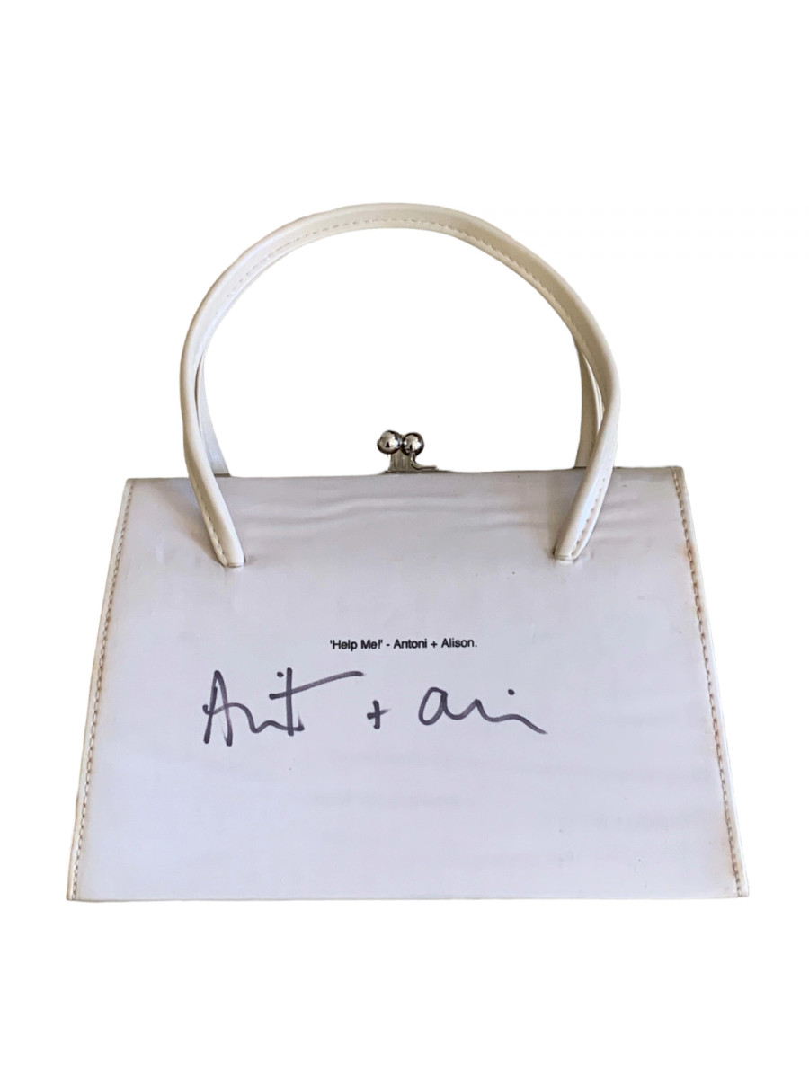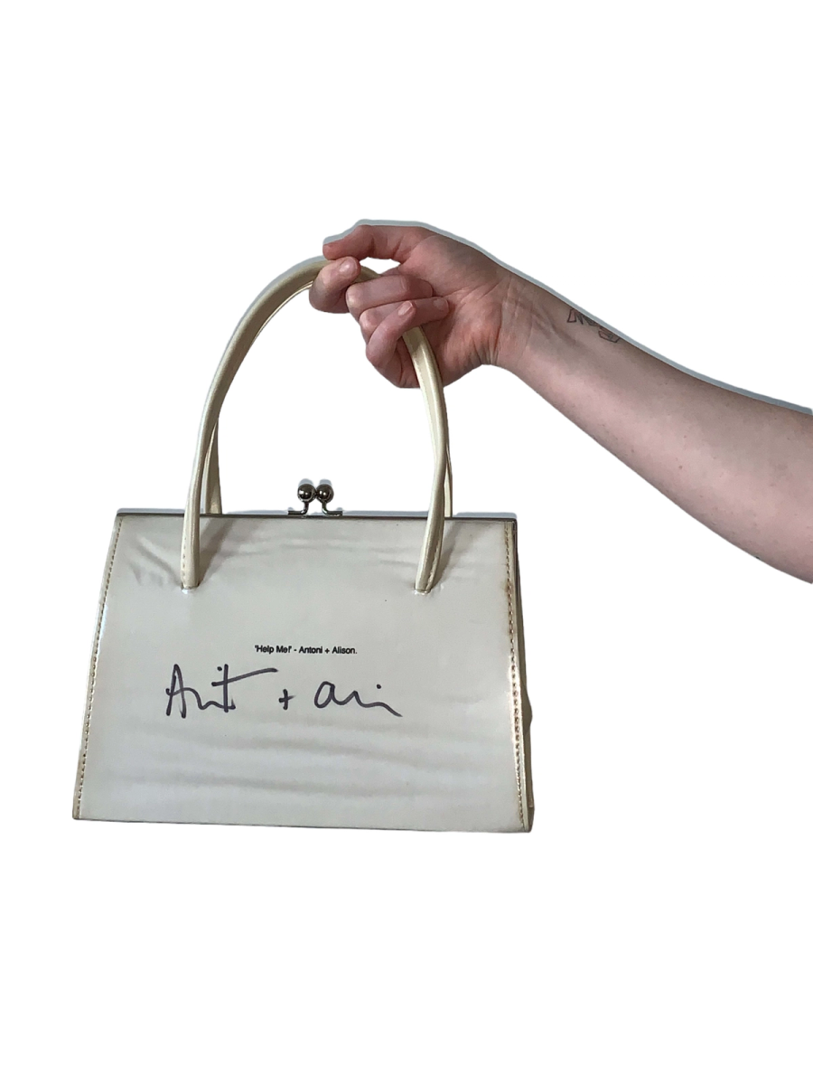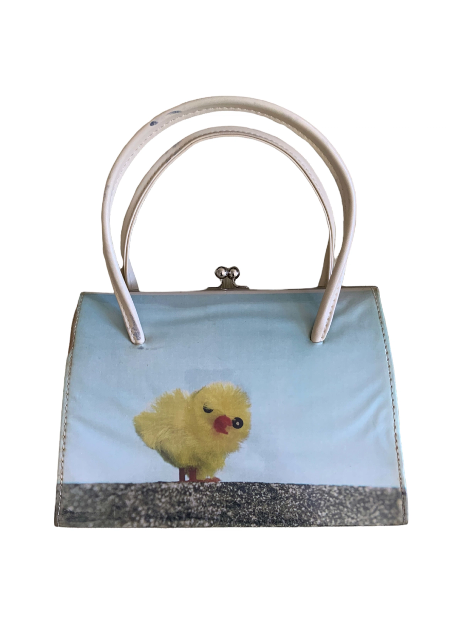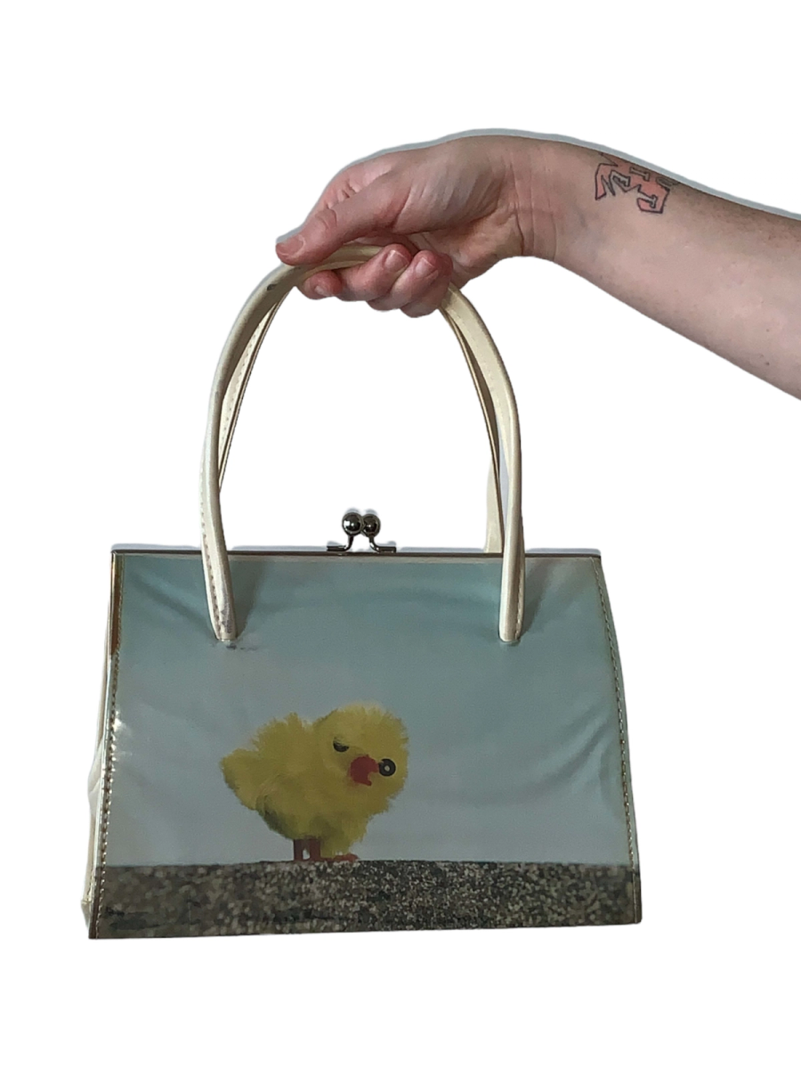 Antoni & Alison rare PVC photoprint bag depicting a fake chick. The bag is signed by the designers and titled "Help Me!" It is a kisslock closure with a velvet interior.