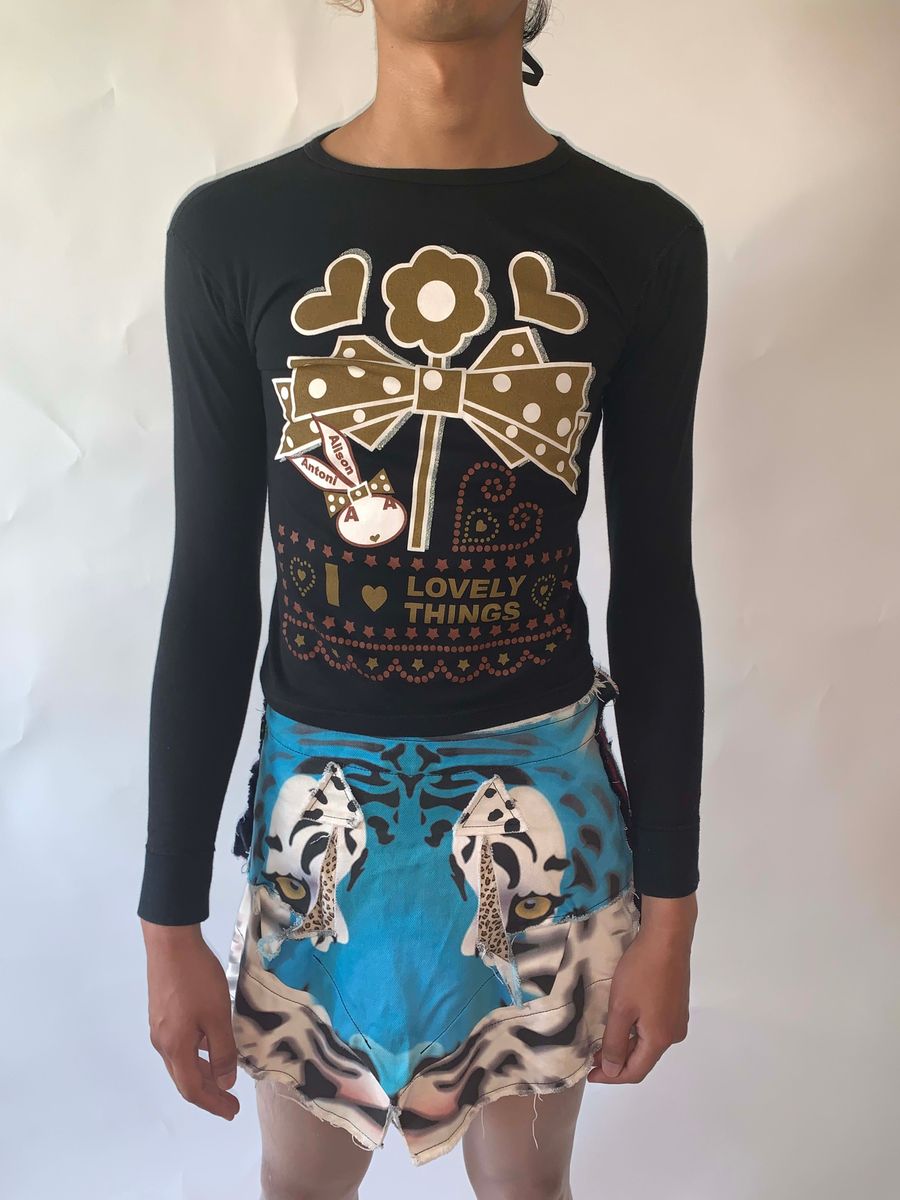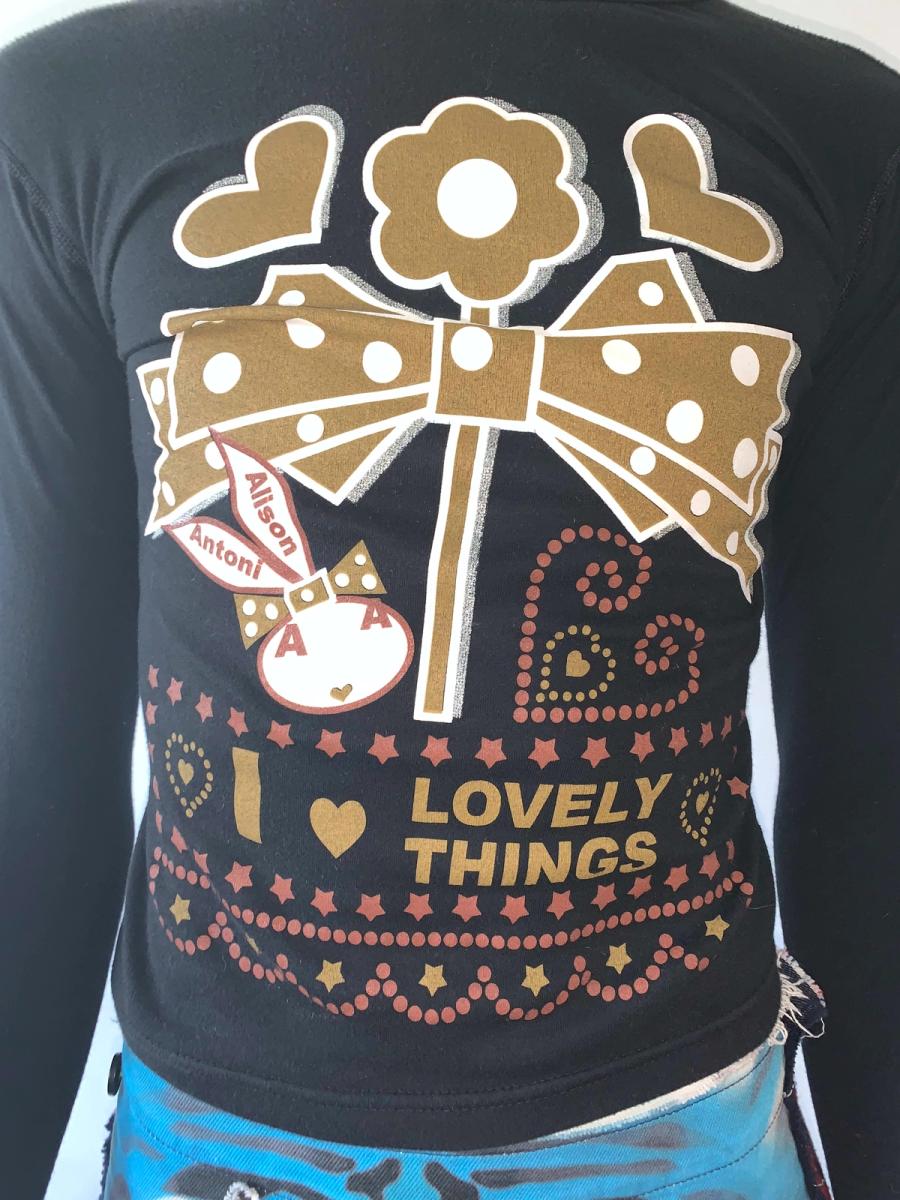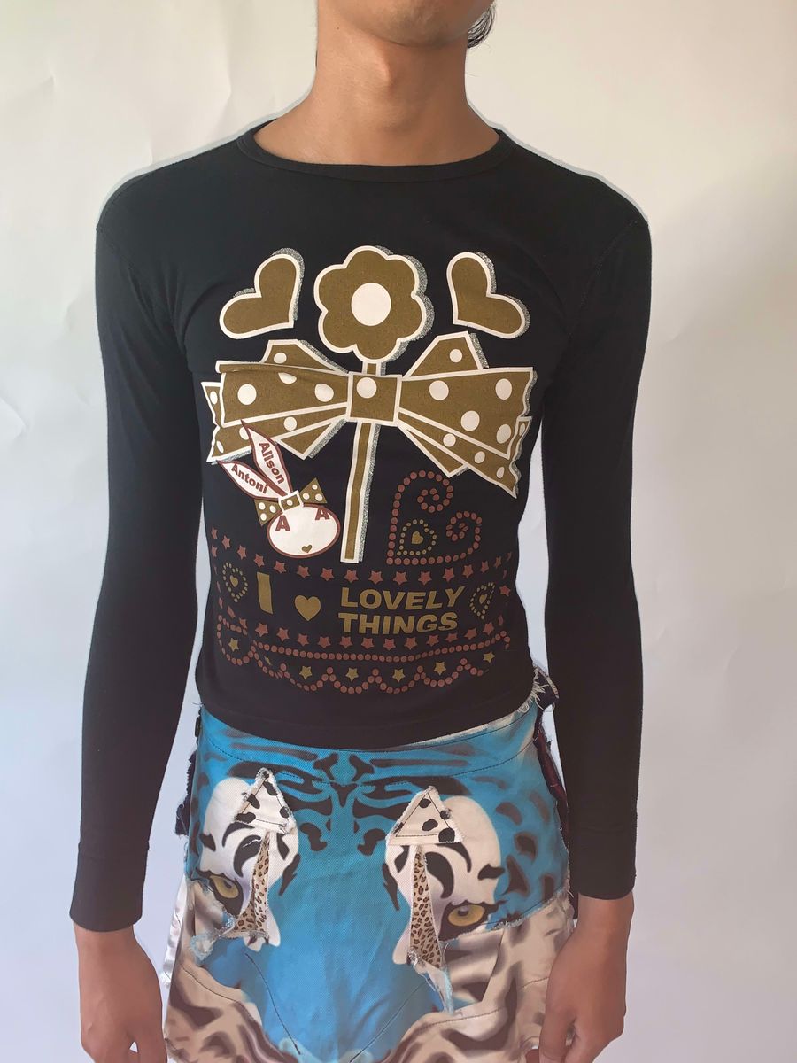 Early 2000s t-shirt from cult label, Antoni & Alison. They became known for their humorous and poetic text based garments, like this one. The long sleeve shirt features the text, 'I Heart Lovely Things' and images of a bunny amongst flowers and hearts. It's made of a stretch cotton.