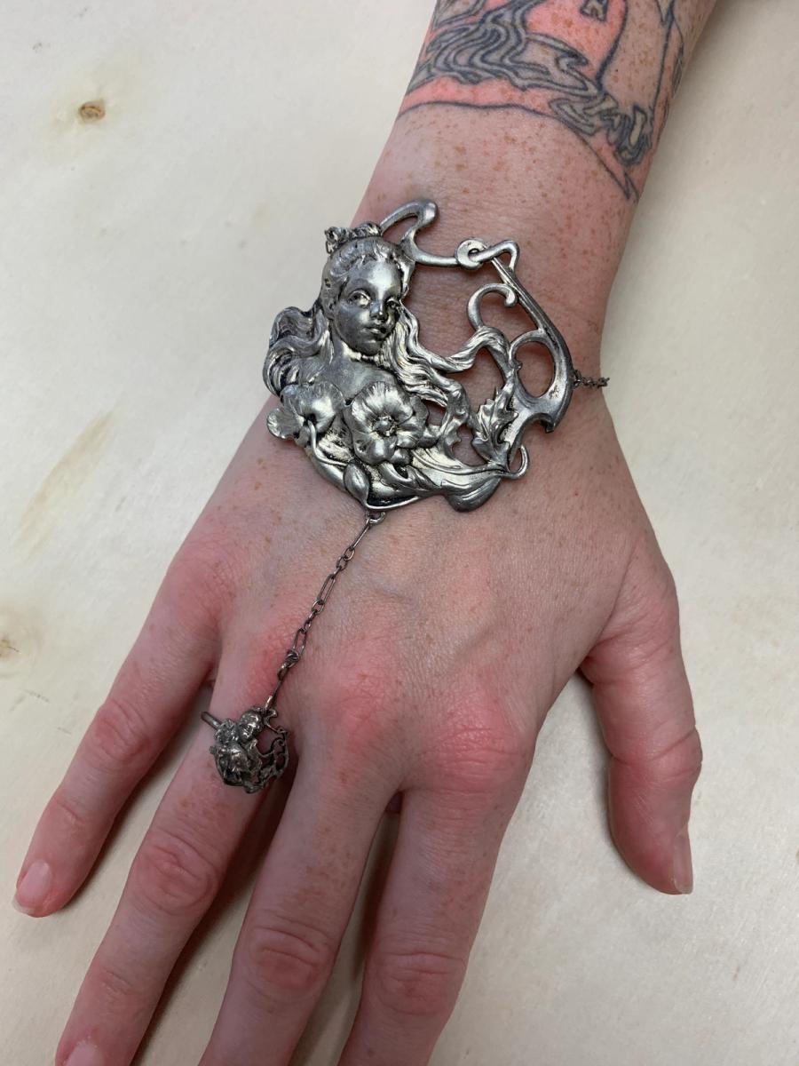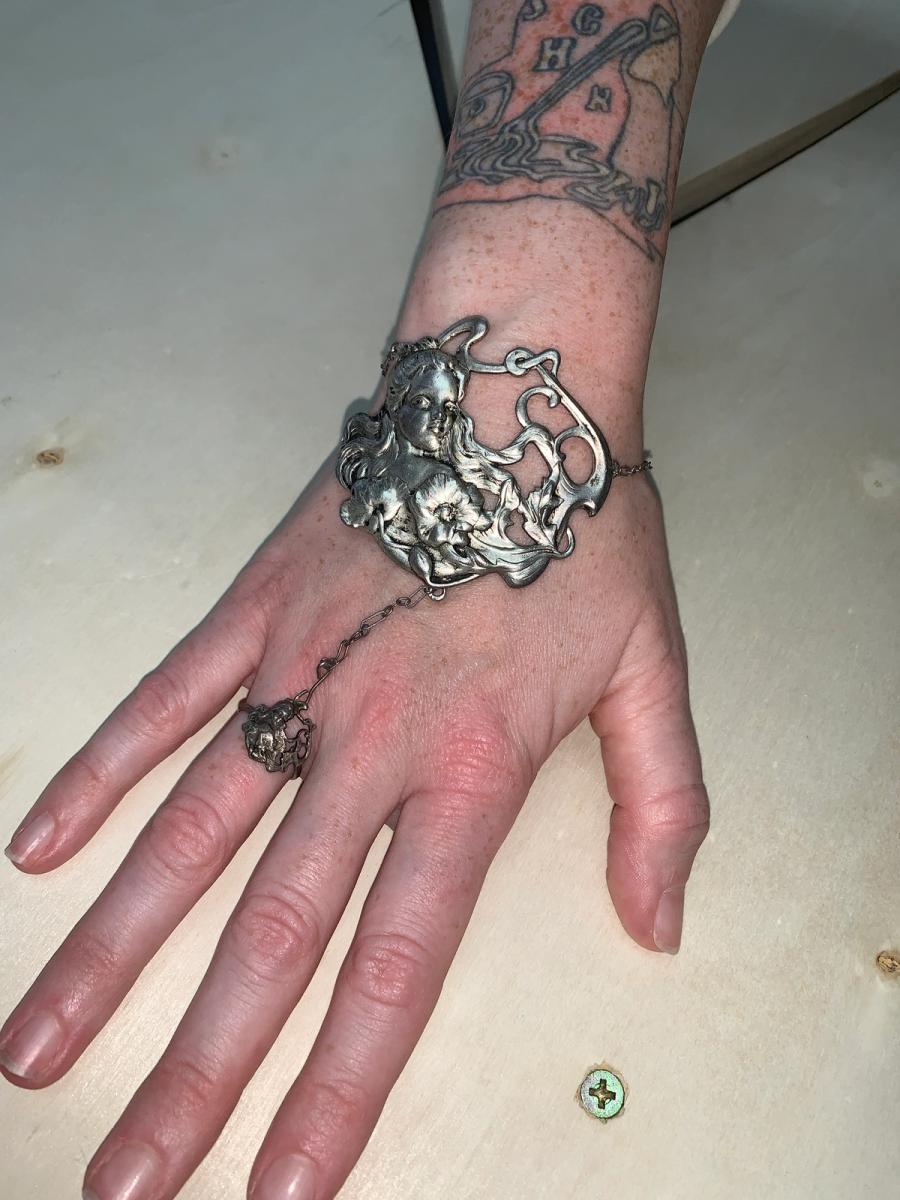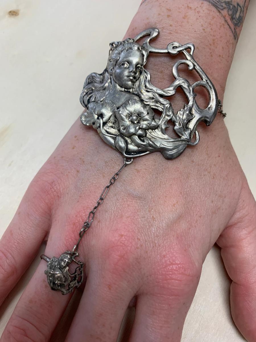 Rare art nouveau style hand jewelry piece from Paris, France. The jewelry piece is unique in that it includes a bracelet attached to a ring. It's either made of white brass or silver, it's not stamped. The bracelet and ring depict a girl with art nouveau decoration. The size of the bracelet is adjustable.