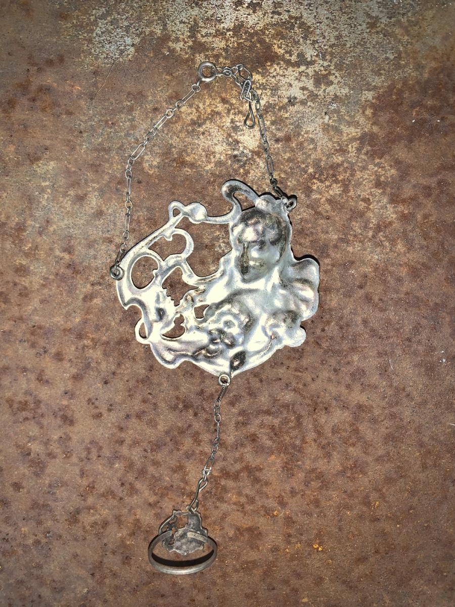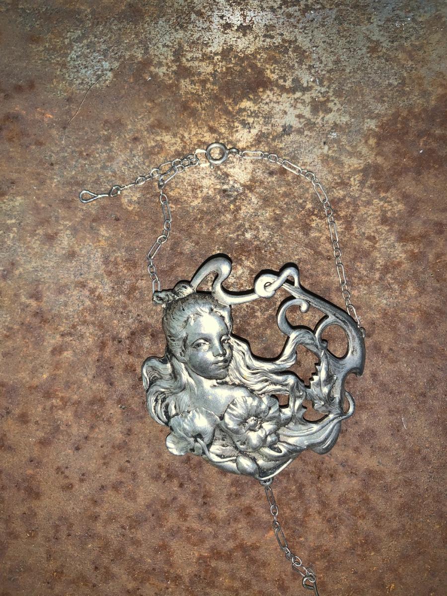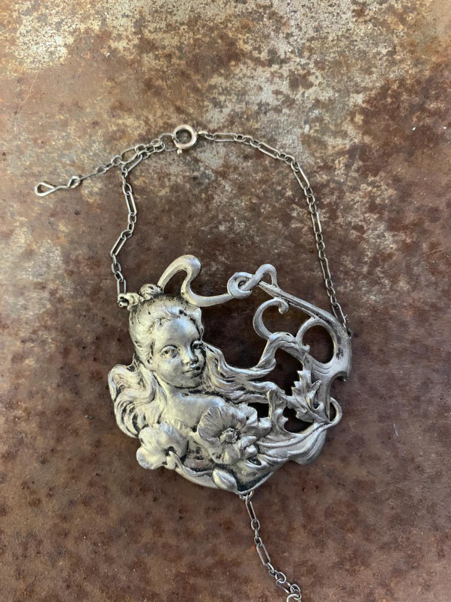 Rare art nouveau style hand jewelry piece from Paris, France. The jewelry piece is unique in that it includes a bracelet attached to a ring. It's either made of white brass or silver, it's not stamped. The bracelet and ring depict a girl with art nouveau decoration. The size of the bracelet is adjustable.
