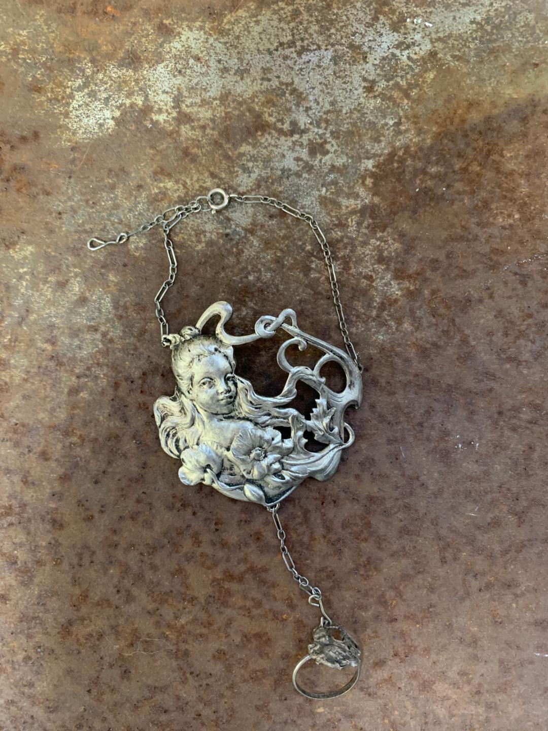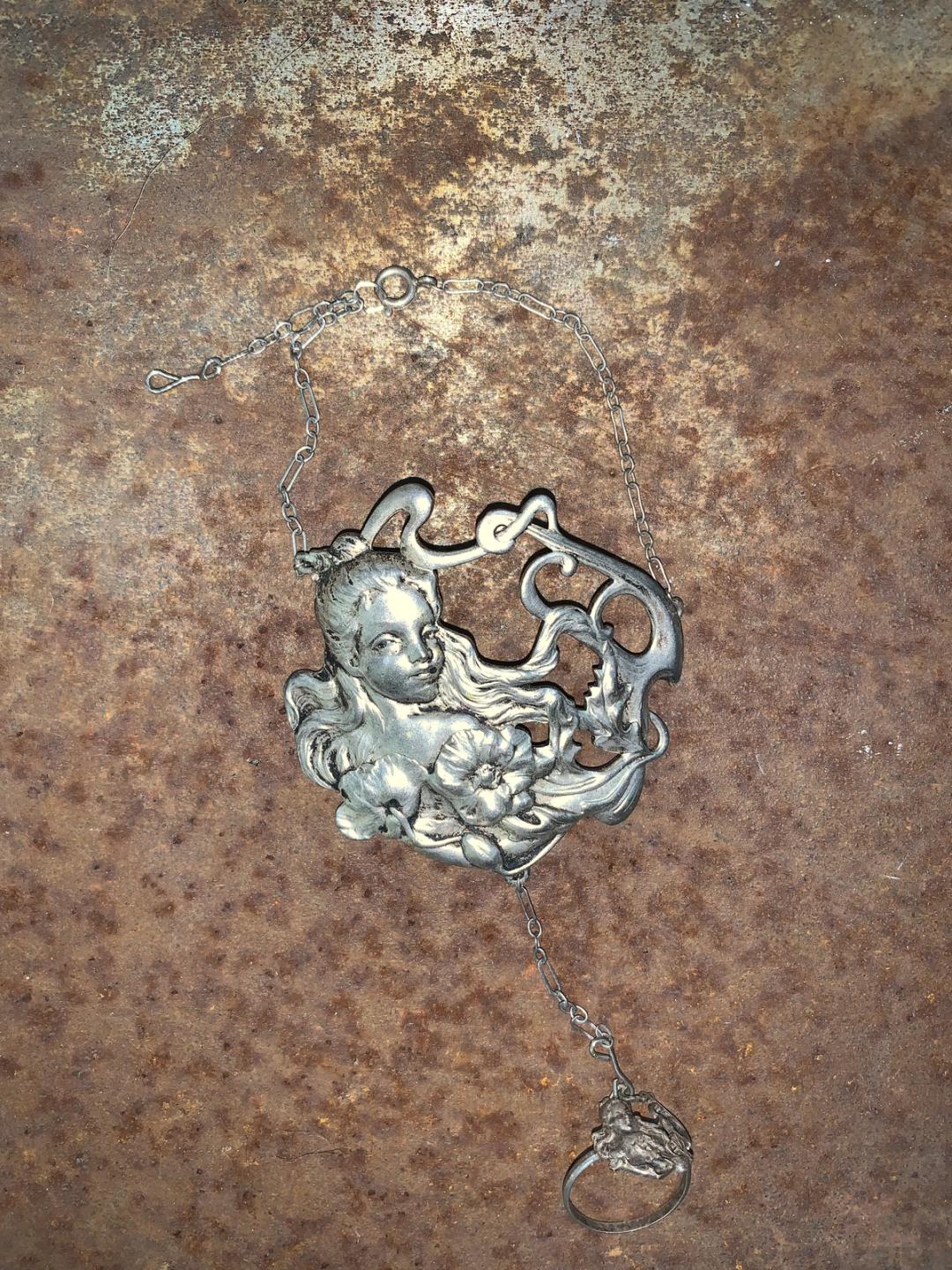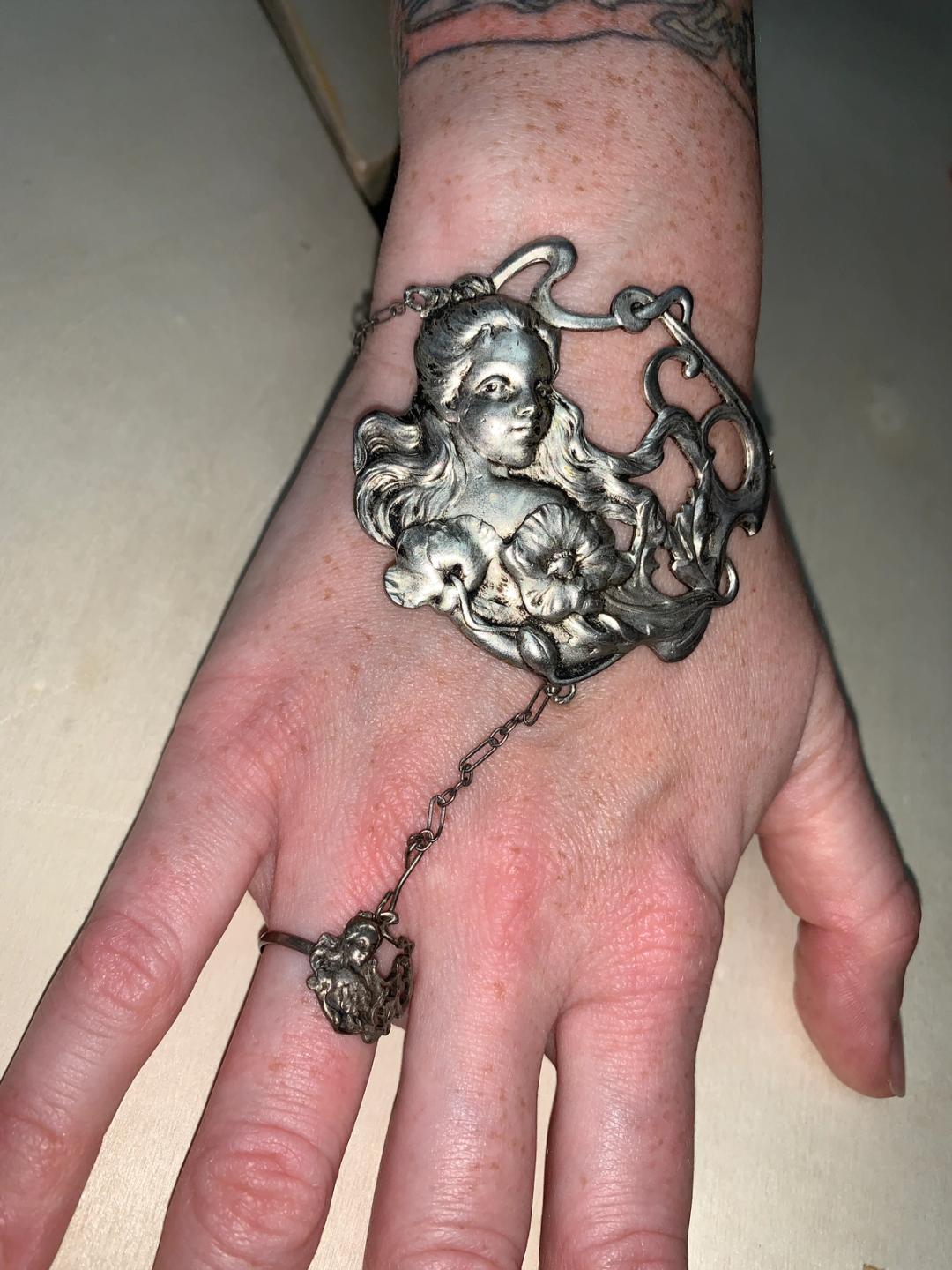 Rare art nouveau style hand jewelry piece from Paris, France. The jewelry piece is unique in that it includes a bracelet attached to a ring. It's either made of white brass or silver, it's not stamped. The bracelet and ring depict a girl with art nouveau decoration. The size of the bracelet is adjustable.
