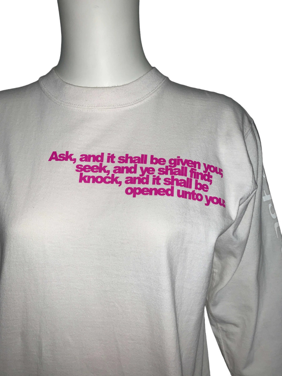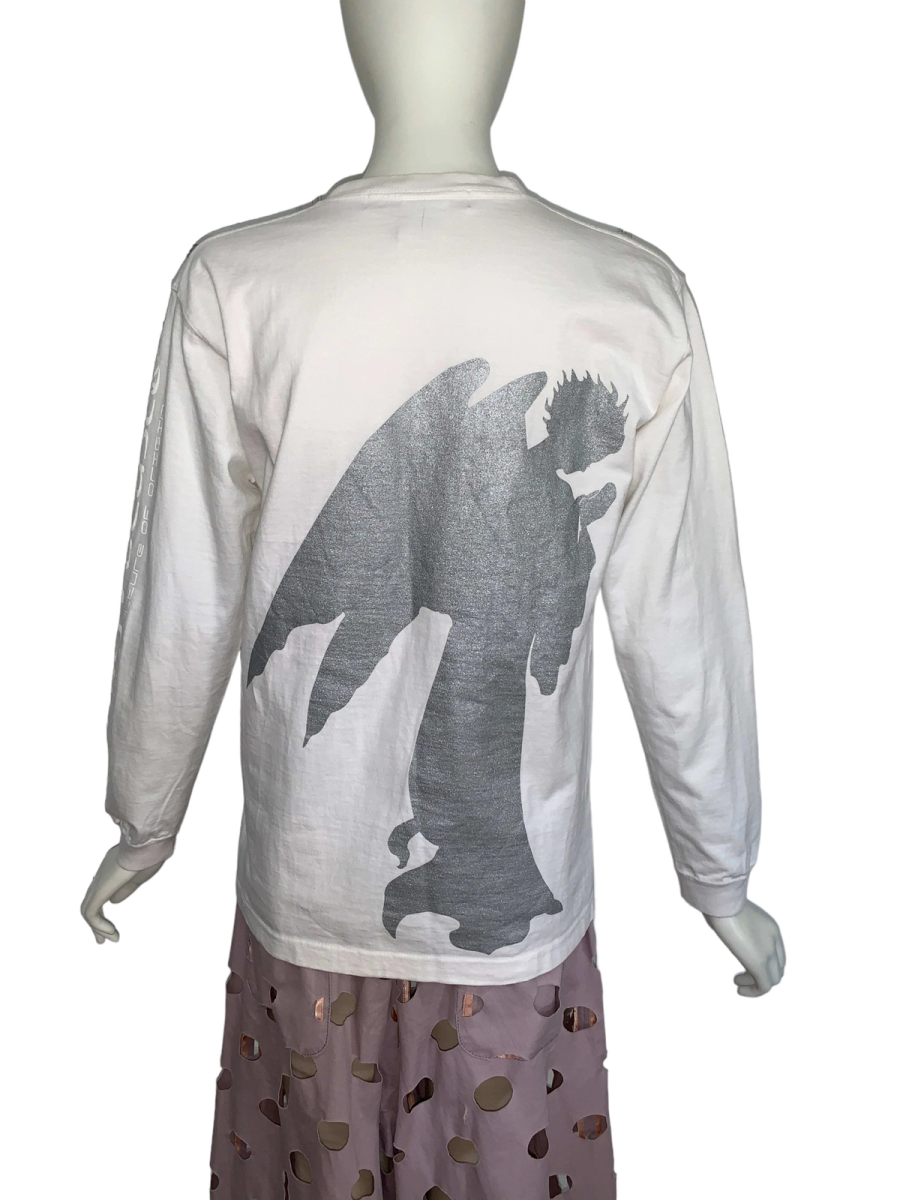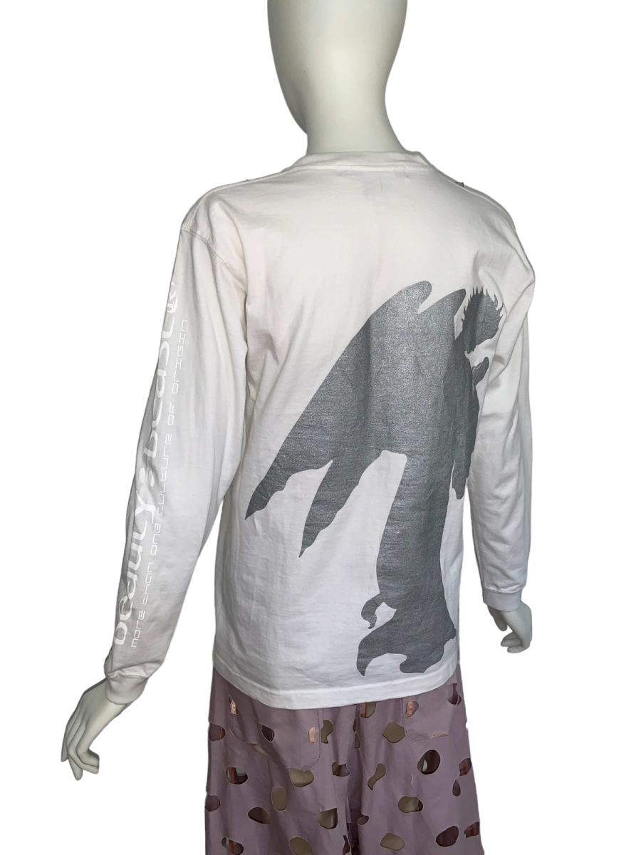 90s rare Beauty; Beast long sleeve t-shirt. The front of the t-shirt has a quote from Matthew 7:7 in the Bible: “Ask, and it shall be given you; seek, and ye shall find; knock, and it shall be opened unto you.” The back of the shirt has a sparkly angel figure. One sleeve says: "Beauty; Beast" and "More Than One Culture of Origin." The shirt has a couple of pinhole sized stains that are barely noticeable. It's in excellent vintage condition. Unisex.