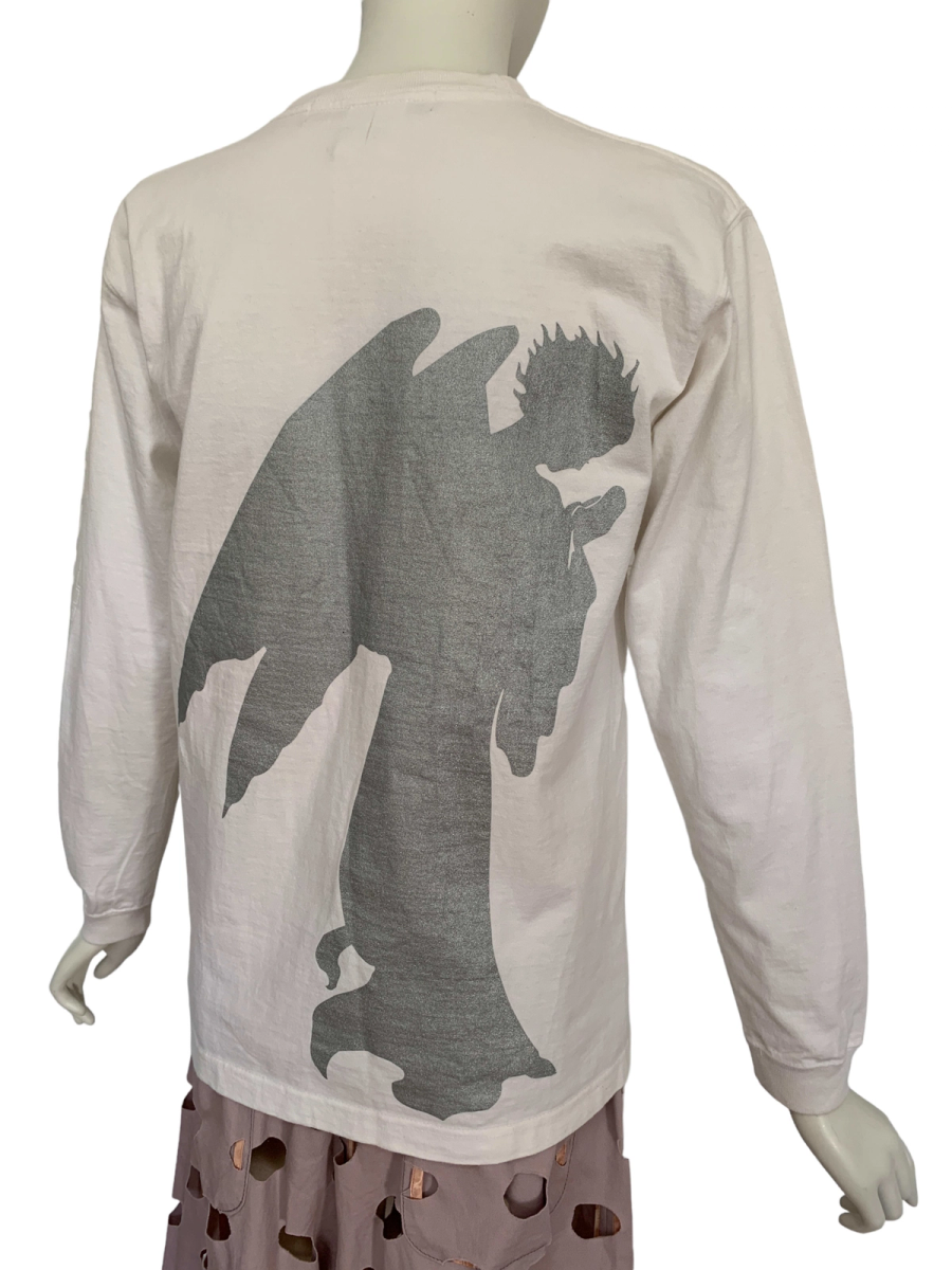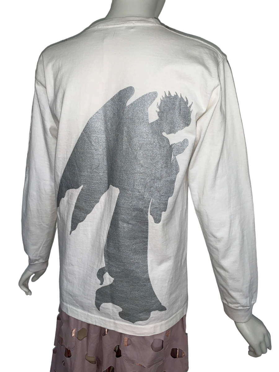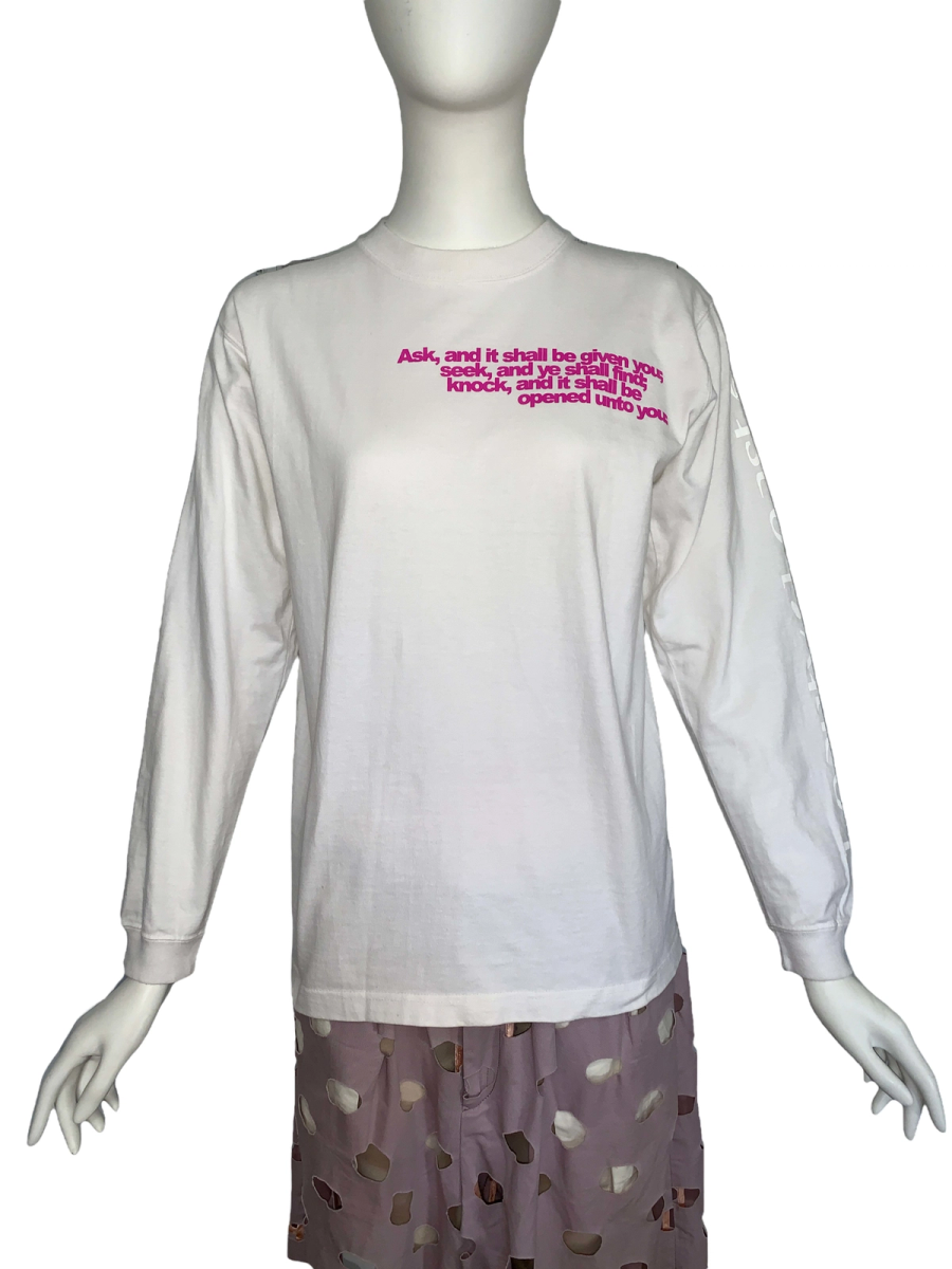 90s rare Beauty; Beast long sleeve t-shirt. The front of the t-shirt has a quote from Matthew 7:7 in the Bible: “Ask, and it shall be given you; seek, and ye shall find; knock, and it shall be opened unto you.” The back of the shirt has a sparkly angel figure. One sleeve says: "Beauty; Beast" and "More Than One Culture of Origin." The shirt has a couple of pinhole sized stains that are barely noticeable. It's in excellent vintage condition. Unisex.