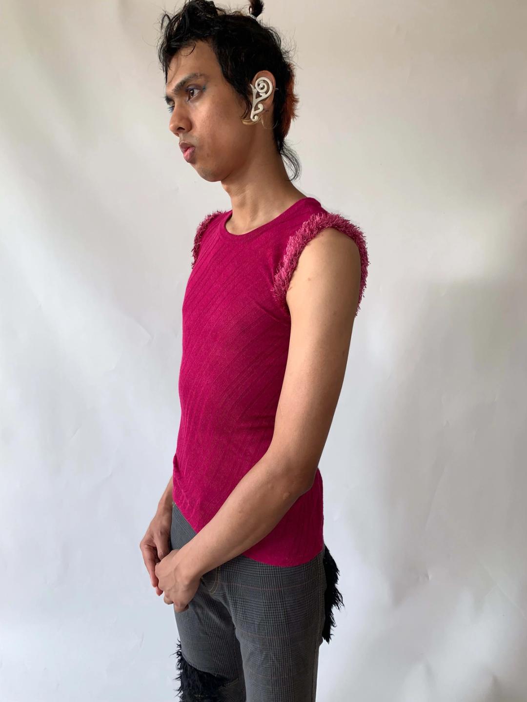 Lovely soft knit tank top by cult label, Beauty; Beast. The tank top is a lovely fuchsia color and has a diagonal ribbed texture. The sleeves of the top are made of a dramatic fuzzy knit material. Very stretchy and fitted bias cut style that makes the top quite flattering and wearable for multiple sizes.