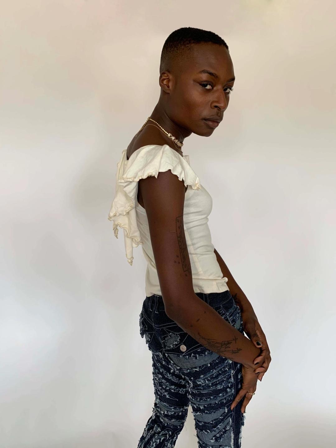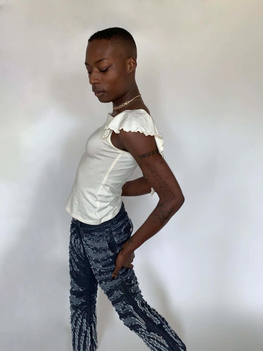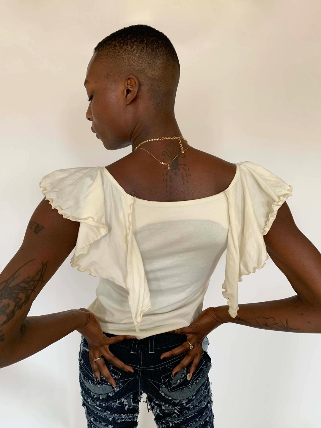 Ethereal top by cult label, Beauty: Beast. Gorgeous lettuce hem and draped fluttery "wings" that fall down the back. Fitted and stretchy. Presumably from the early 00s. Marked a size medium. 100% cotton.