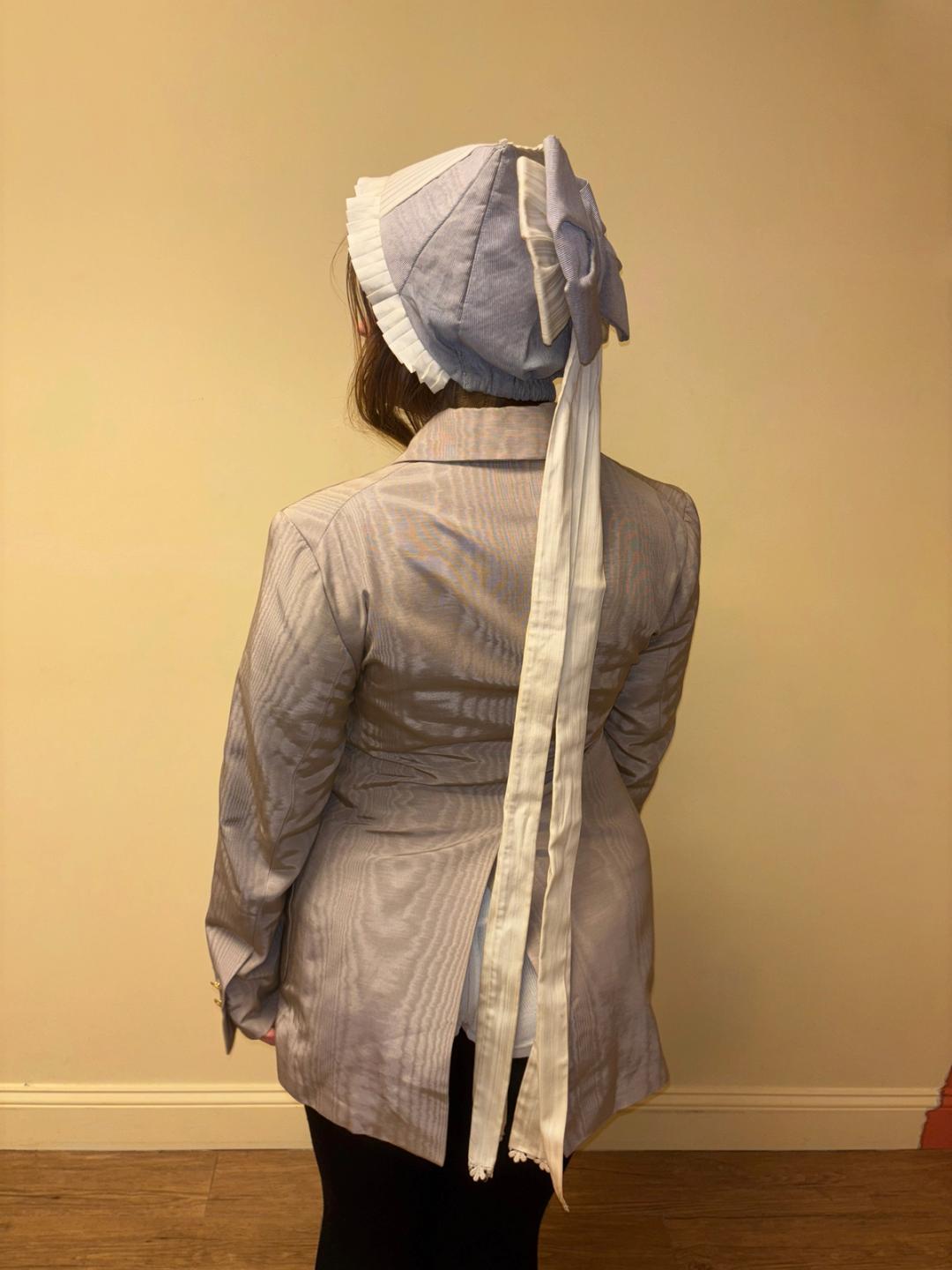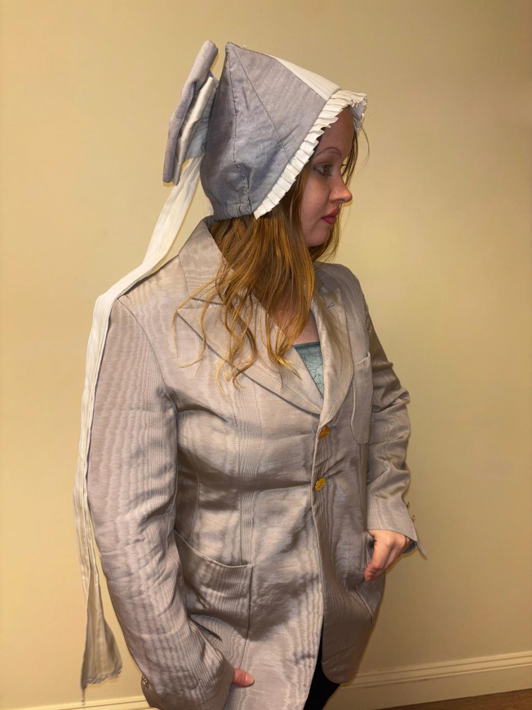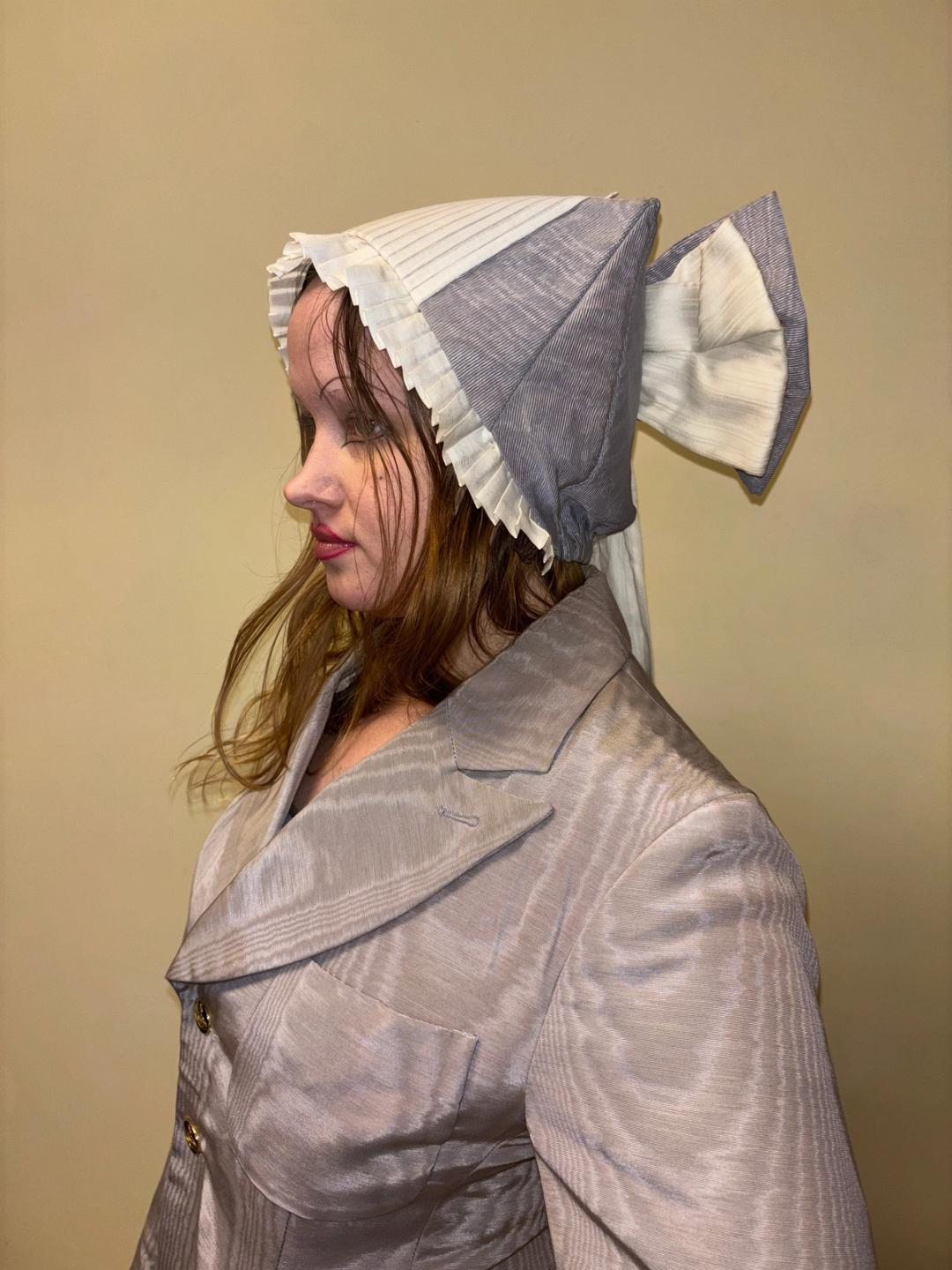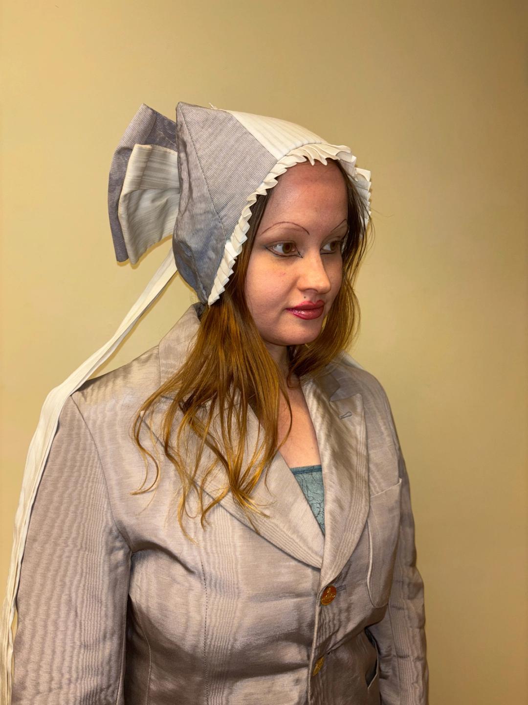 Unusual hat originally from the Berlin Opera House. The hat looks like it's perhaps based on a provincial style design. It has a large dramatic bow flowing down the back and pleated white fabric down the middle and framing the face. One size fits most.