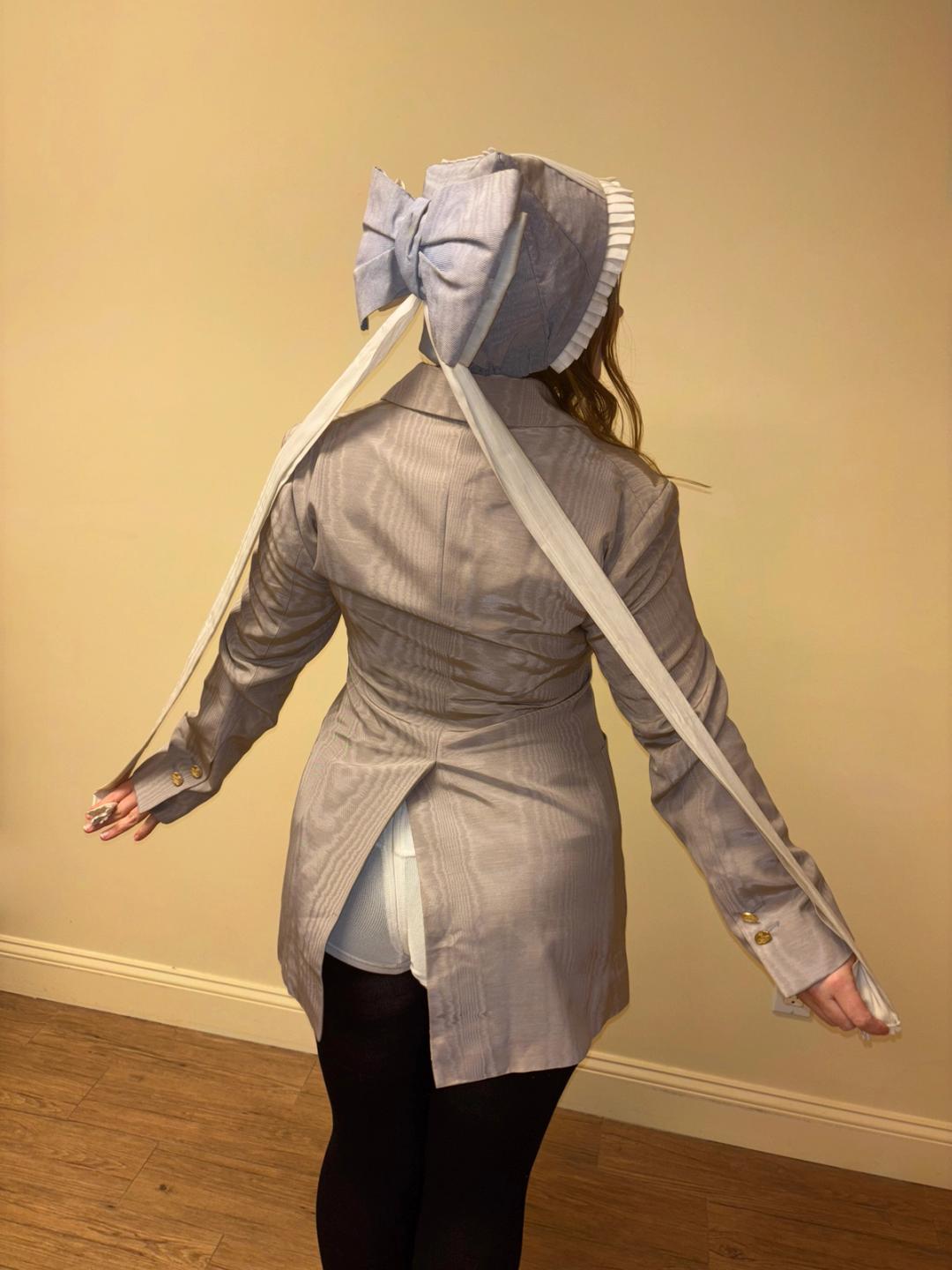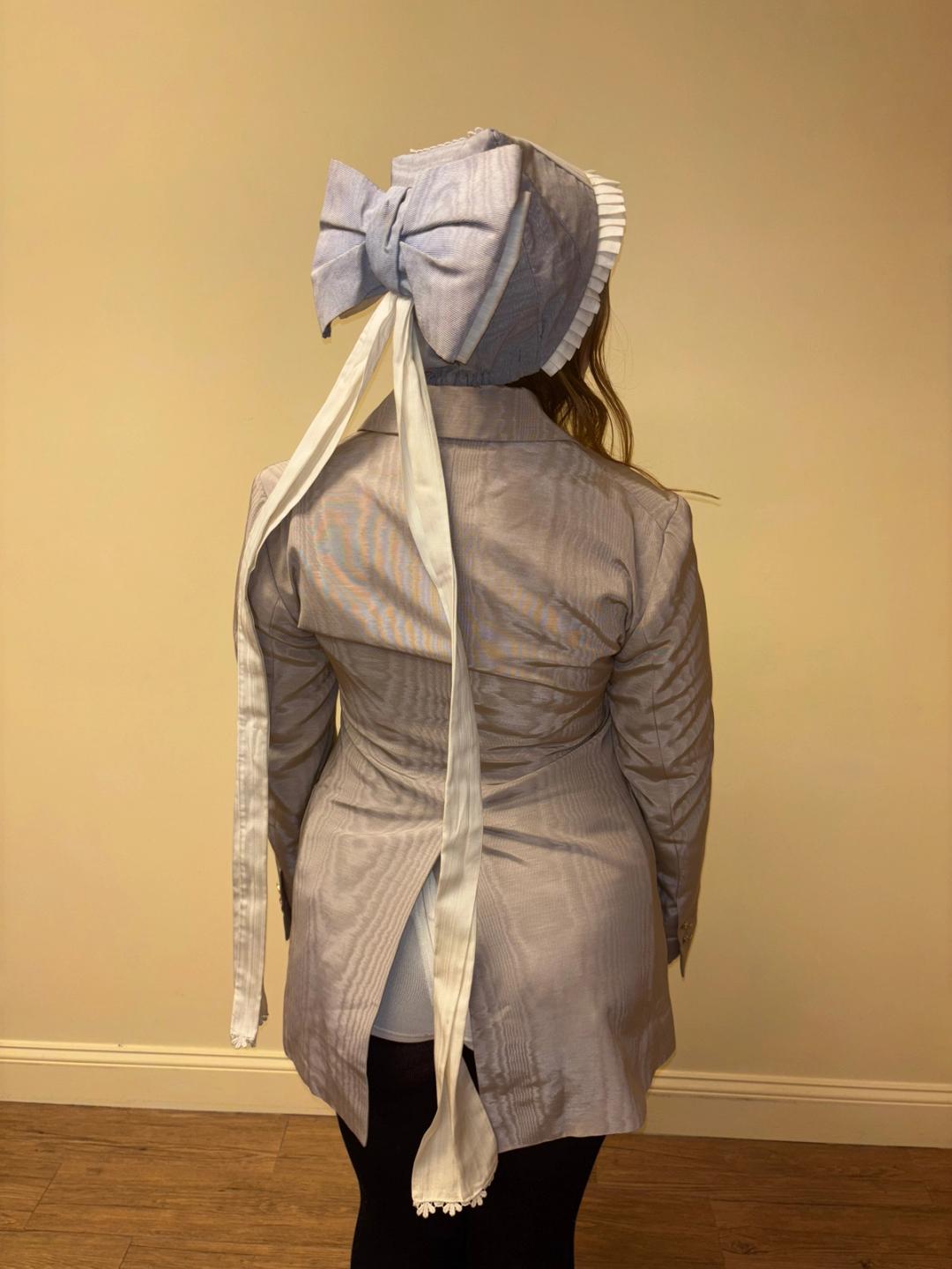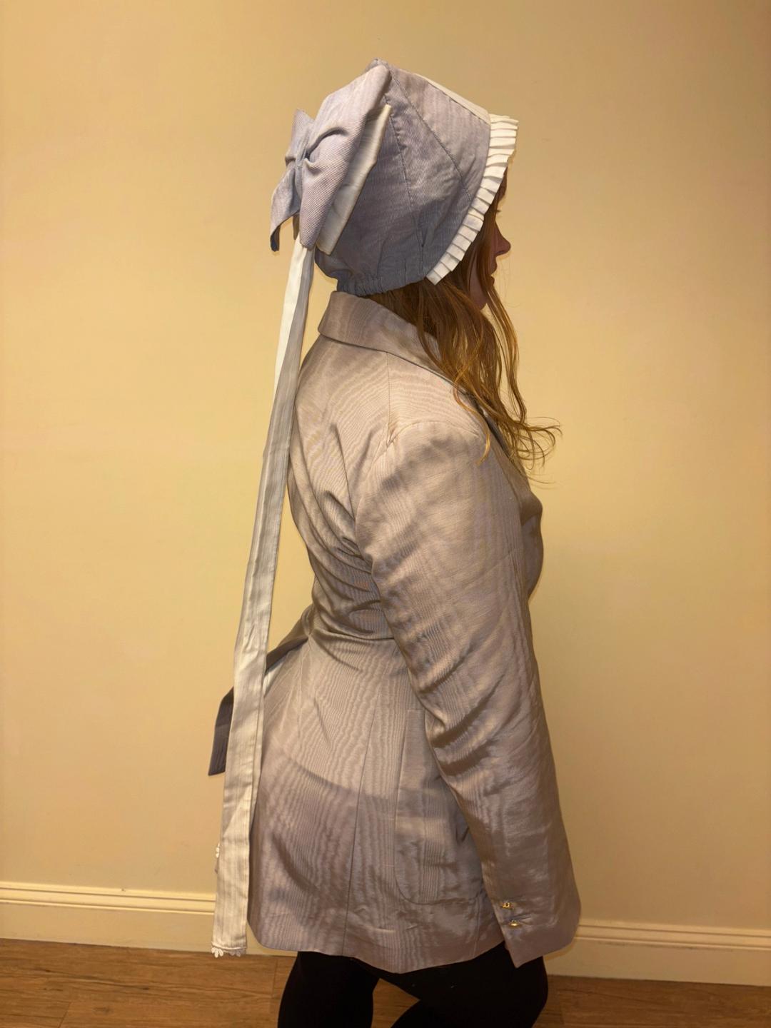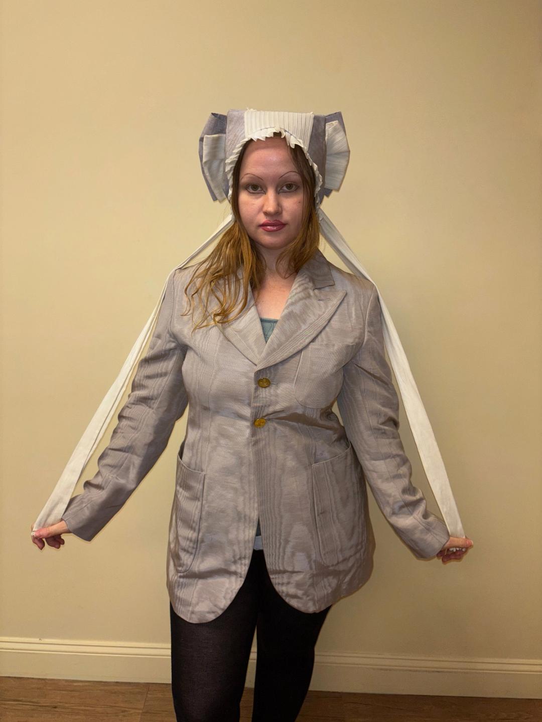 Unusual hat originally from the Berlin Opera House. The hat looks like it's perhaps based on a provincial style design. It has a large dramatic bow flowing down the back and pleated white fabric down the middle and framing the face. One size fits most.