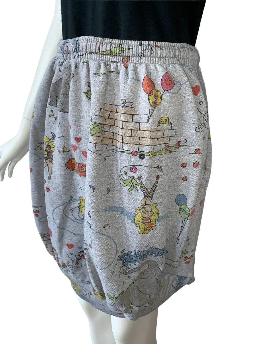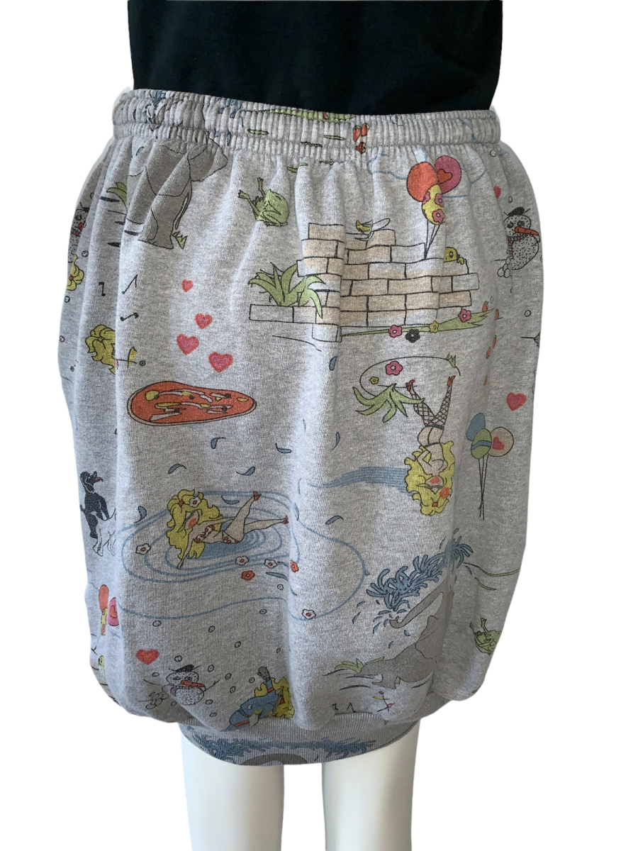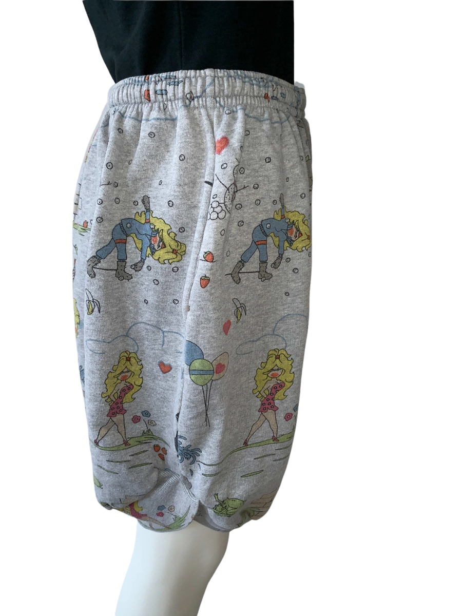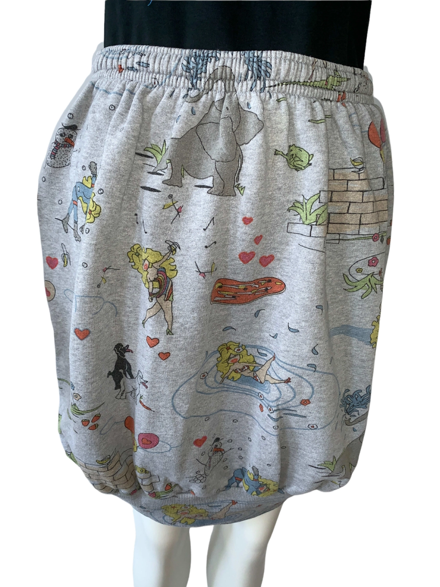 Vintage Bernhard Willhelm sweatshirt skirt with allover blonde bimbo girl print, she is seen doing various activities! It has a voluminous bubble cut. The waistband is drawstring and elasticated, it could work for multiple sizes. It also has pockets and a draped side design. 100% cotton, marked size M.