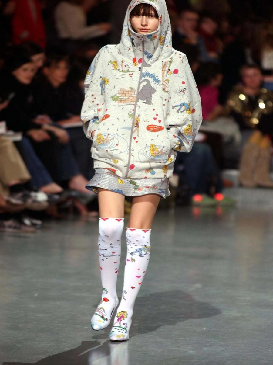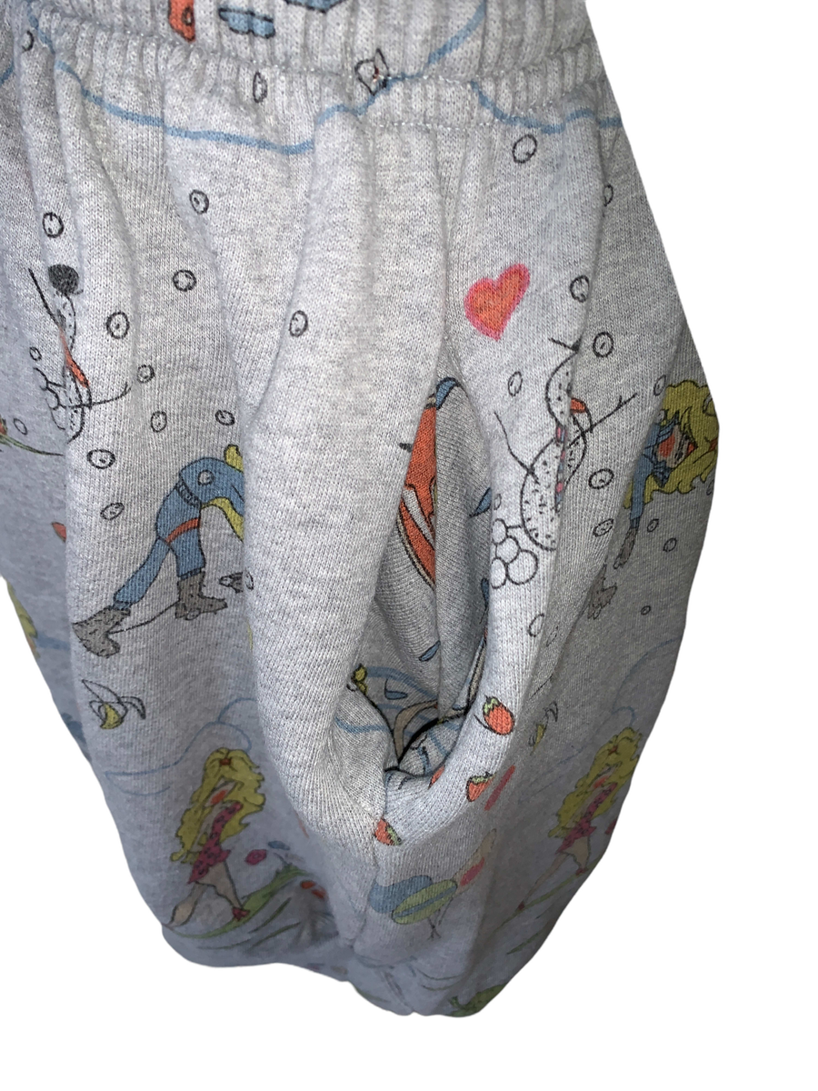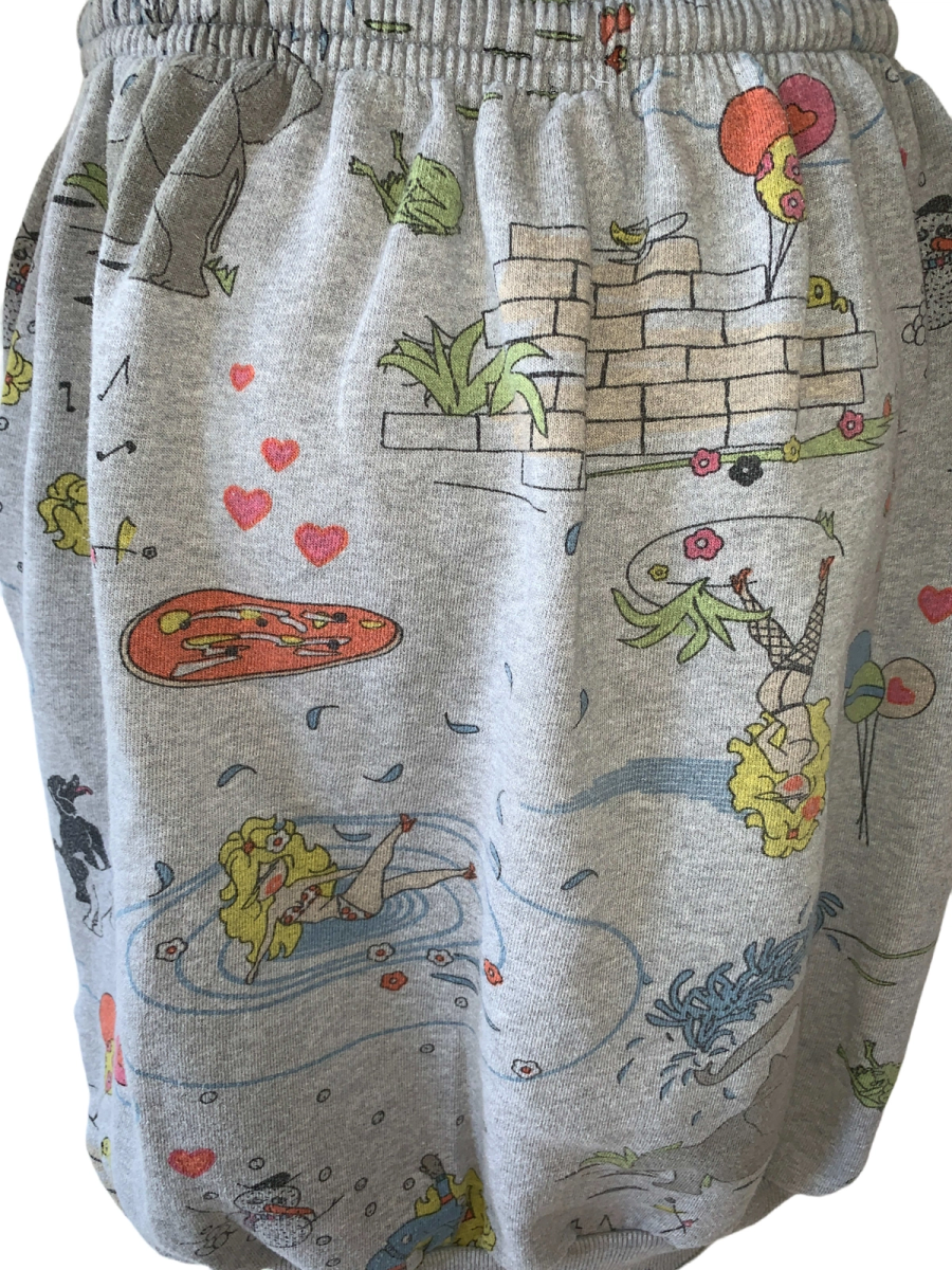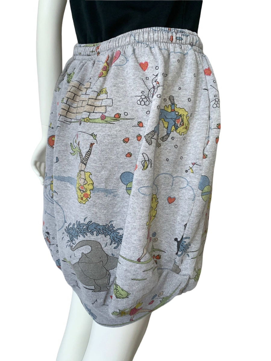 Vintage Bernhard Willhelm sweatshirt skirt with allover blonde bimbo girl print, she is seen doing various activities! It has a voluminous bubble cut. The waistband is drawstring and elasticated, it could work for multiple sizes. It also has pockets and a draped side design. 100% cotton, marked size M.