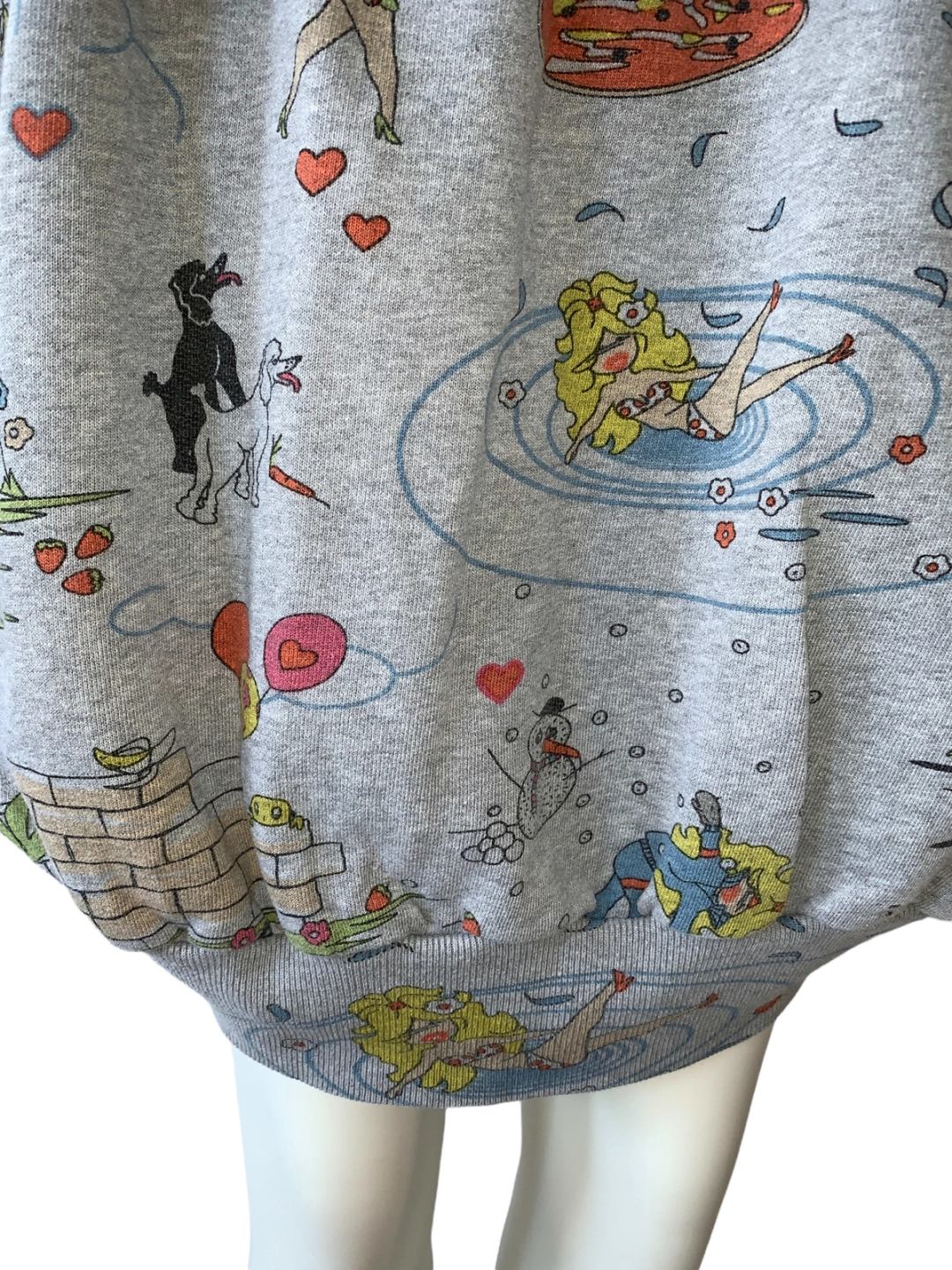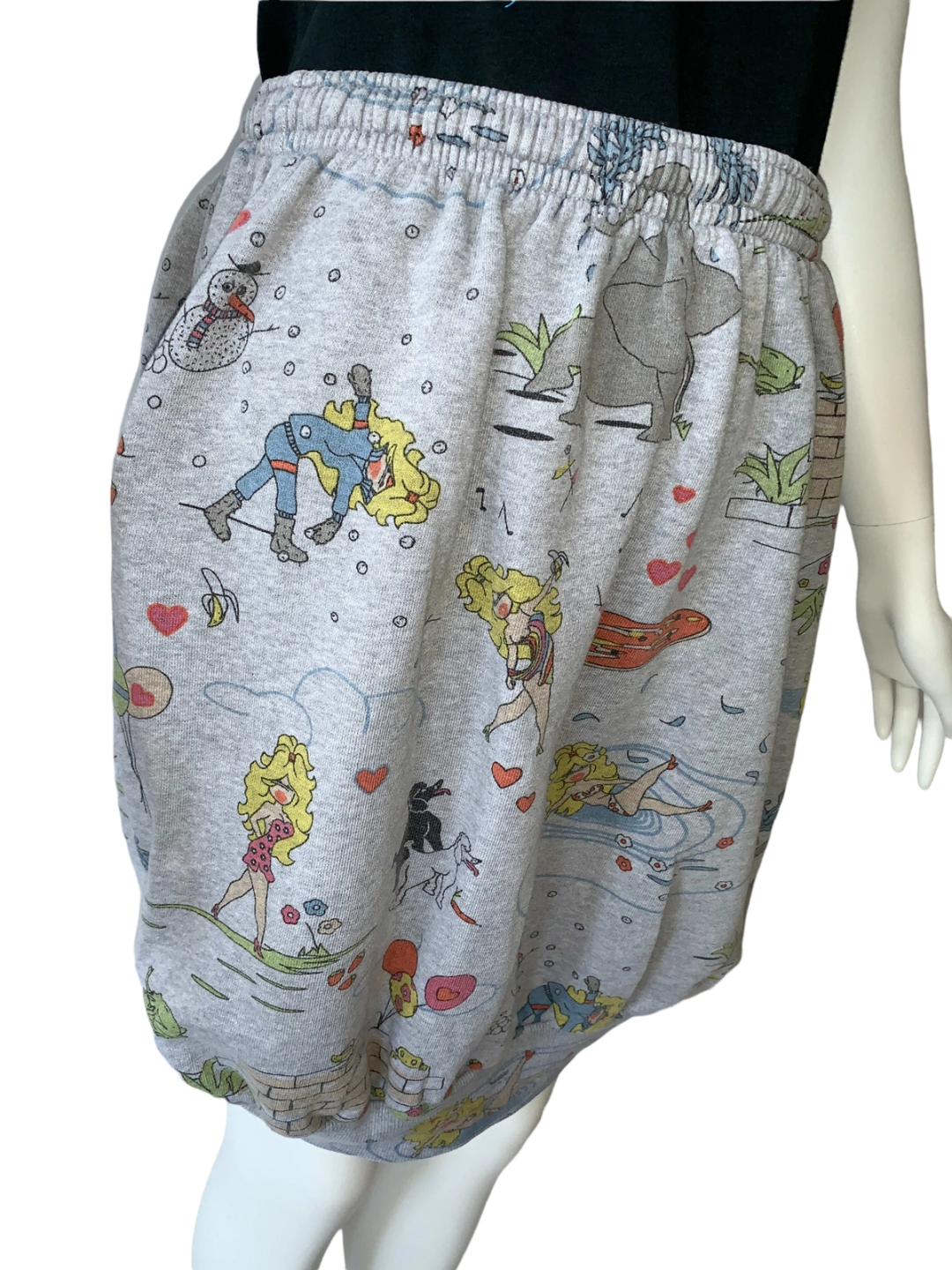 Vintage Bernhard Willhelm sweatshirt skirt with allover blonde bimbo girl print, she is seen doing various activities! It has a voluminous bubble cut. The waistband is drawstring and elasticated, it could work for multiple sizes. It also has pockets and a draped side design. 100% cotton, marked size M.